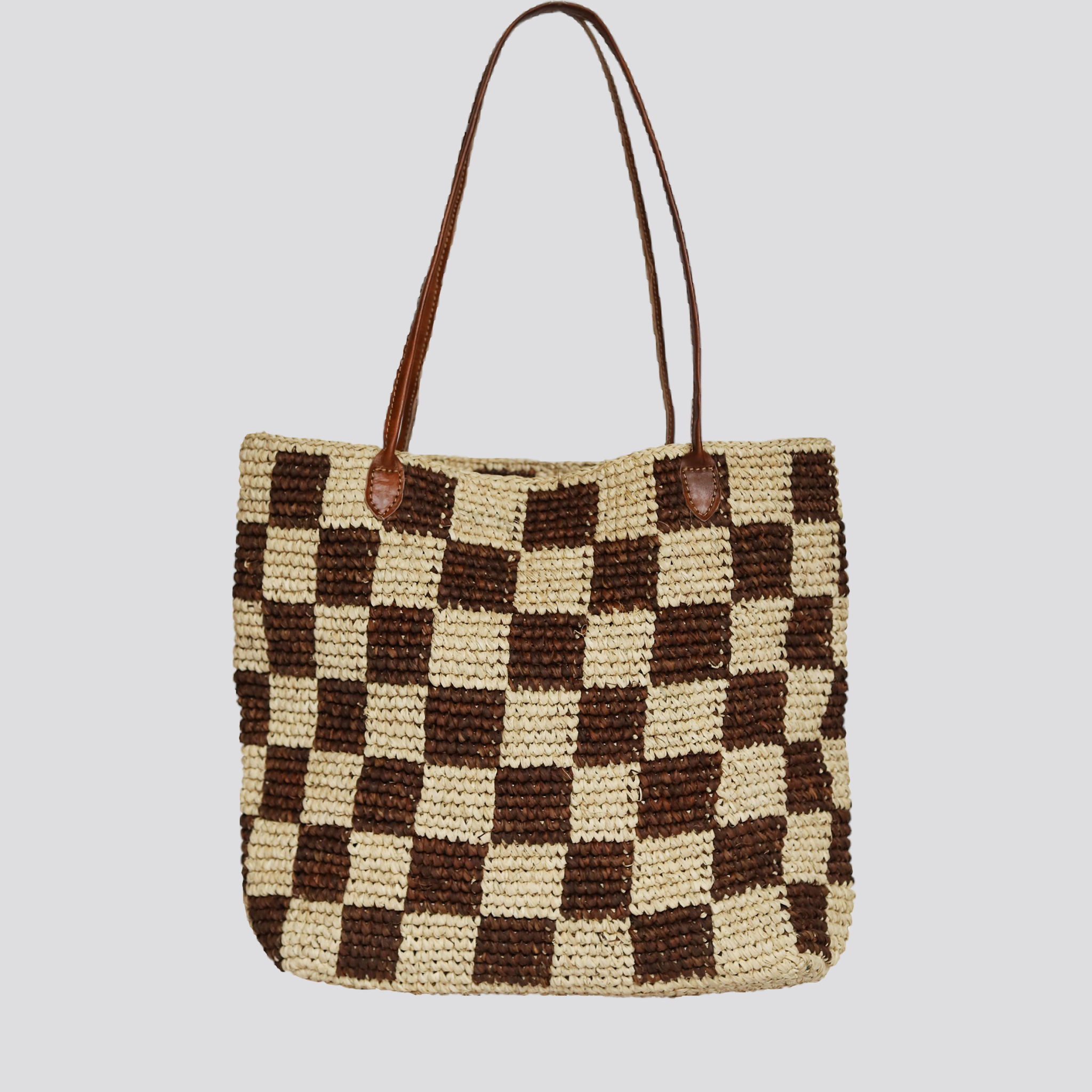 The perfect summer tote. Our take on a retro crochet marries old world craftsmanship with a modern check pattern. Two leather straps sit comfortably on your shoulders. Thick woven raffia keeps the sand out of your belongings. An interior leather base maintains its shape even with your oversized water bottle and summer library. Fits a towel and everything you need to get outside and enjoy some sunshine. Woven raffia, leather straps and inner base. Handwoven in Bali. Size: 15”x13”x6”. Strap Drop: 12”. Color: Brown Check.