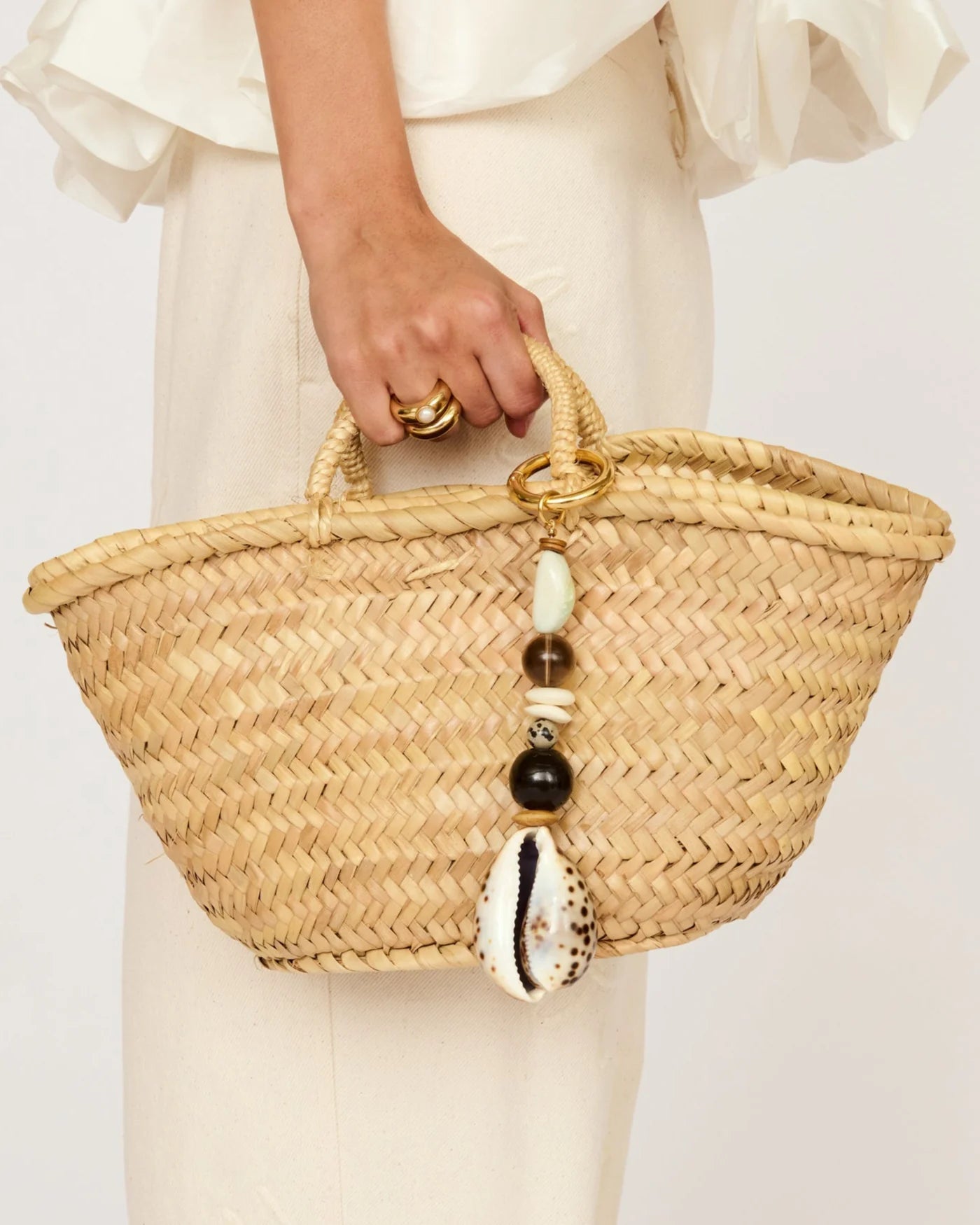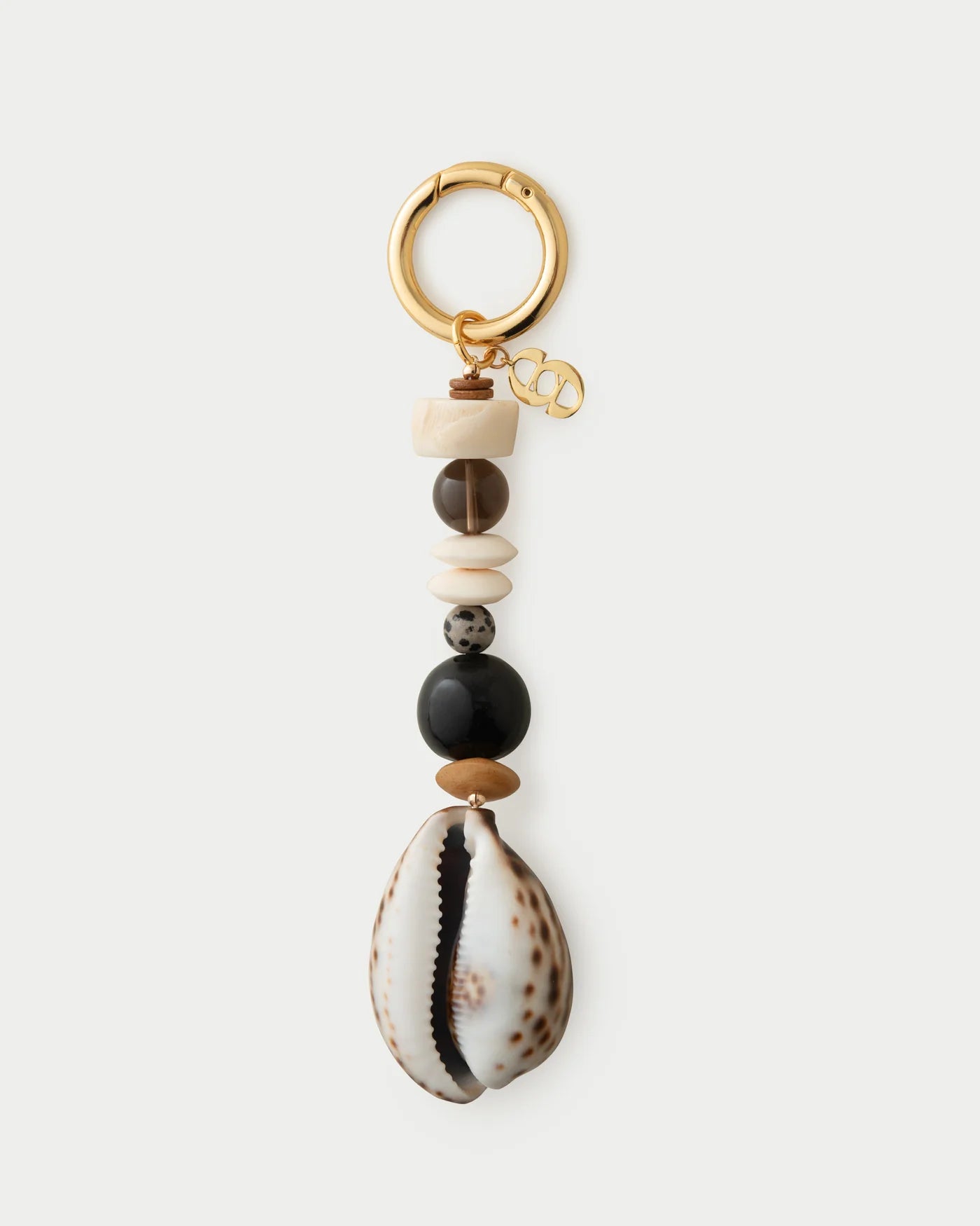 Our Cypra bag charm is made from upcycled beads and shells from previous seasons, giving new life to some of our favorite materials. This versatile accessory can also be worn as a key chain or bag charm and is composed of a natural tiger cowrie shell, kazuri beads, bone, dalmatian jasper, smokey quartz and ceramic beads on an oversized key ring.