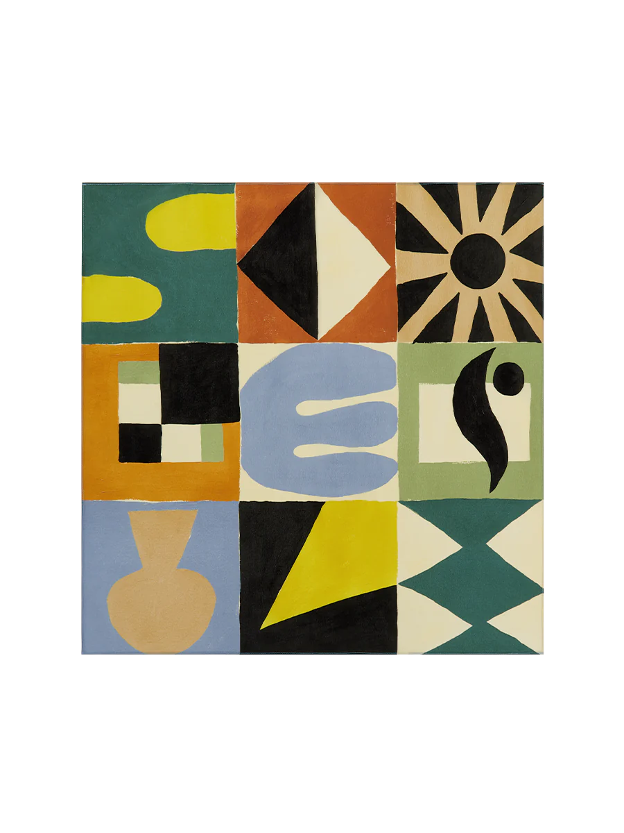 Hand-painted in gouache, ‘Namesake’ depicts abstracted, geometric letter forms in a vibrant palette on lustrous silk crepe de chine.