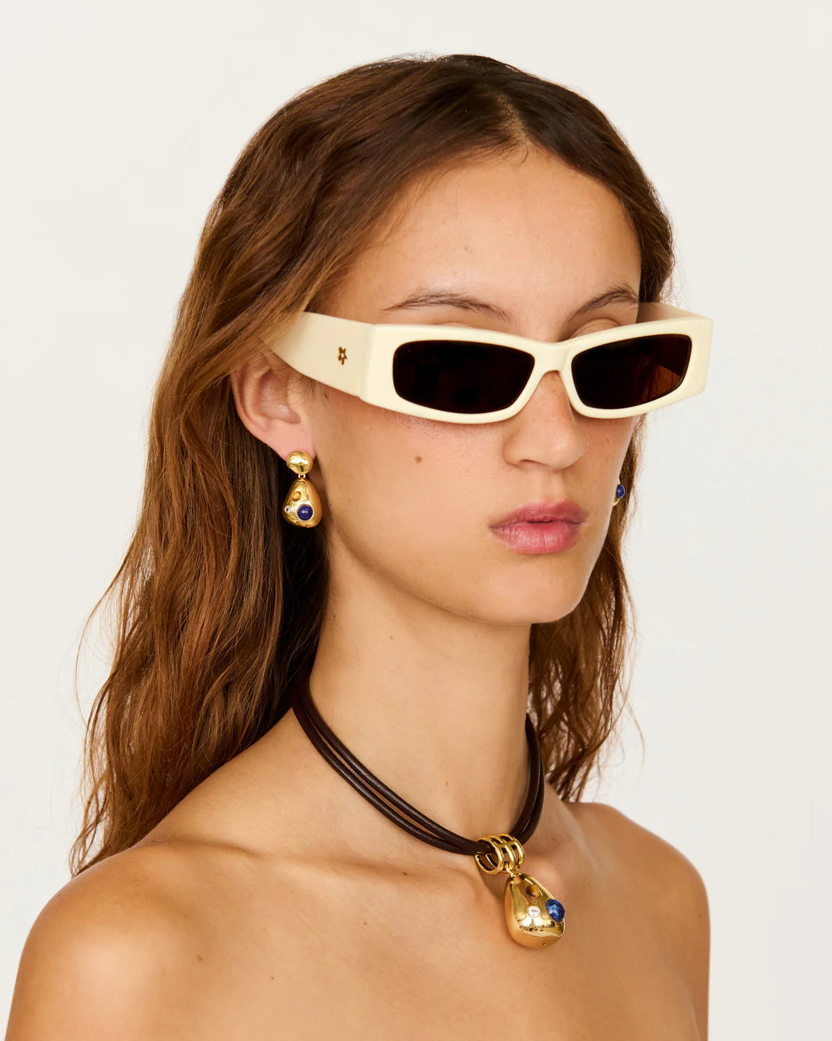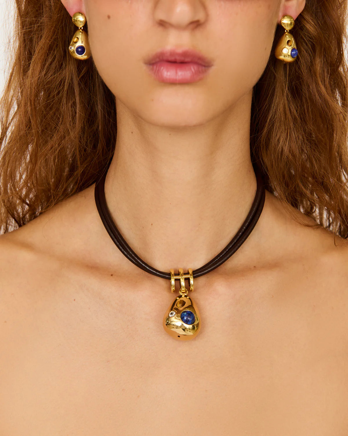 Our Noemia necklace is composed of a gold plated pendant adorned with lapis lazuli, cubic zirconia and tiger eye on an adjustable black leather necklace. This special piece was designed to be worn closer to the neckline as a bolder statement piece.