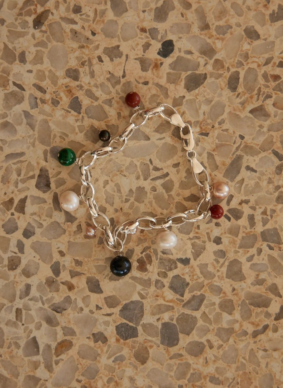 Freshwater pearls, malachite, and jasper stones
