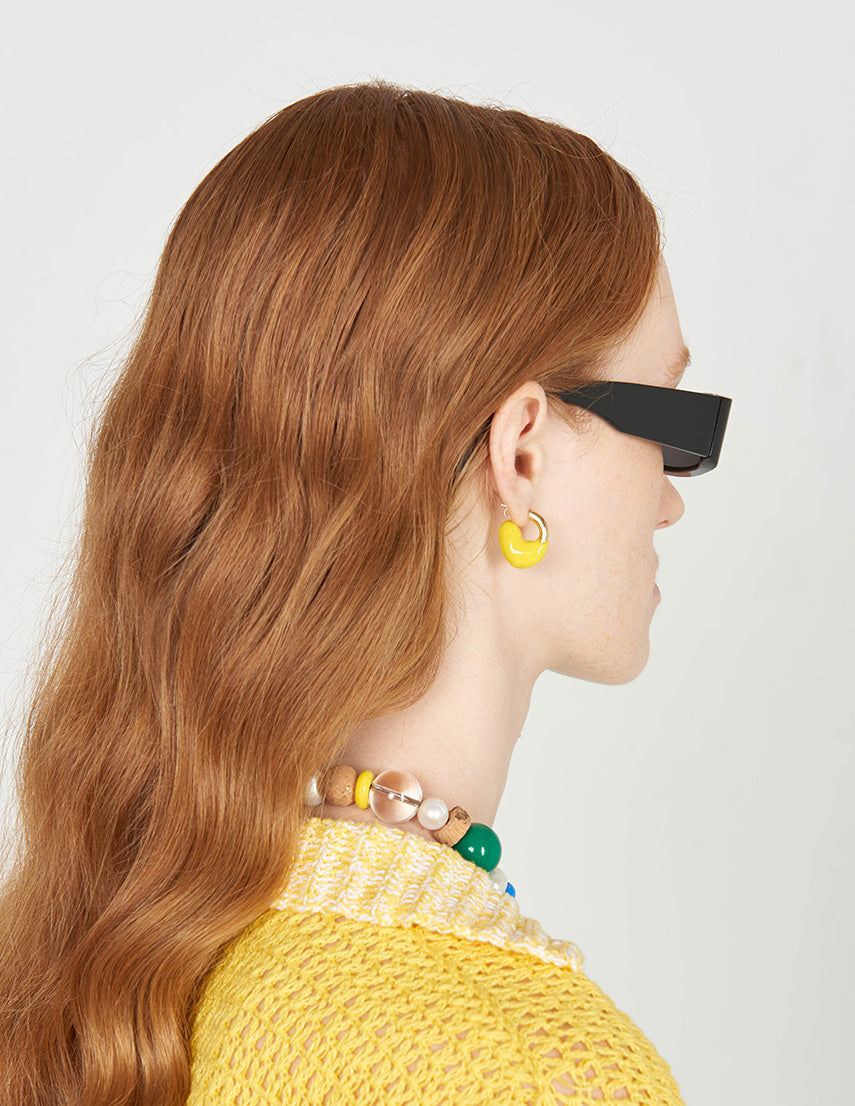 Éliou's Theo earrings are a modern take on classic gold hoops. Dipped in resin, they boast dynamic color and shape. Incredibly light-weight and heavily gold-plated, they can be worn daily without ever weighing you down. slight variations due to the individuality of each piece.