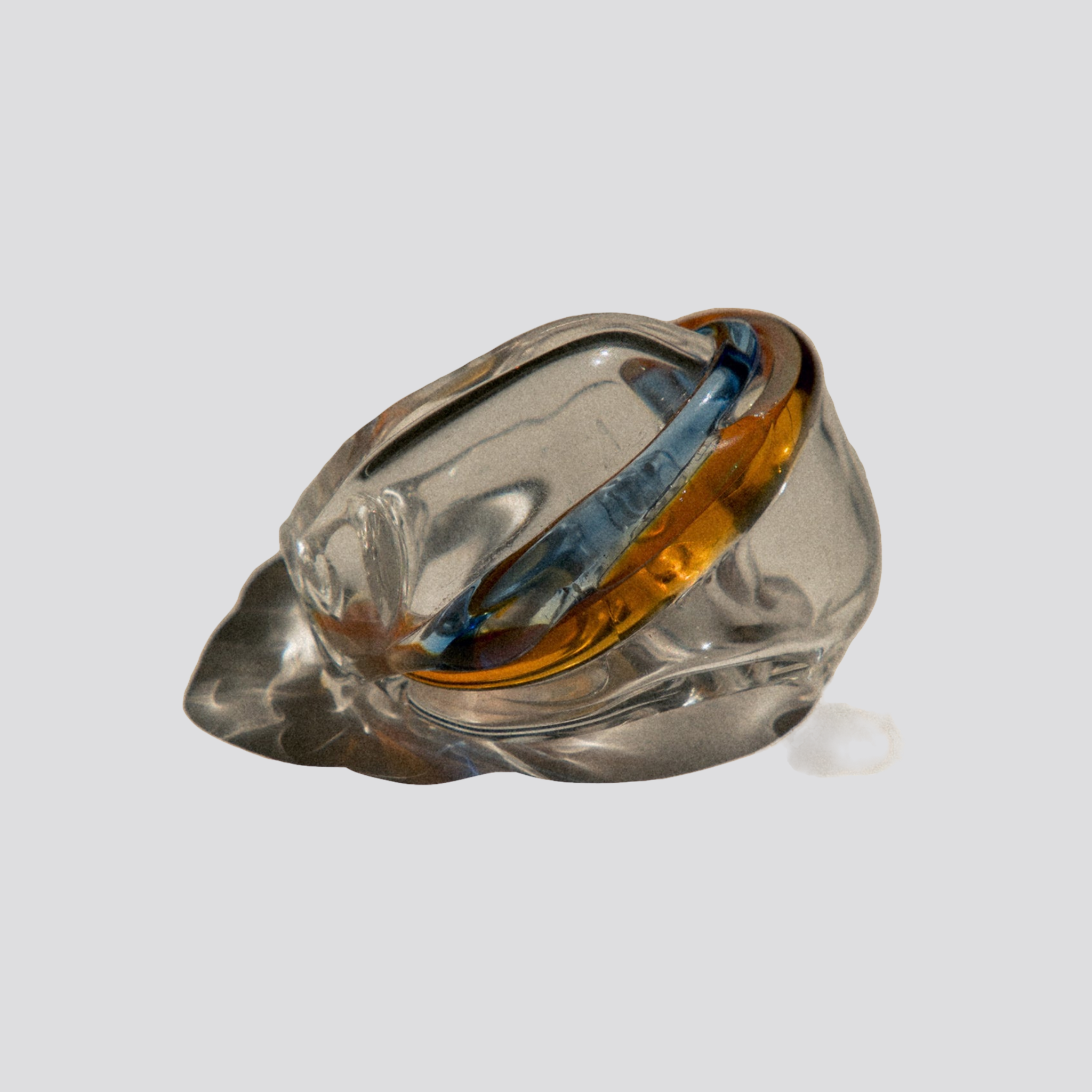 This unique ring was designed by Julieta Cajal and handcrafted in Spain. It is made of blown glass with brown and blue details. The ring is size 7.5 and the color is brillantor.