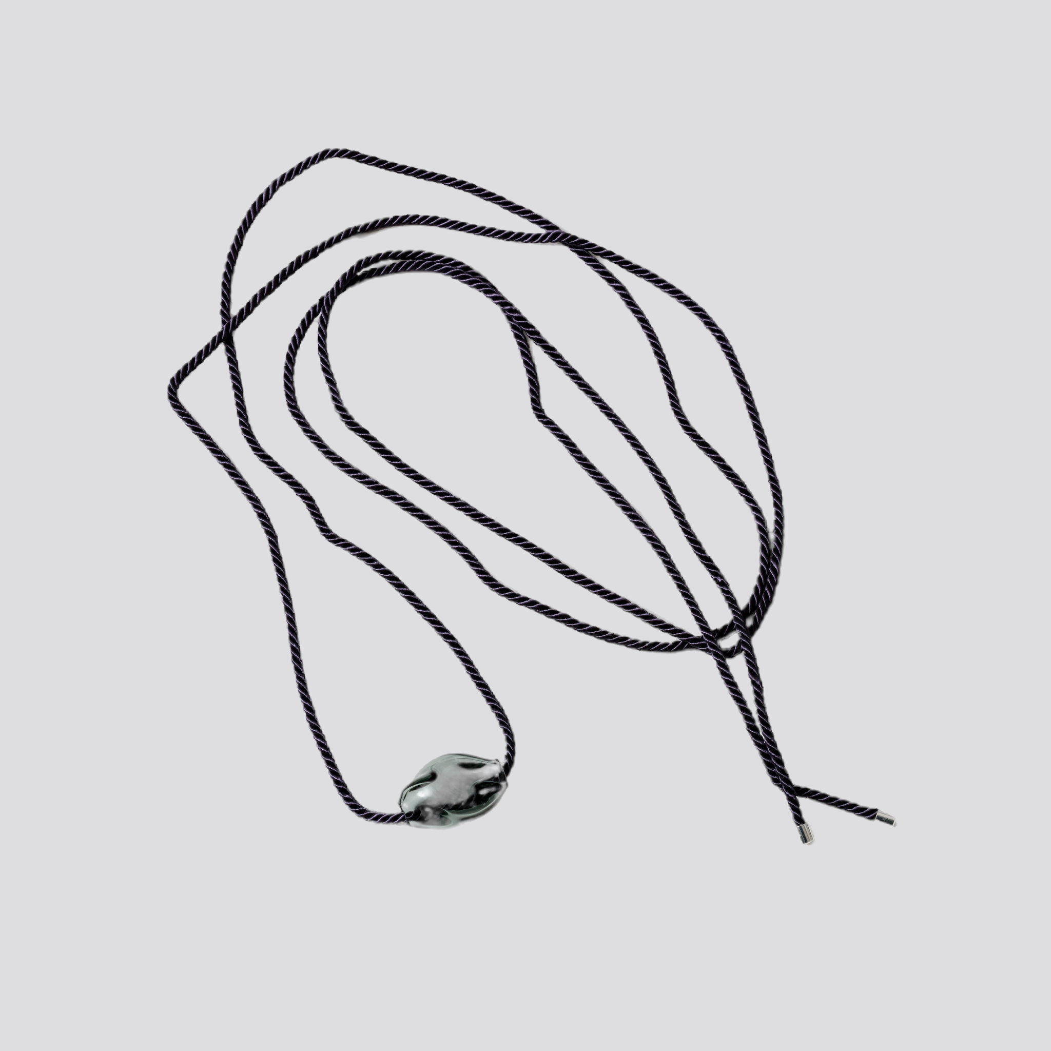 This unique belt features a hand-blown glass bead, which may vary in shape and size. The glass bead is blown by Vancouver-based artist Joanne Andrighetti, making each belt one-of-a-kind. The nylon cord is 70" long.