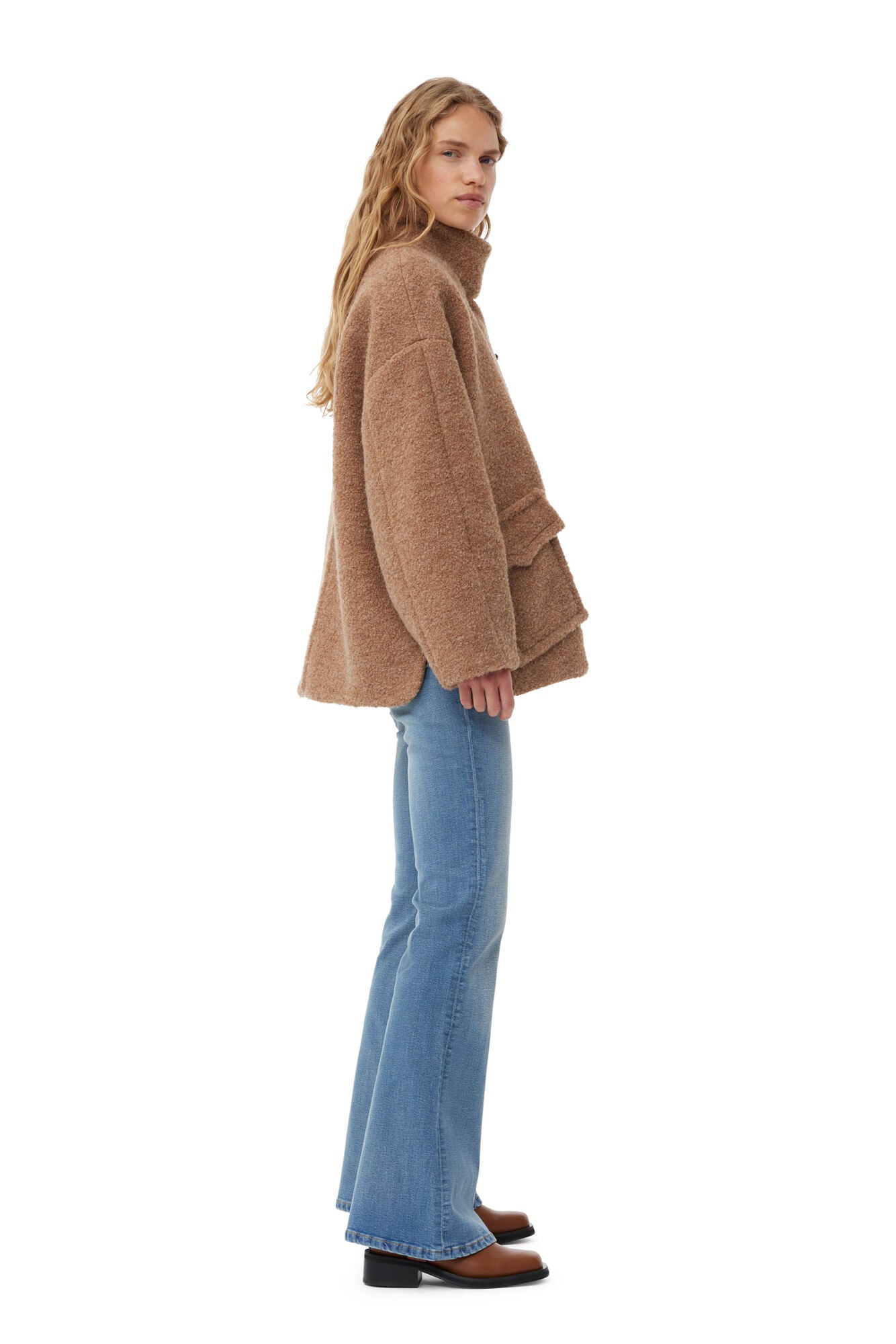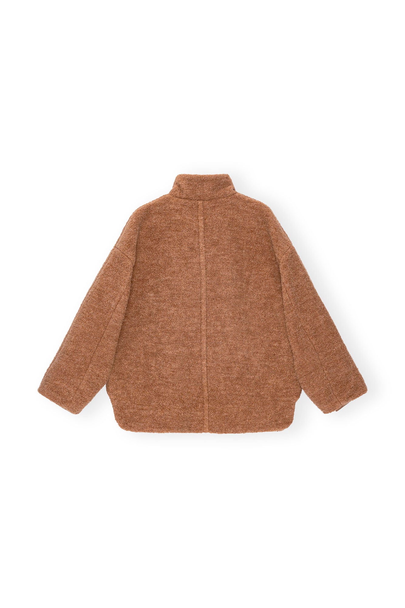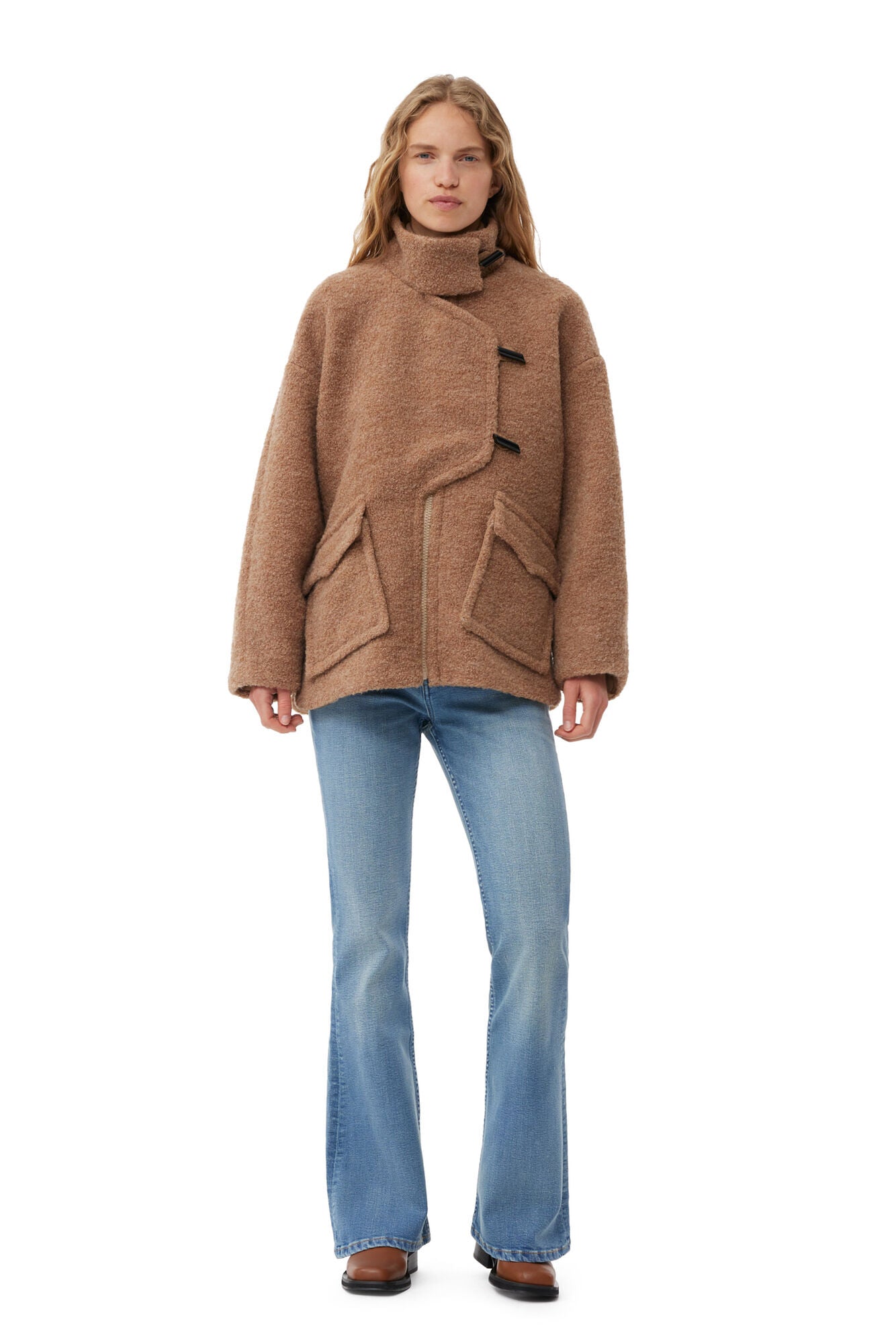 This Brown Boucle Wool Jacket is made from recycled wool and recycled polyester. The jacket is designed for an oversized fit and features dropped shoulders, toggle buttons, asymmetrical closing and patch pockets with a snap button closure.