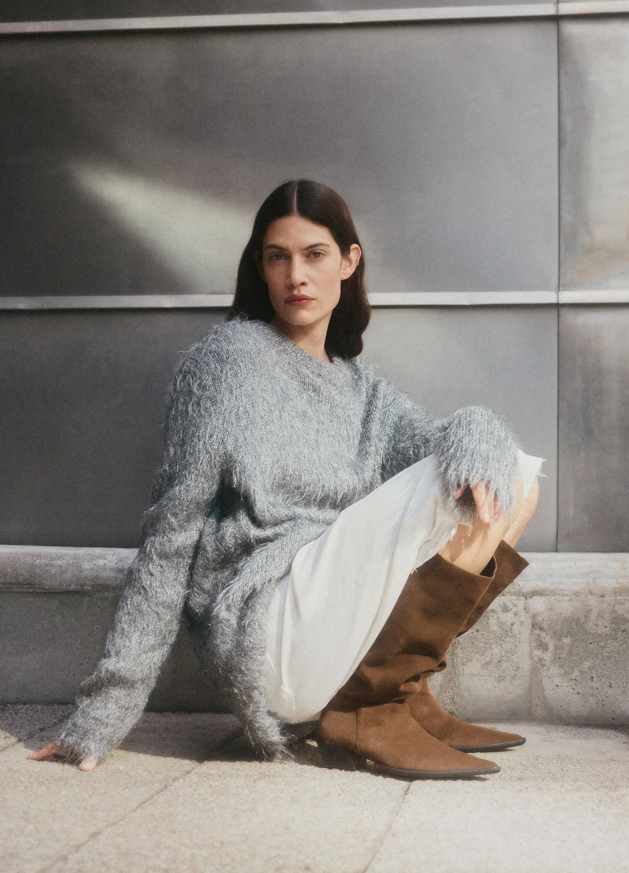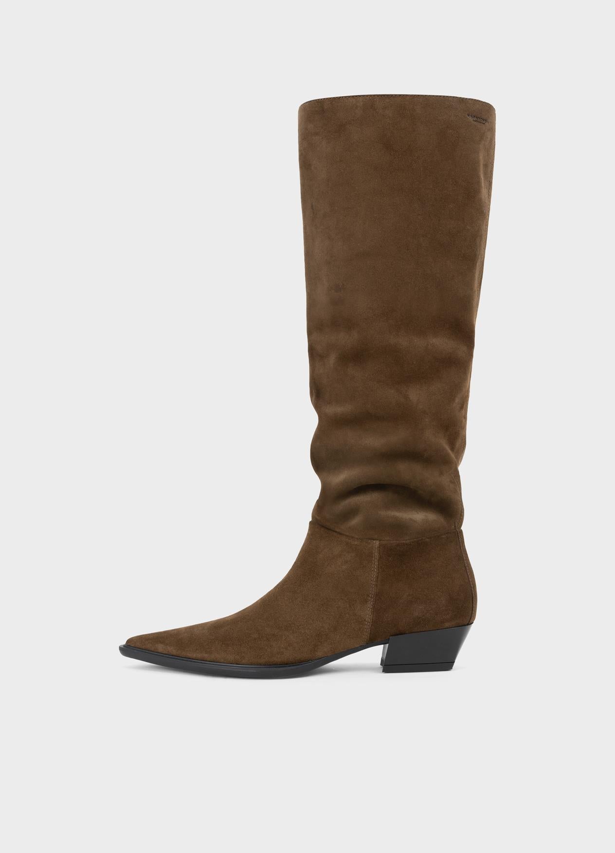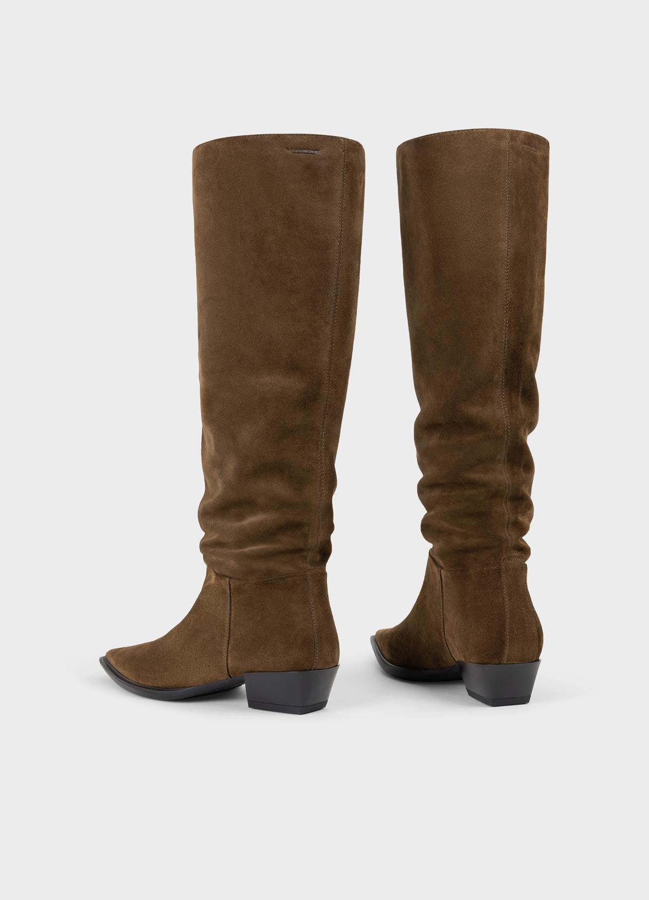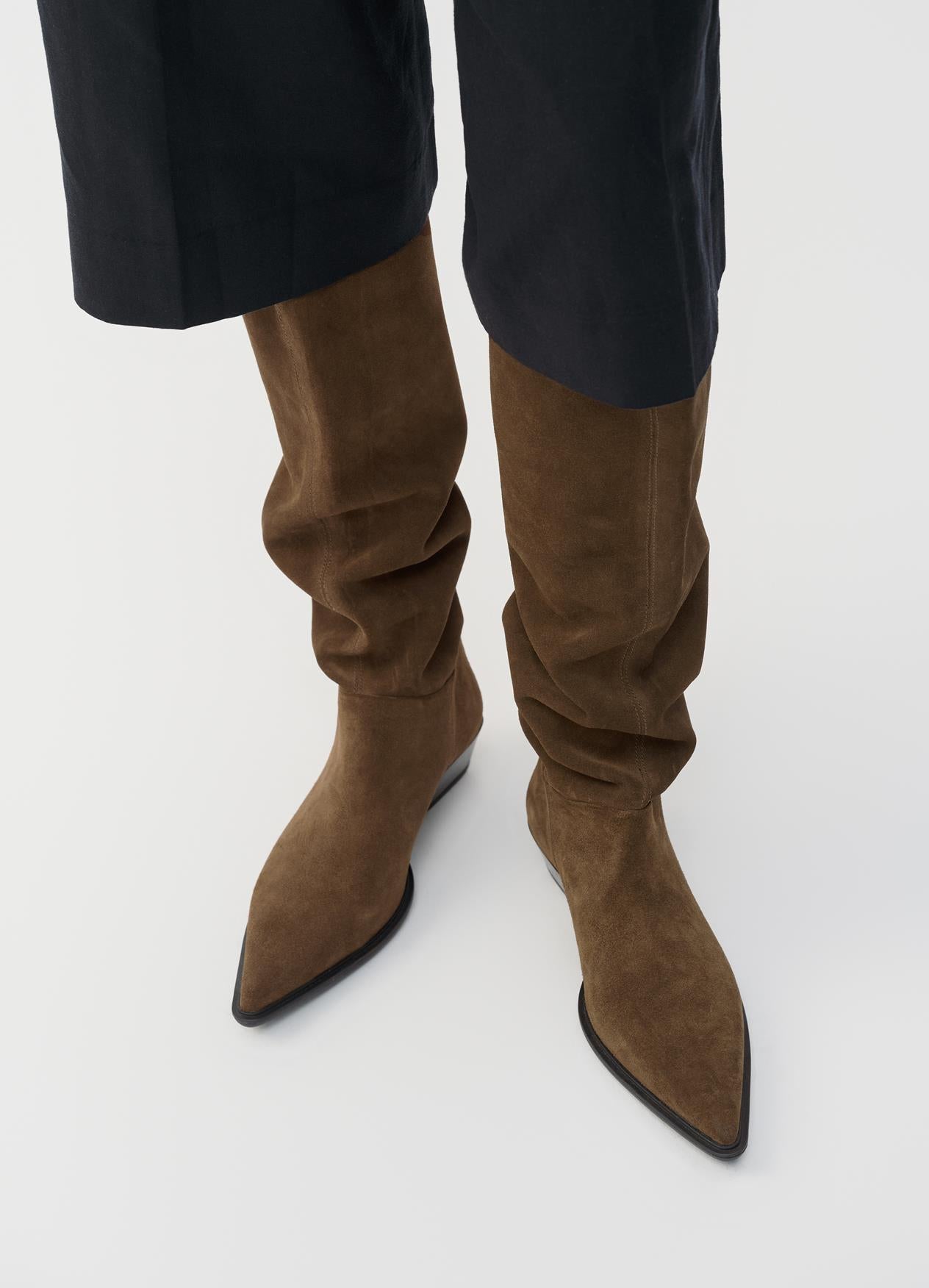 Cassie is the minimalistic tall boots with a sophisticated look. The style is crafted from brown suede with a pointed-toe shape and scrunchy pull-on shaft. The slanted heels measure 40mm.