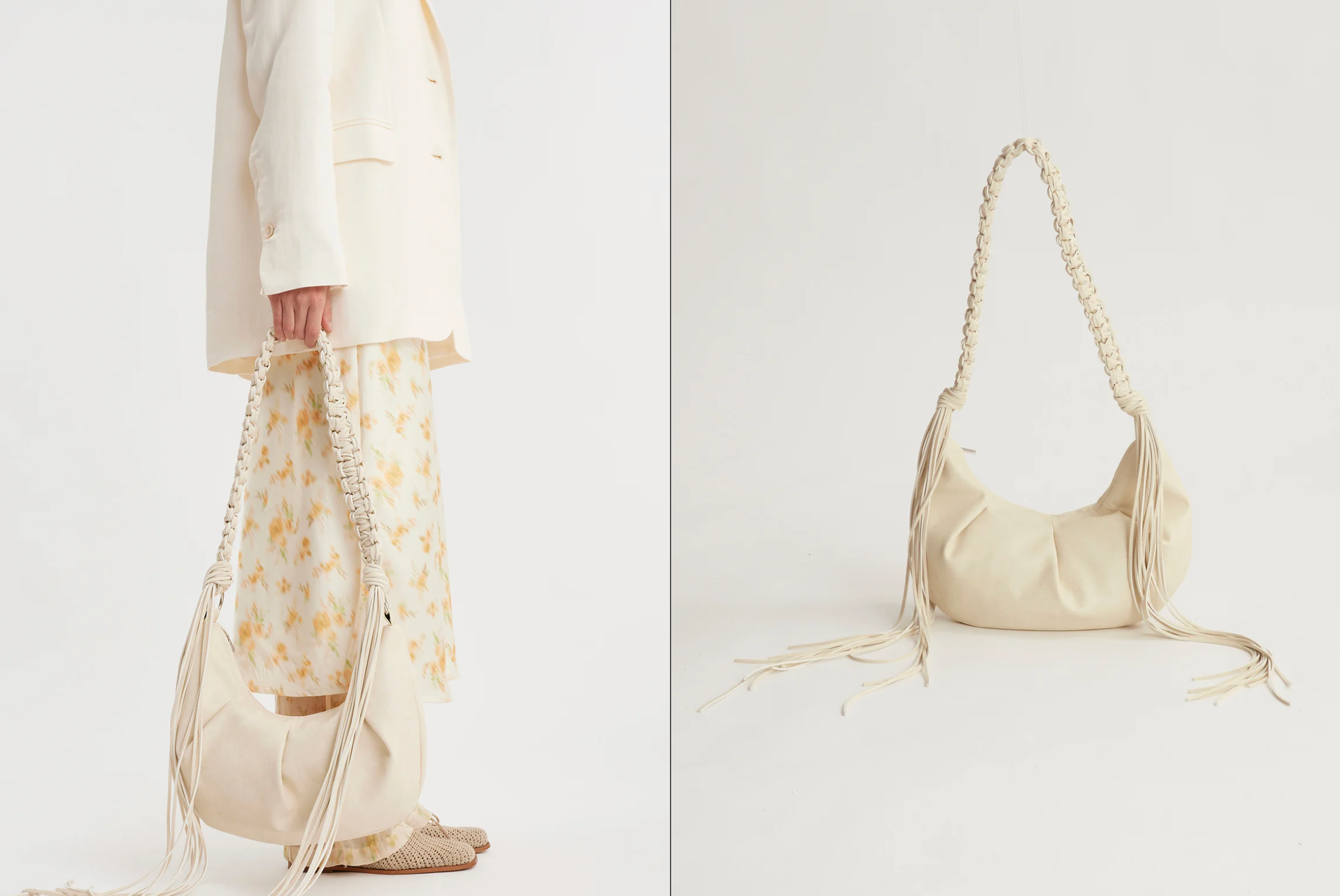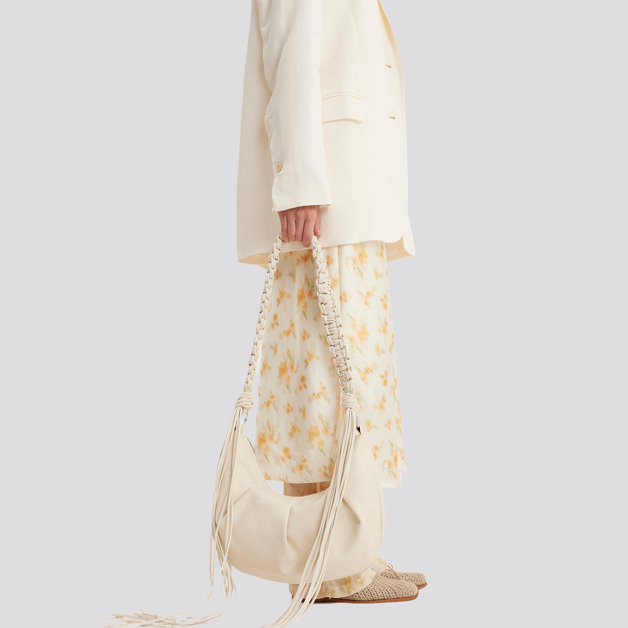 The Holzweiler Cocoon Big Bag is a stylish and sustainable piece that will elevate your everyday look. Made from recycled PU, this bag has a braided handle, pleats on the side, and a banana-like shape. It's the perfect size for carrying all your essentials, and the neutral ecru color will go with everything in your closet.