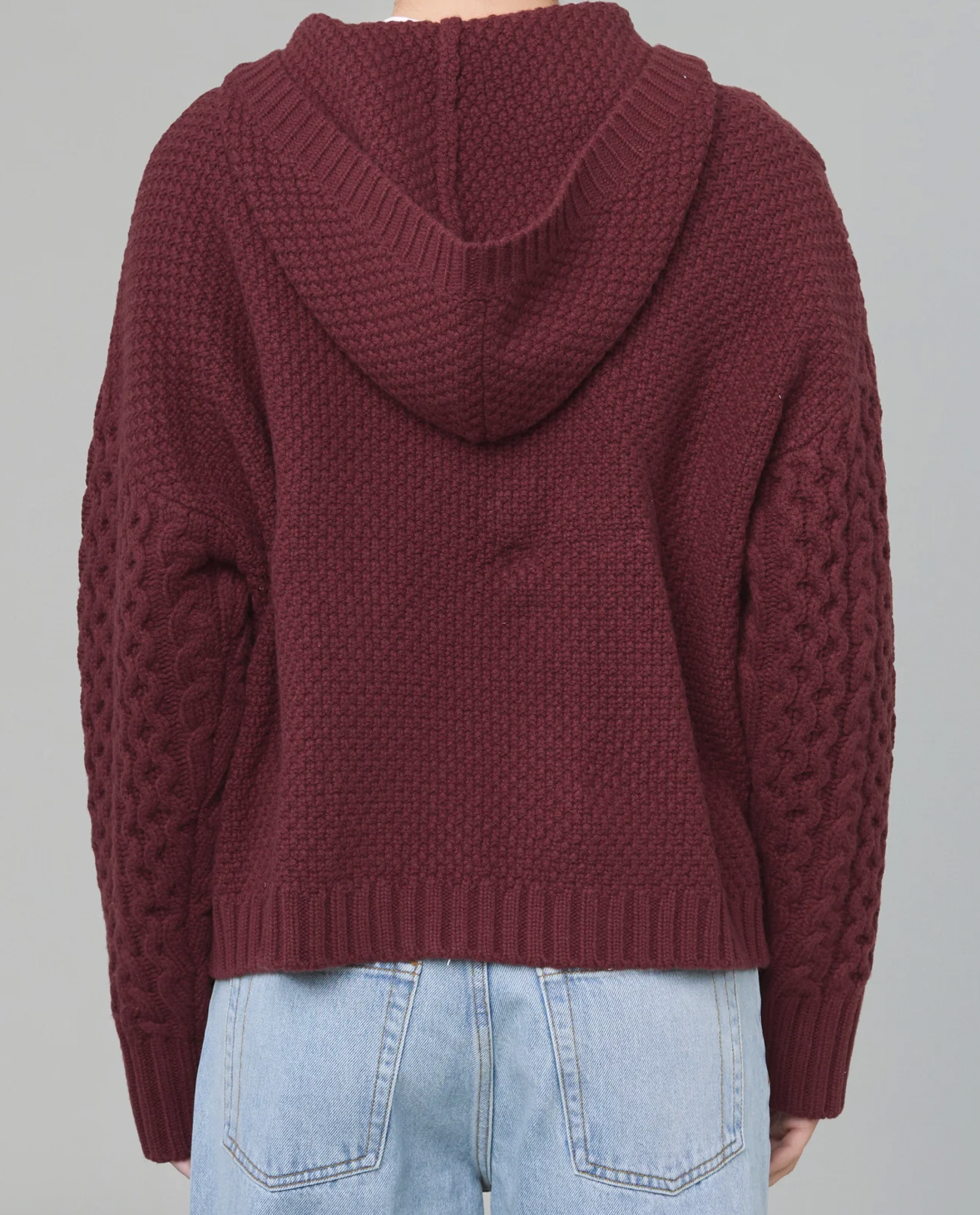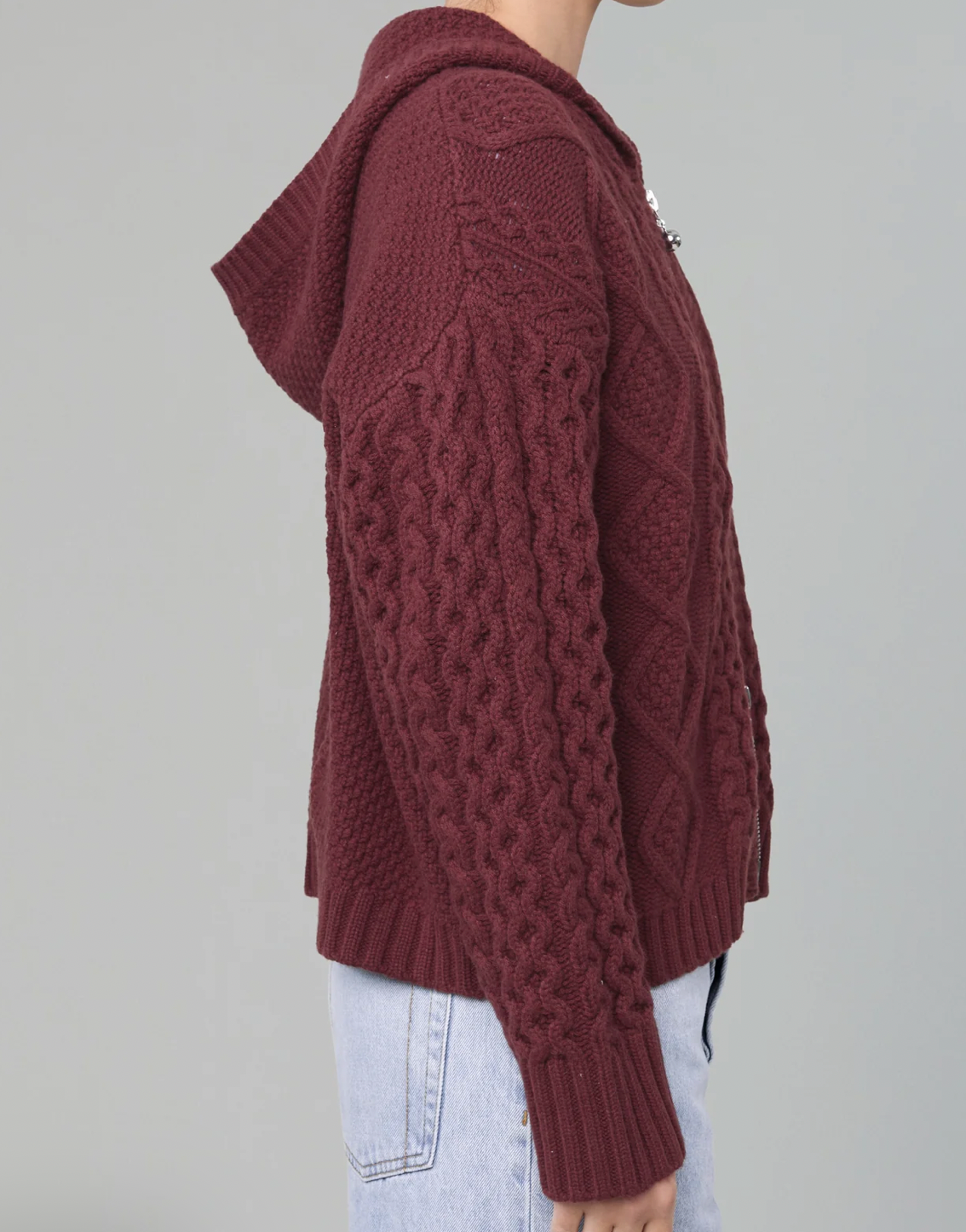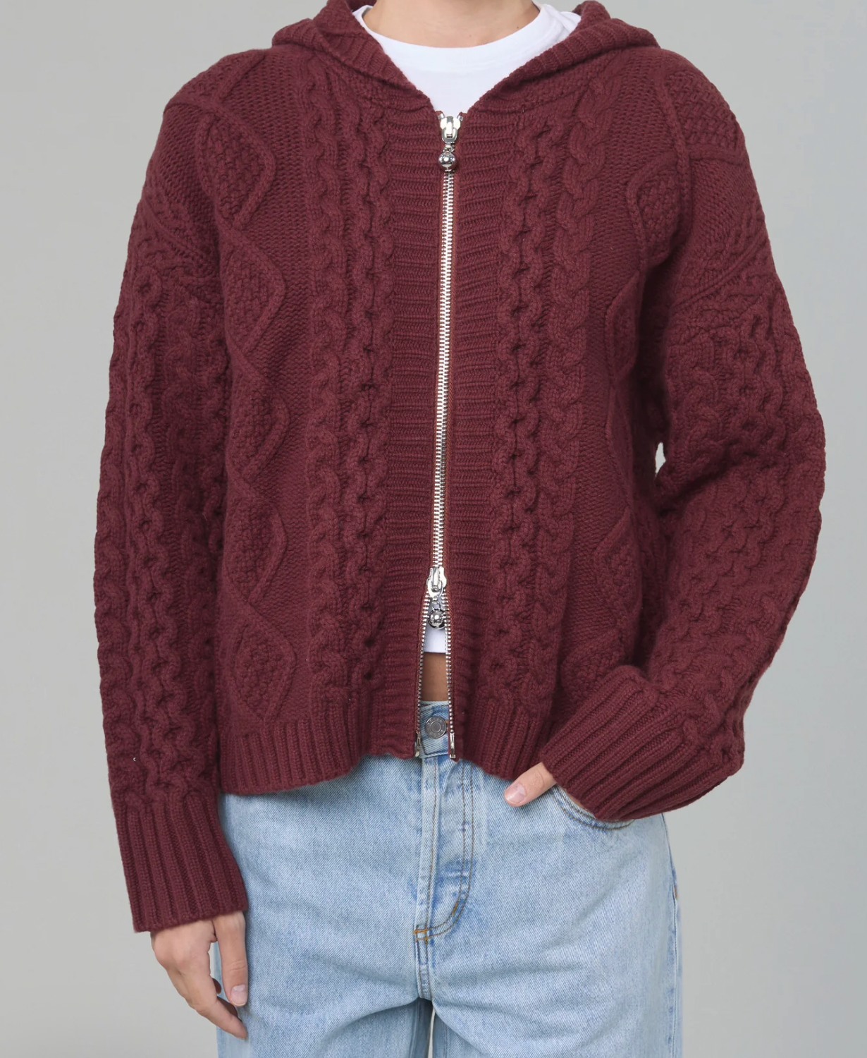The Dakota is a wool knit hooded zip up with two way zipper closure. It features a clean combination of cableknit and honeycomb patterns as well as custom hardware. Unisex fit and vibe.