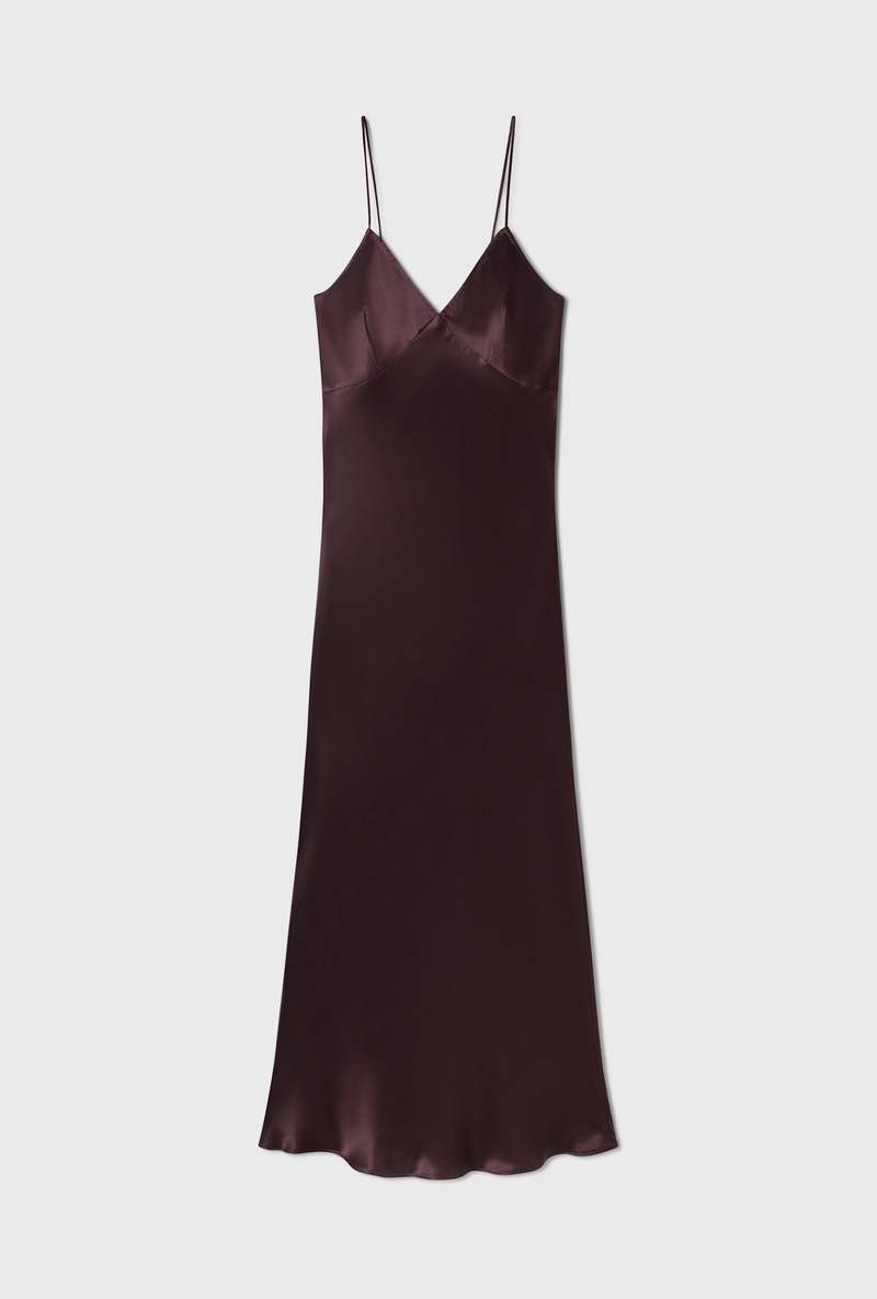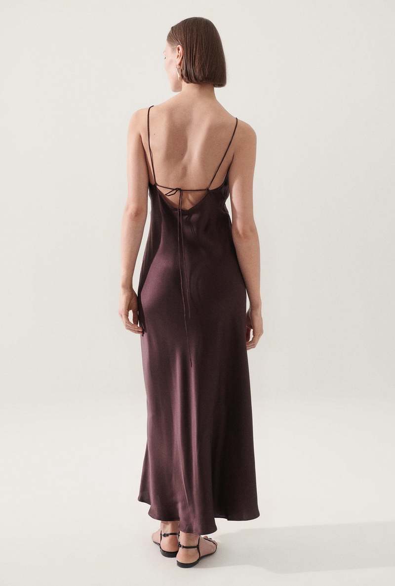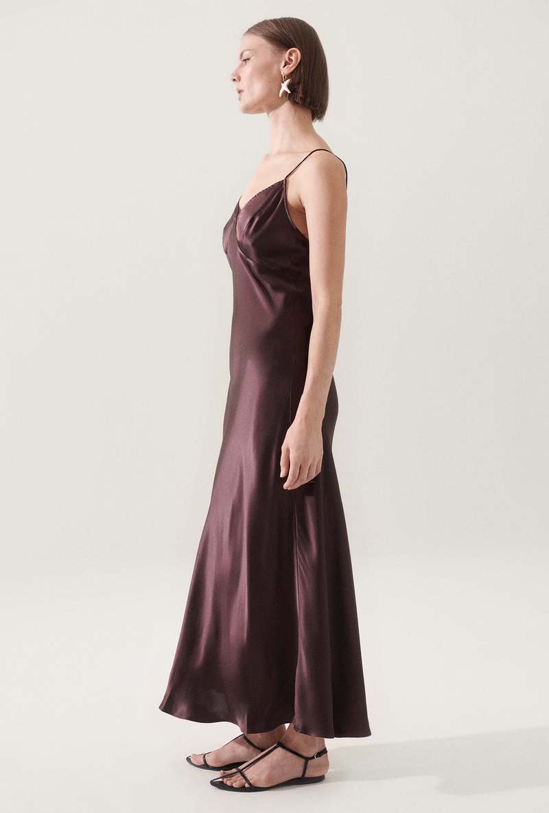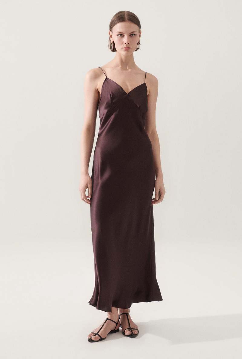 Silk Laundry bias cut dress crafted in 100% silk detailed with a subtle coiled strap, soft triangle panels and a deep v-neckline. Cut on the bias to a regular fit and ankle-length hemline. - Material: 100% Silk, 16 momme - Cut on the bias - Glossy sheen - Rouleau ties - V neckline - Front facing - Internal French seams - OEKO-TEX certified - Fits true to size - Model wears a size small
