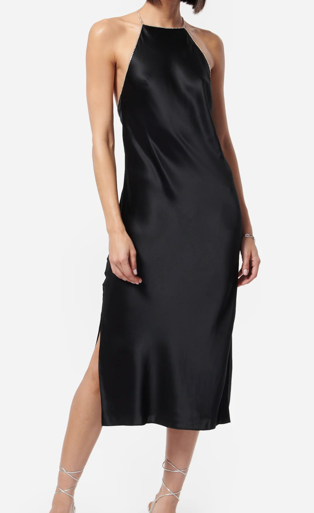 Now introducing the Diandra Dress! Made from 100% silk, the Diandra is a midi length bias cut slip dress. The Diandra has a romantic halter-neck silhouette featuring an ornate crystal trim along the neckline, armhole, and the continuing straps. This low-back style is designed with racer-style crystal straps and a lobster clasp closure at the back neck. The Diandra is finished with side slits at the hem and is unlined.