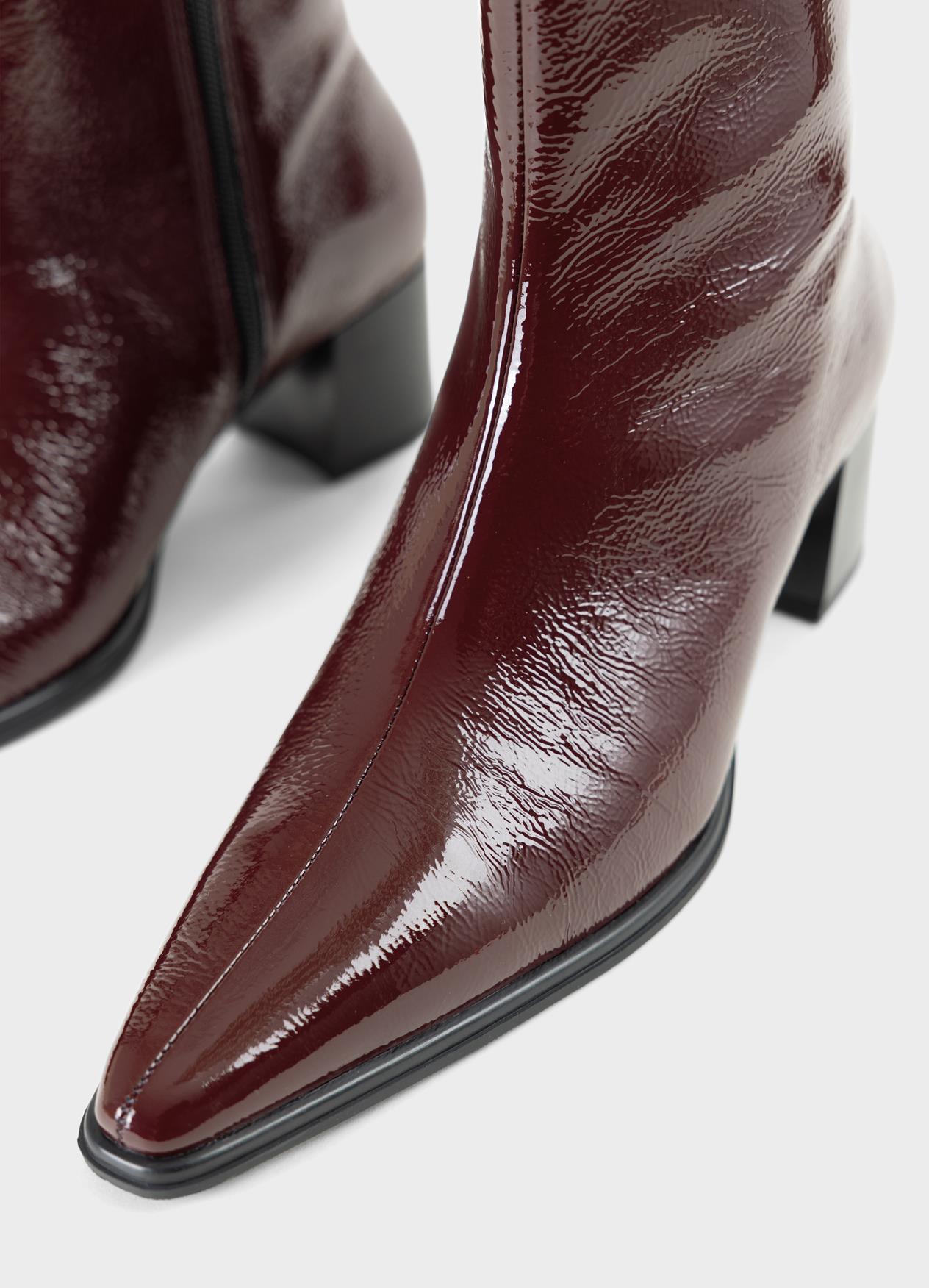 Giselle is the dressy ankle boots with an edgy look. The style is crafted from dark red patent leather with a pointed-toe shape and zip-side fastening. The sleek block heels measure 57mm.