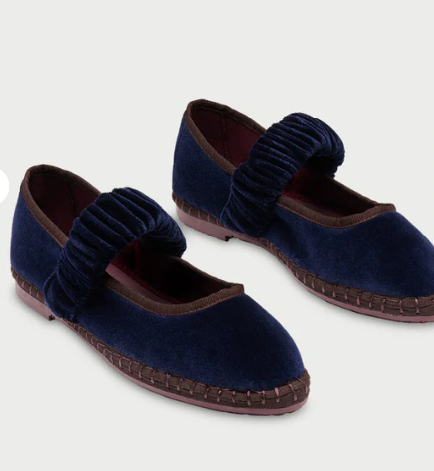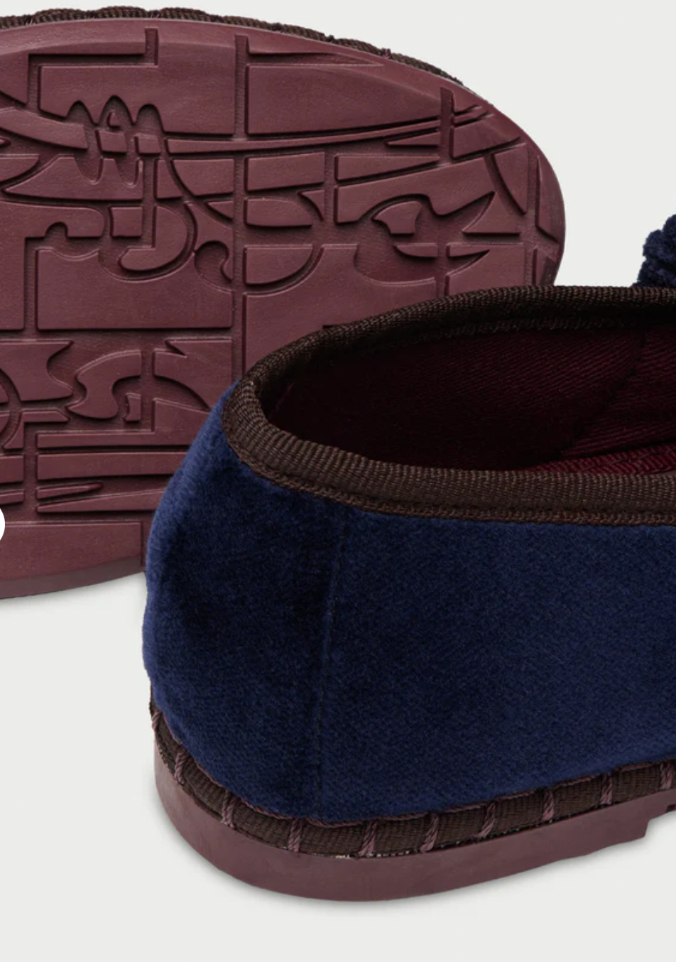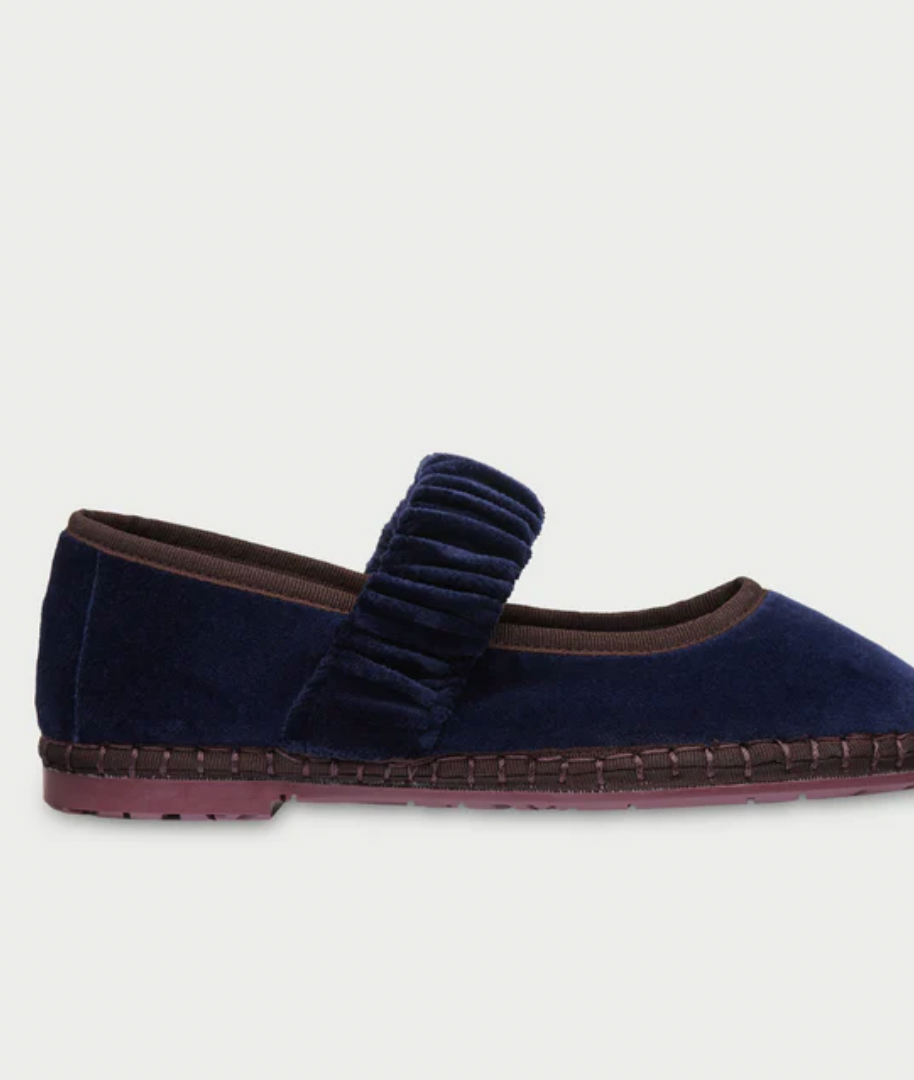 • Velvet mafalda in dark blue with brown piping and dark blue velvet lace.