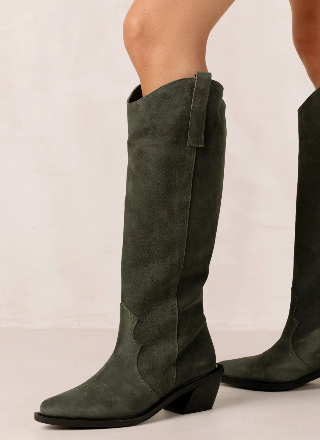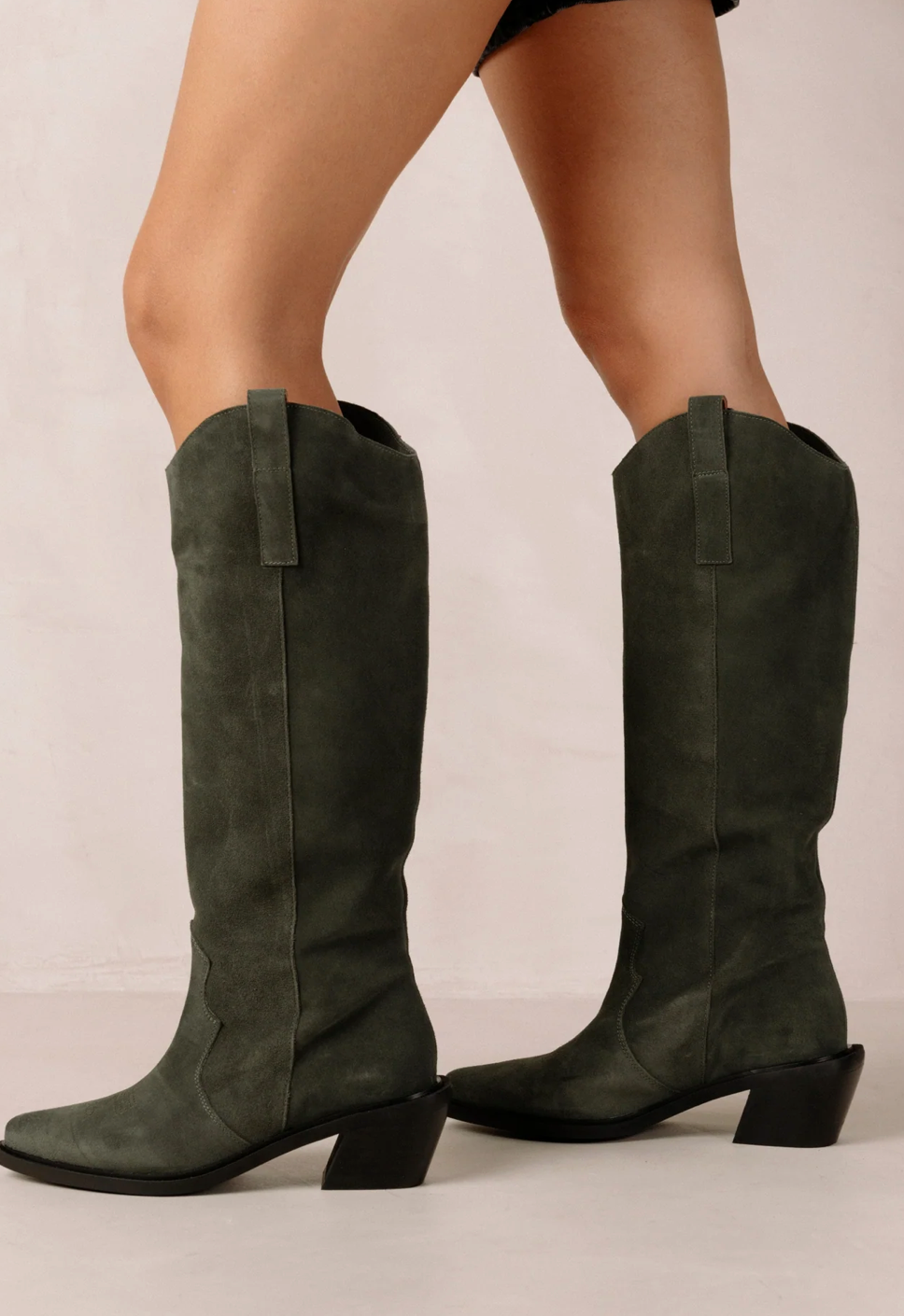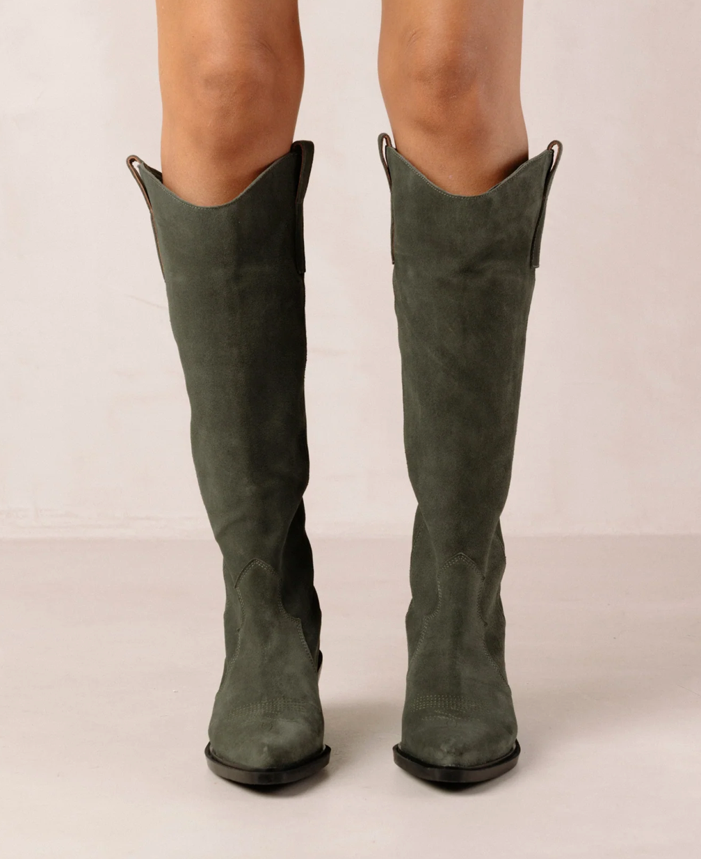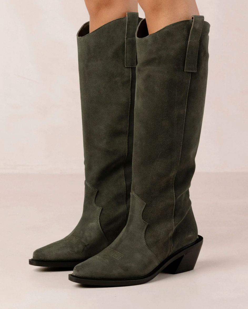 Giddy up, girls! Cowboy boots are back and they are not going anywhere. Inspired by the iconic Western style, this pair is crafted from green suede with subtle embroidery along the pointed toe and classic pull tabs. Swap out your sandals for a pair of these to ride fall season’s biggest trend like a pro.