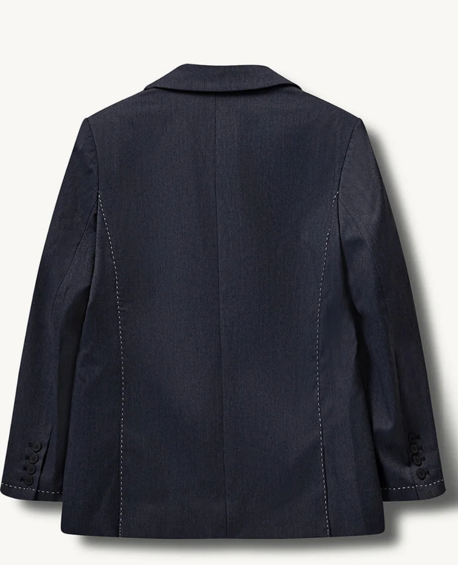 The Pluto Stitch Blazer, a men's inspired garment with hand-stitched contrast detail. Crafted from recycled polyester and viscose, this blazer offers a tailored fit and artisanal detailing, making it a versatile addition to your wardrobe.