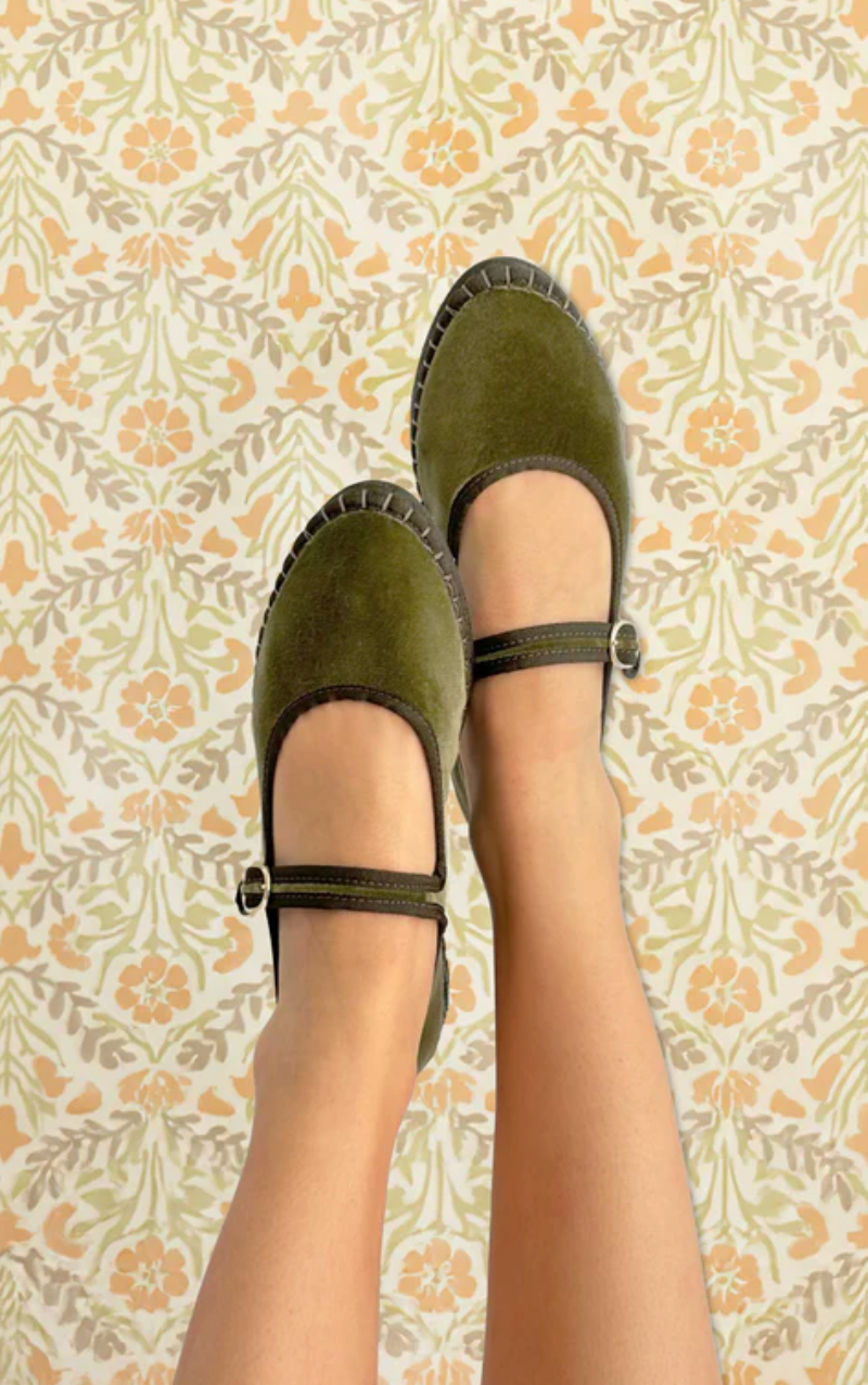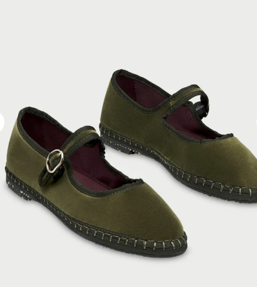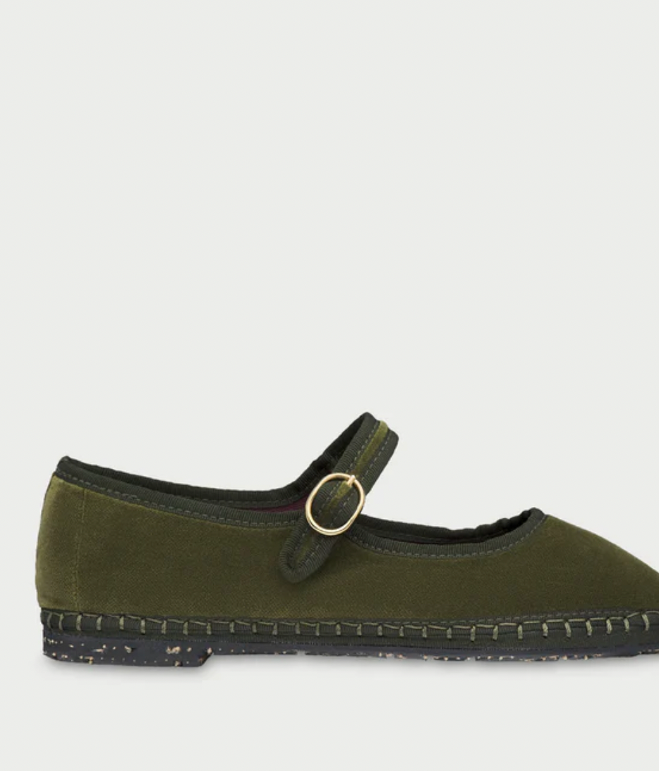 • Velvet mary jane in dark green with dark green piping and buckle closure.