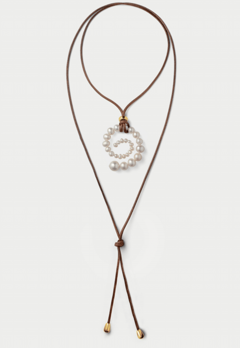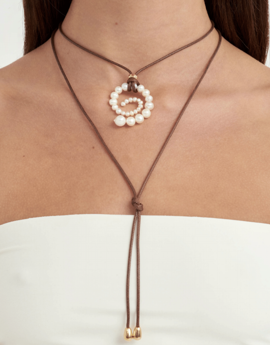 Our Arla Wrap is hand-crafted in our Miami studio by our team of female assemblers and it's focus is spiral freshwater pearl pendant which hangs from a self-tie cord that can be worn long, short, or wrapped.