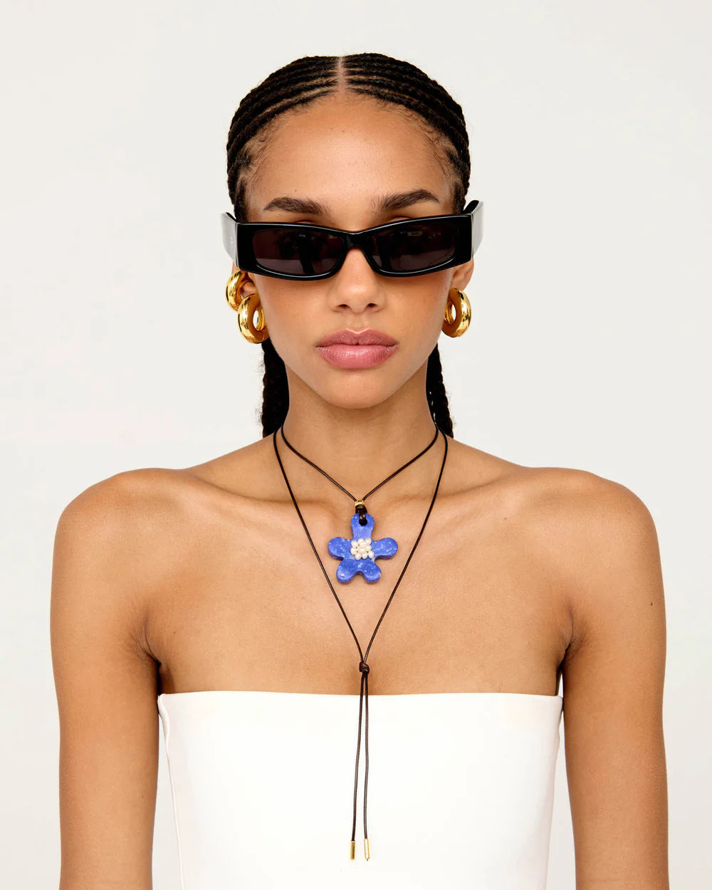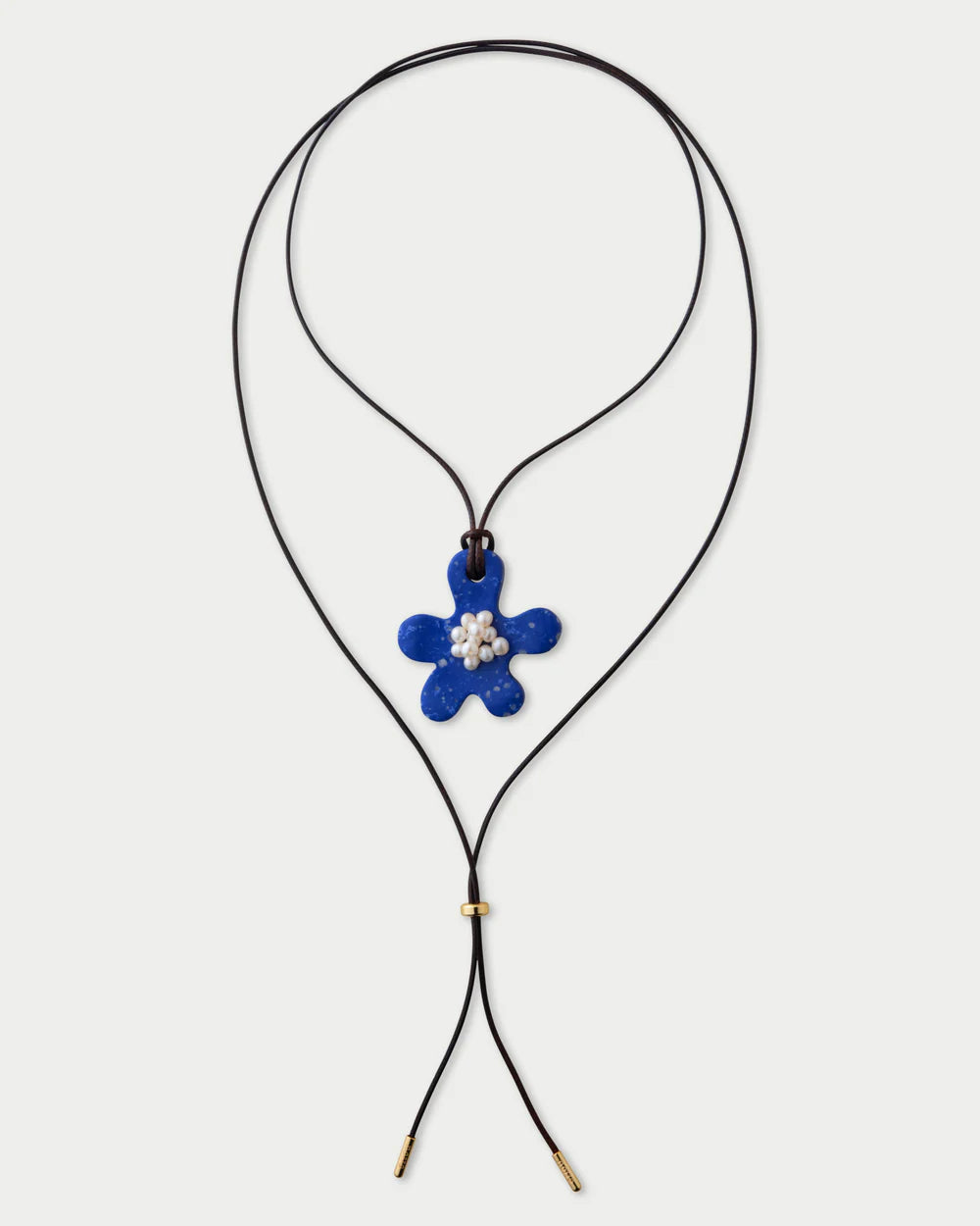 Our Chiki Wrap is hand-crafted in our Miami studio by our team of female assemblers and is quintessential for your next seaside vacation. Its focus is a hand carved lapis lazuli flower pendant with hand-sewn freshwater pearls at its center, which hangs from a self-tie cord that can be worn long, short, or wrapped.