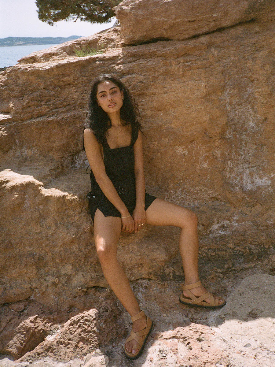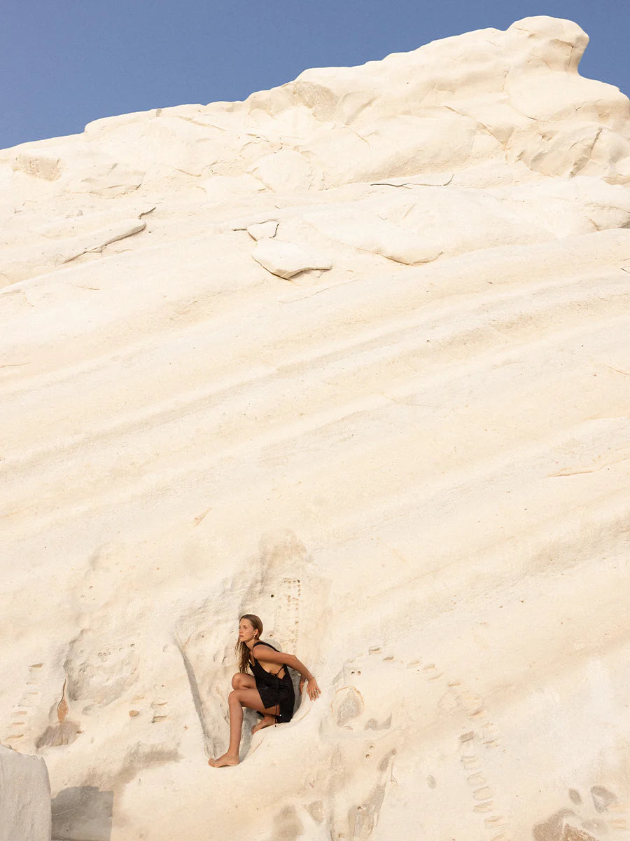 Harper is our apron style mini dress, featuring a square neckline and side ties with custom glass evil-eye beads—a mediterranean symbol known to bring guidance, peace and luck to the wearer.