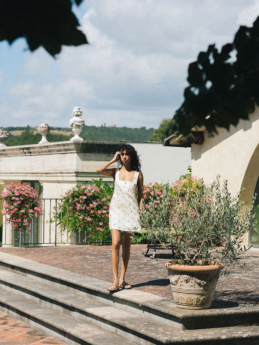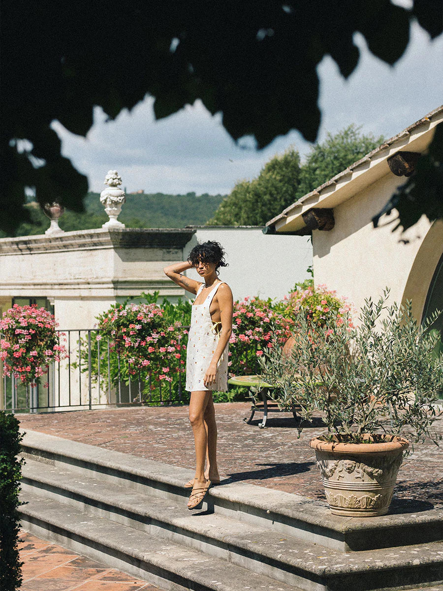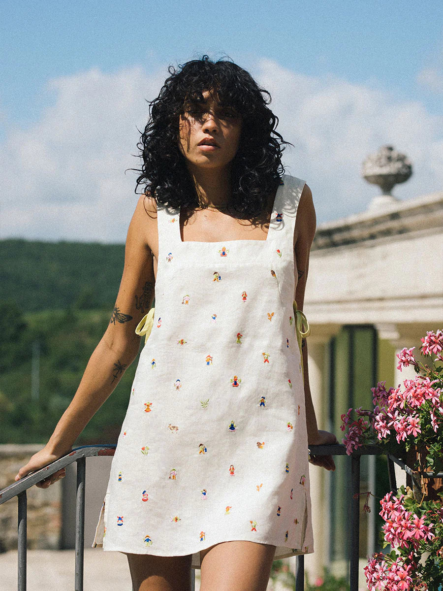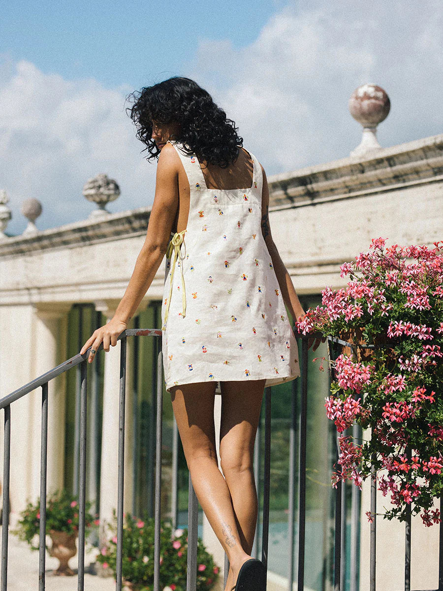 Harper is our apron style mini dress, featuring a square neckline and side ties.