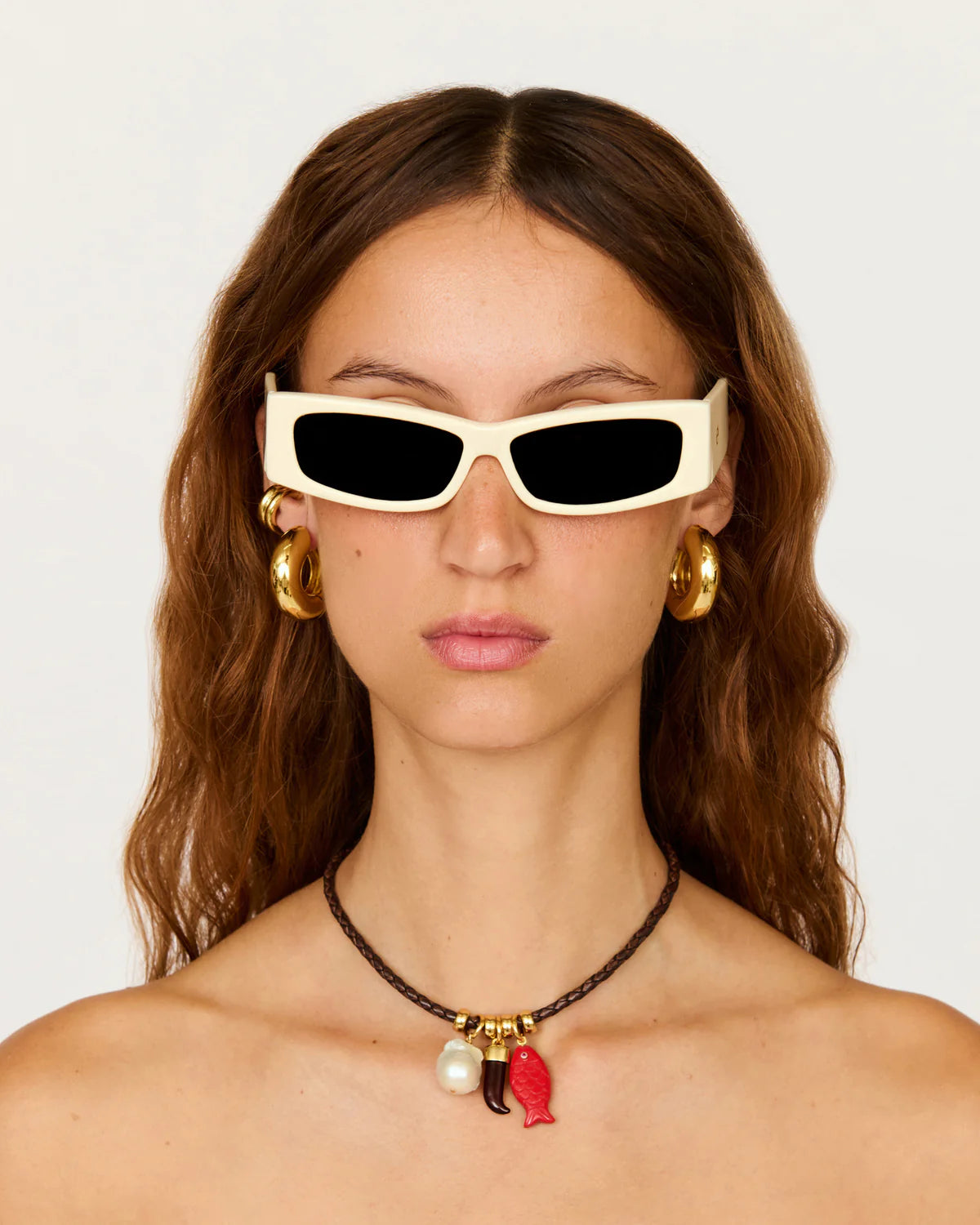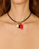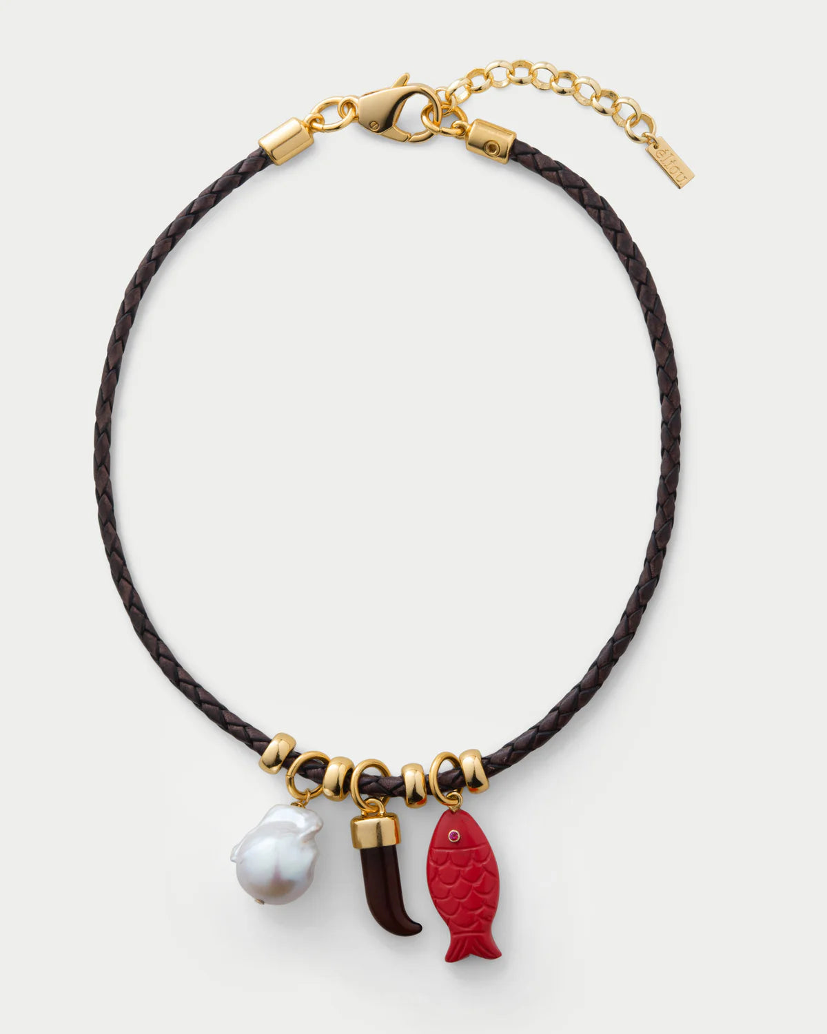 An éliou HQ favorite, our Pesca necklace is composed of fish charm made of dyed sea bambo coral, an acrylic saber tooth charm, a baroque freshwater pearl and 18k gold plated rondelles on a braided leather cord. The perfect piece for your next seaside escape and summers to come.