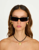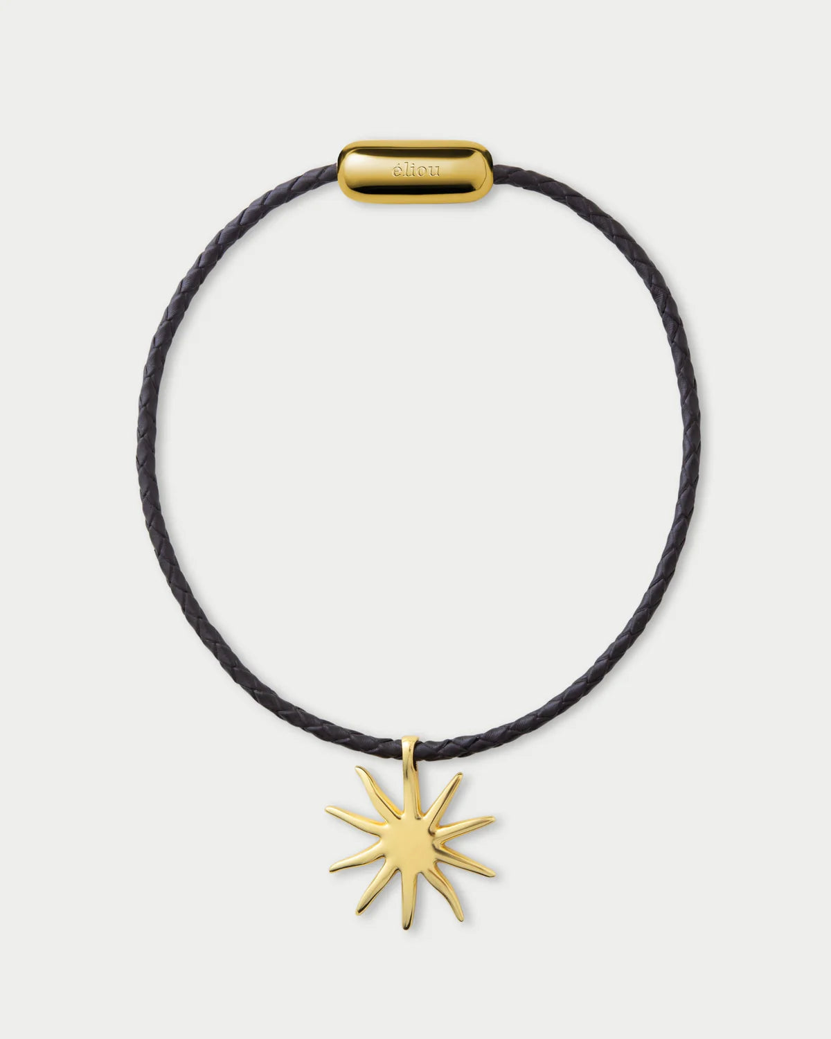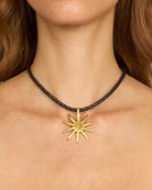 Our Soluna necklace is composed of a gold plated, blazing sun pendant, complemented by a braided leather cord and branded gold plated coupling. This particular piece was designed to be worn closer to the neckline as a bolder statement piece.