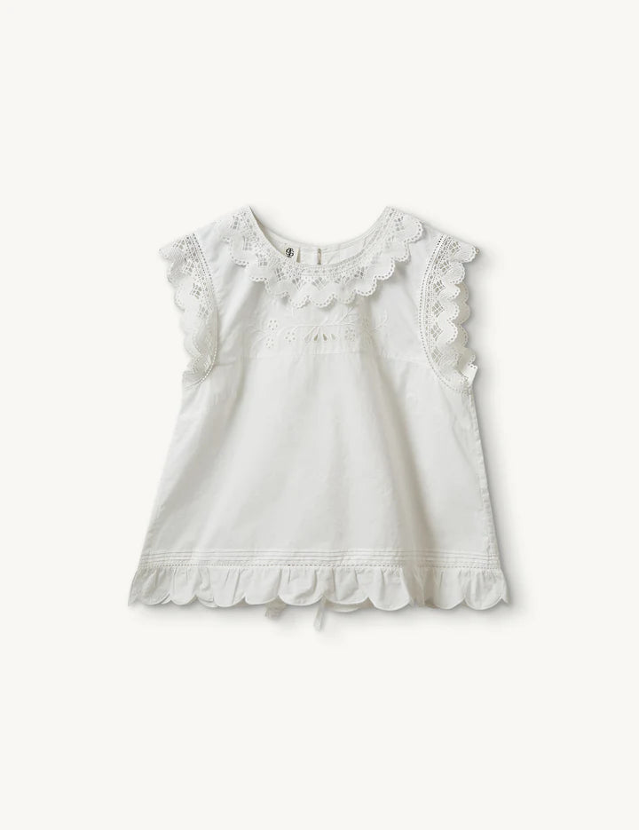 The Kirsten Cloth Top is a delicate wardrobe essential. An embroidery-detailed top with lace trimming that adds texture and charm, featuring a flattering fit and refined, feminine accents.