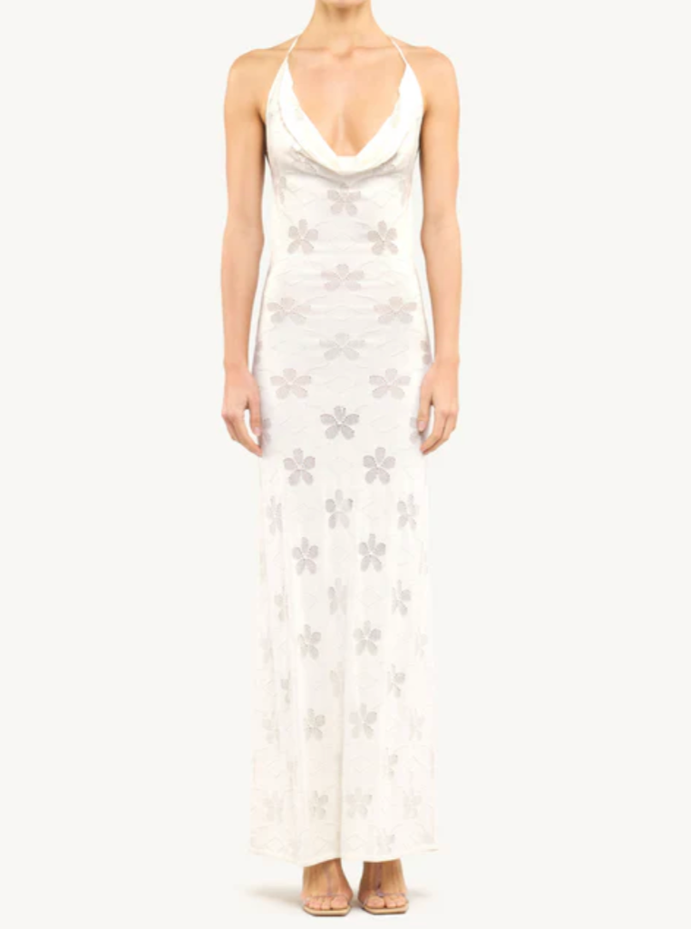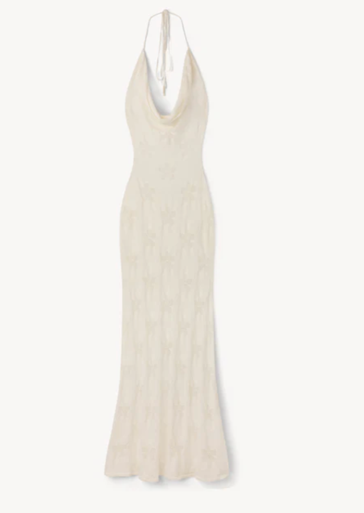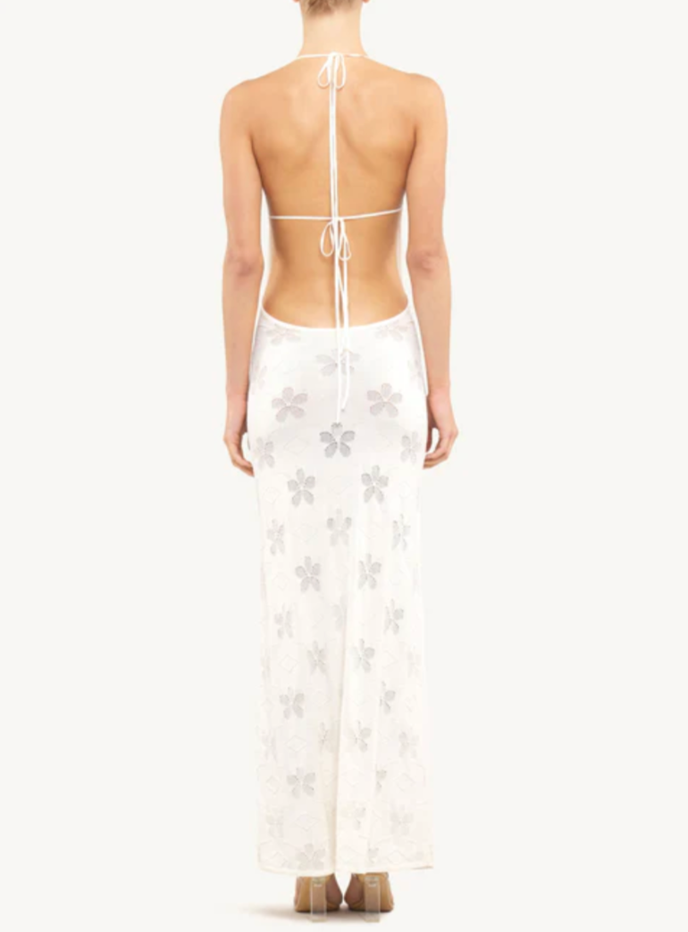 A backless floor-length silhouette with narrow back ties for elevated simplicity. Featuring a re-invented design to our signature flower pointelle motif.