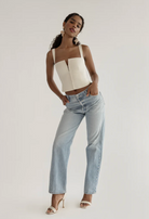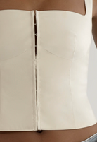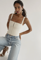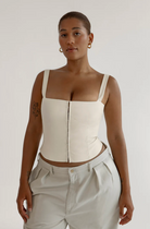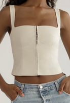 Better than a predictable tee or that same old tank, this modern day casual bustier top features a square neckline and 11 hand-sewn hook and eye closures running down the front. Now with adjustable straps for the perfect fit.