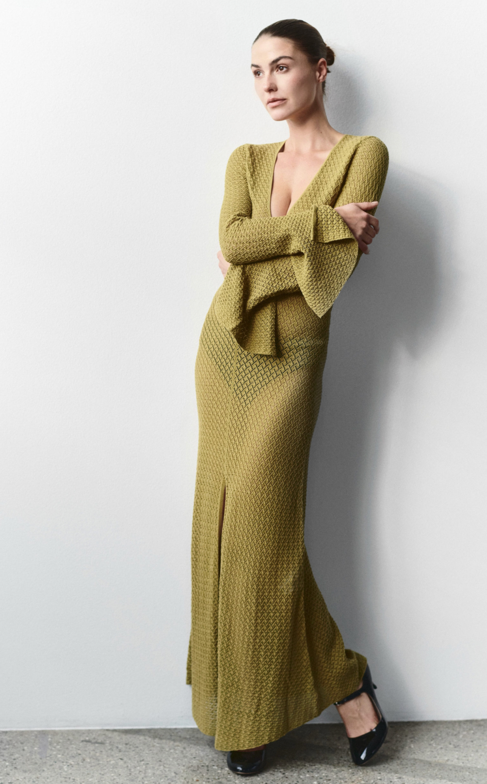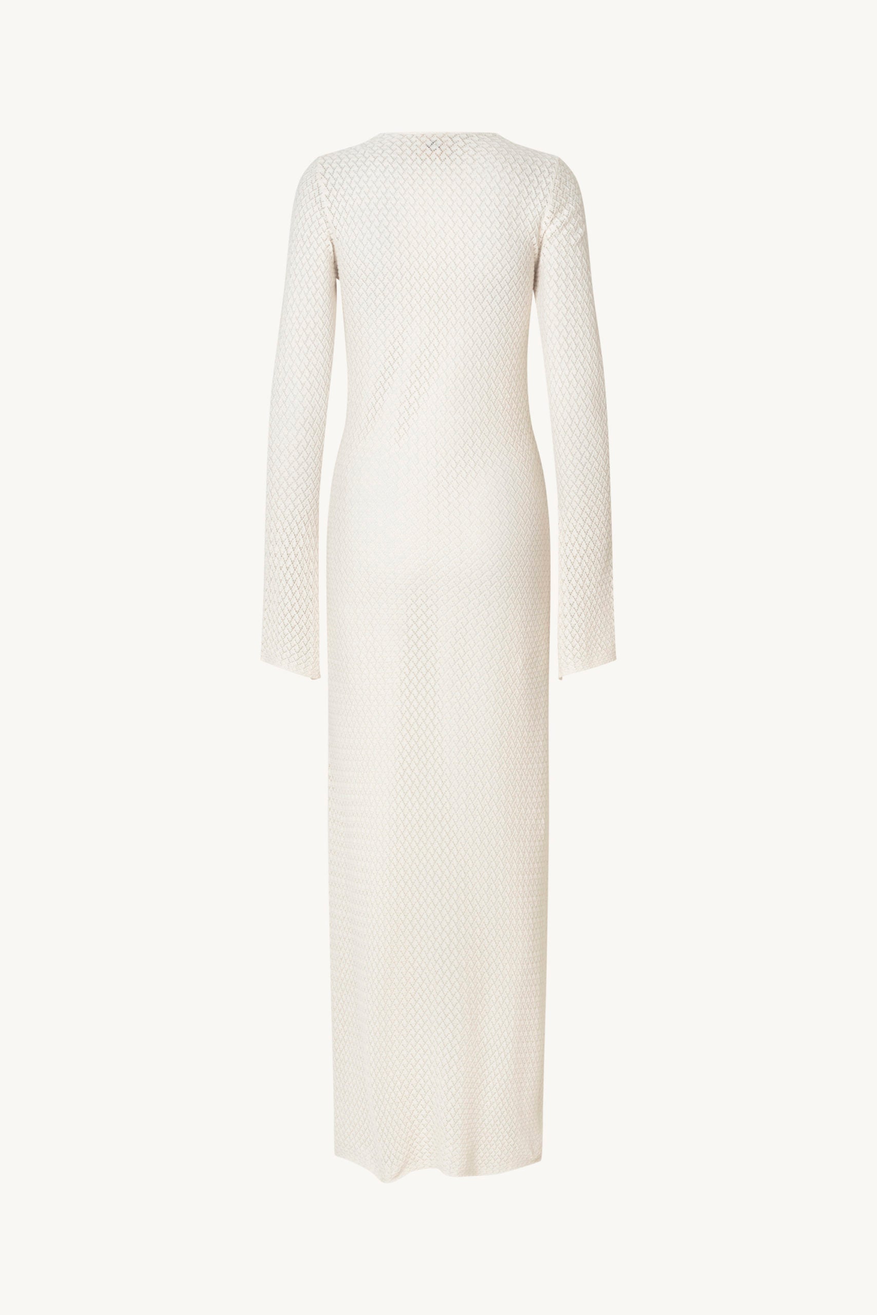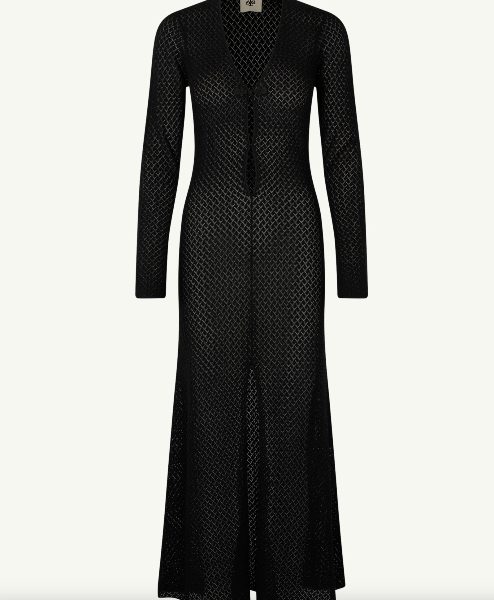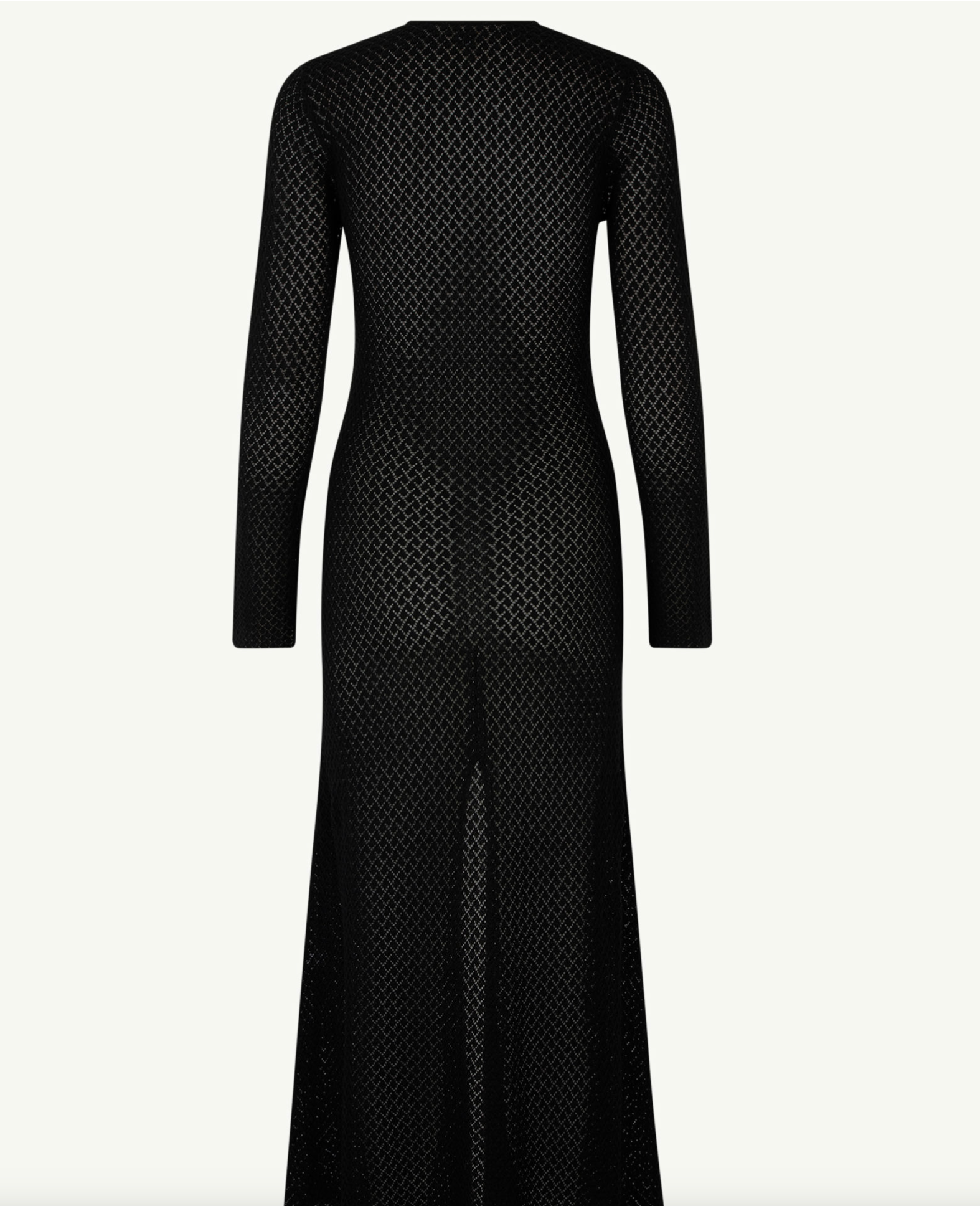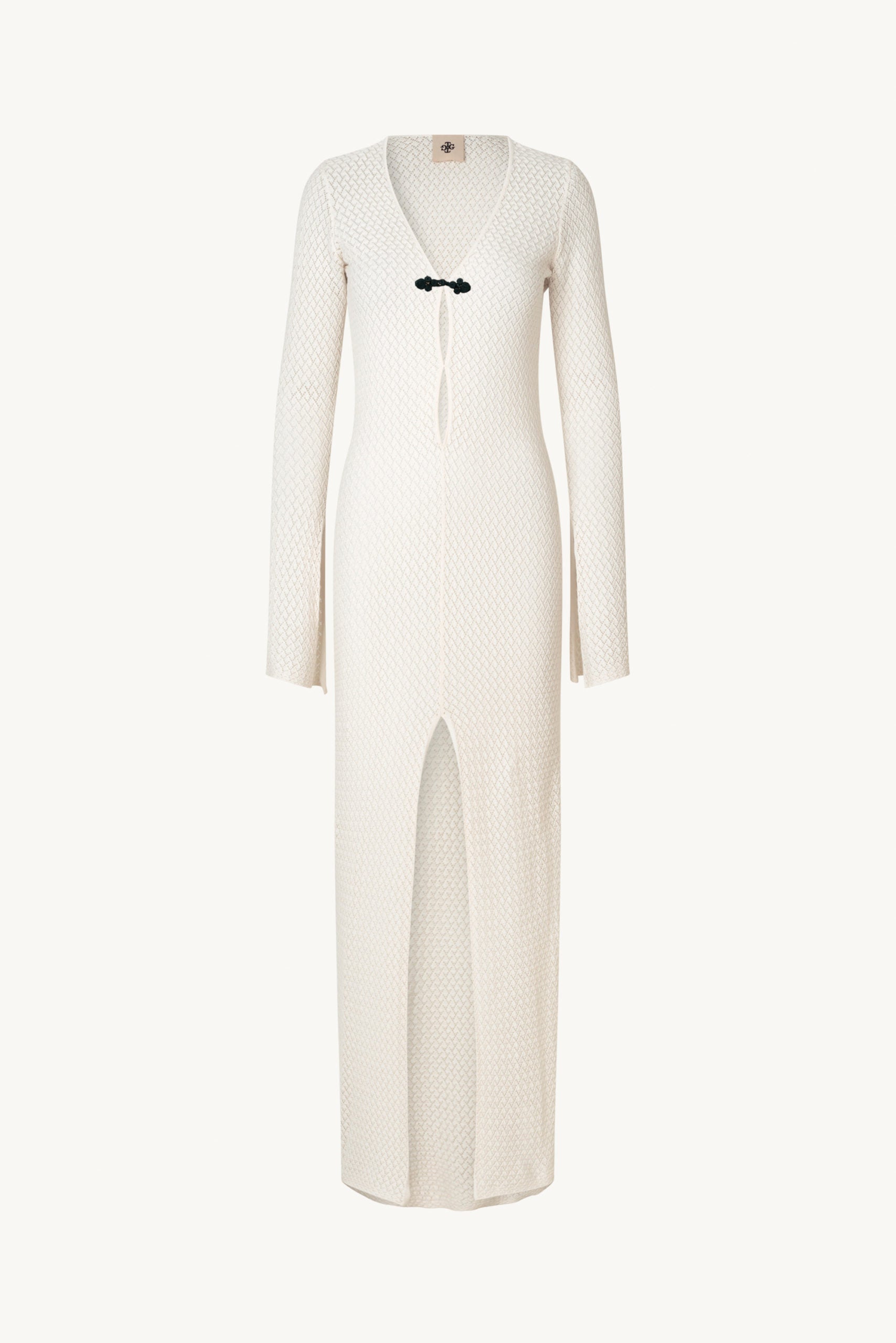 The Tanzania Dress in a 100% organic cotton fabric. This pointelle knitted long dress is designed for a relaxed fit and shaped to a slim silhouette with a front slit, buckle details, and long sleeves with slits running up each side. The Tanzania Dress is a perfect choice for a summer day; the organic cotton fabric will keep you cool and comfortable, while the front slit and sleeveless design will keep you looking chic and stylish.