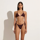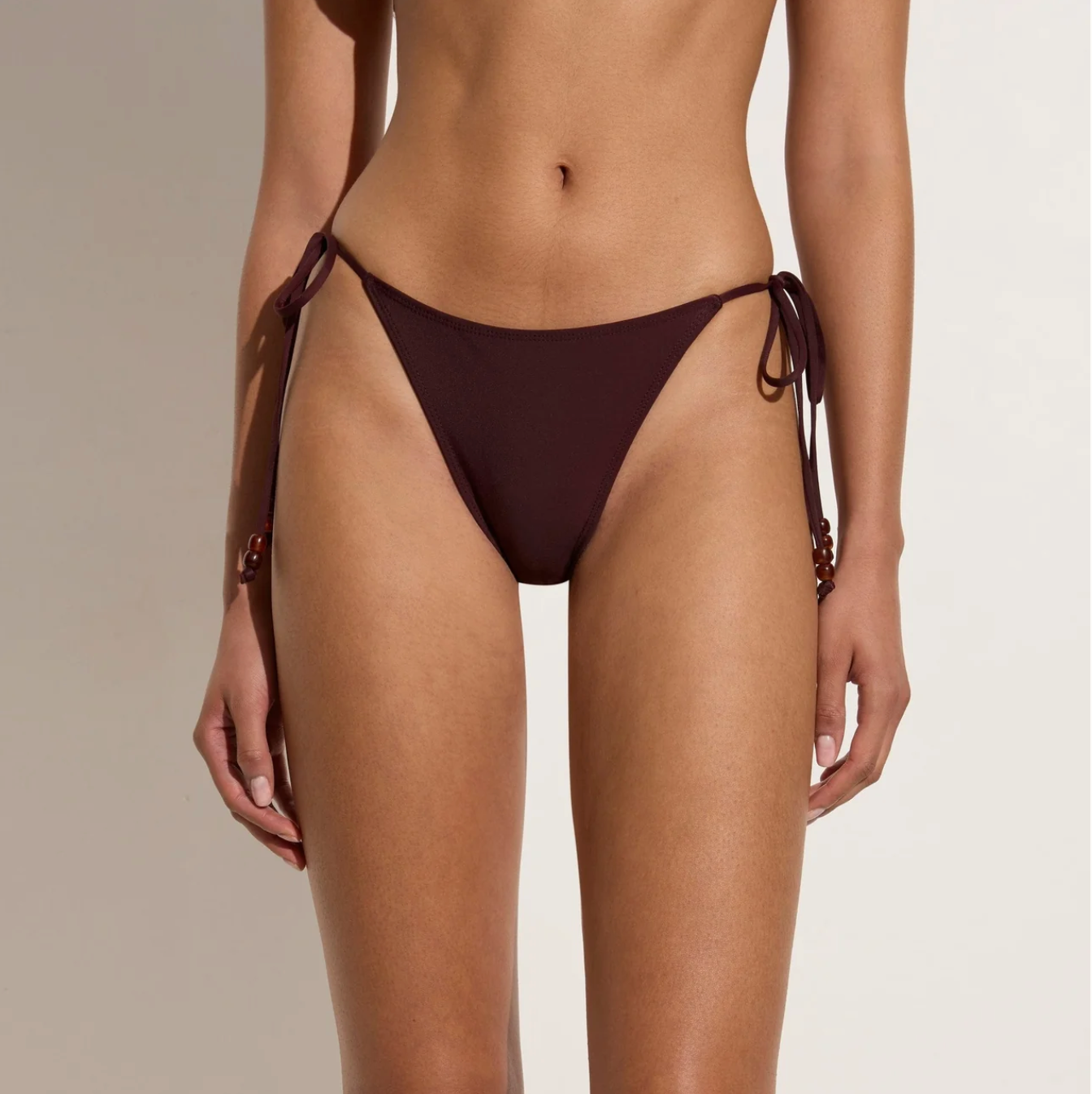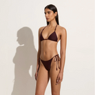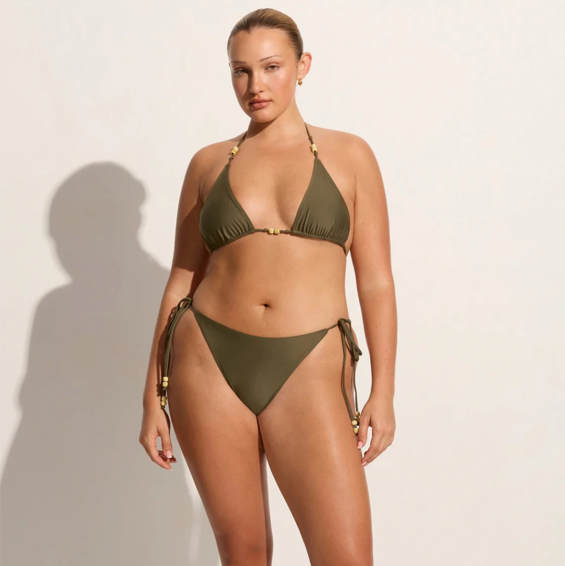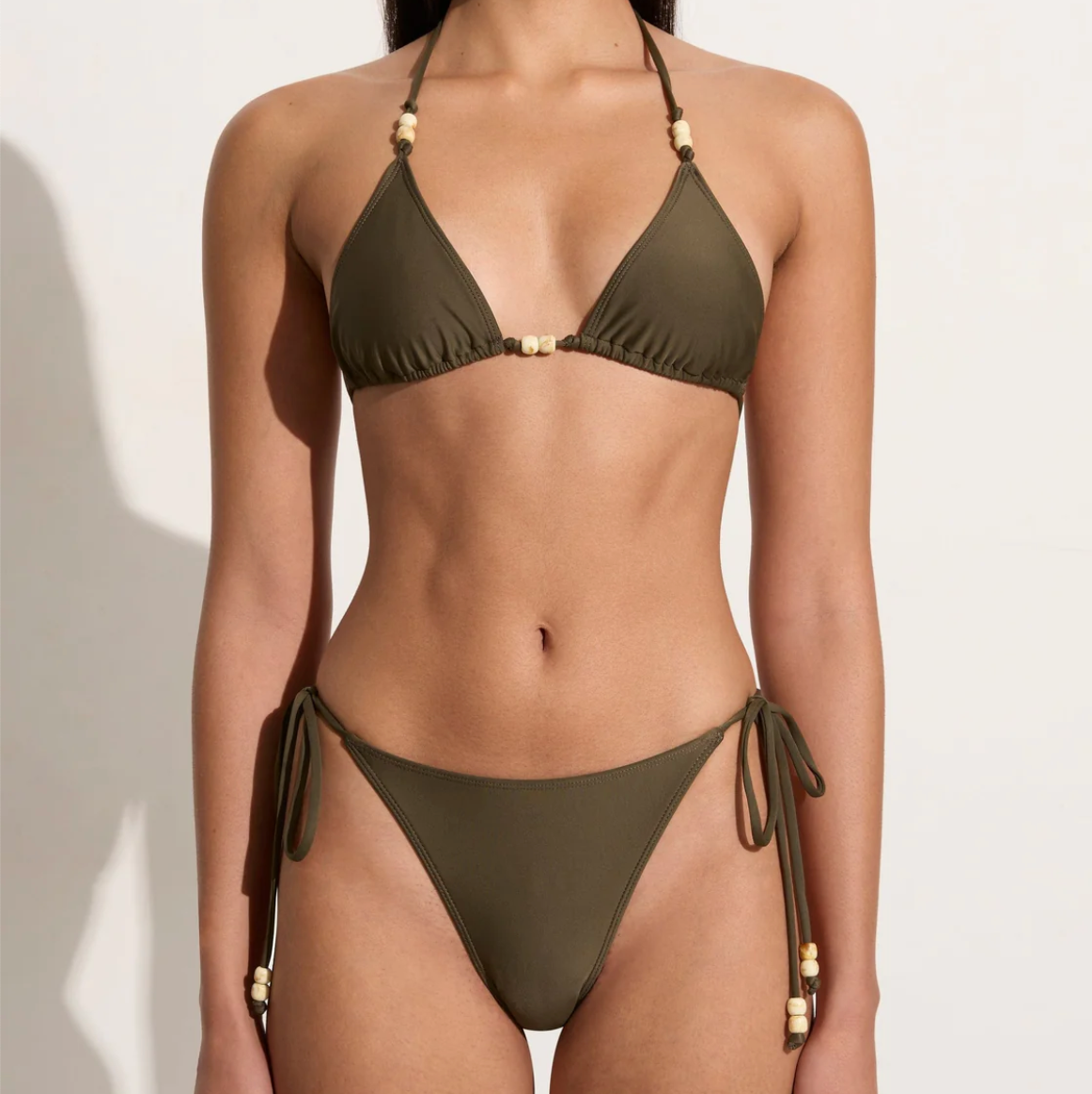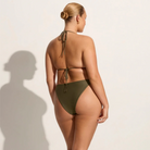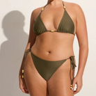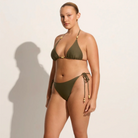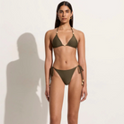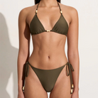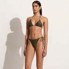 In certified recycled nylon, the Ada Bikini Bottoms in Khaki are mid-rise bikini briefs, and features a mid-rise waist, moderate rear coverage and adjustable side ties adorned with contrast beads at the ends. Pair it with the Uma Bikini Top for a matching set.