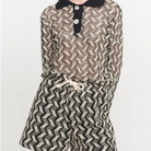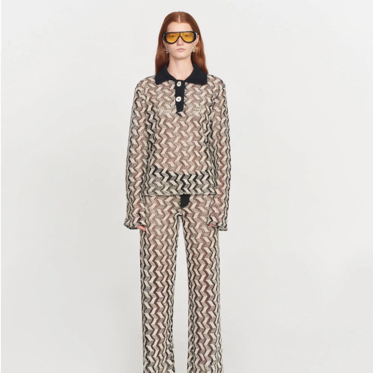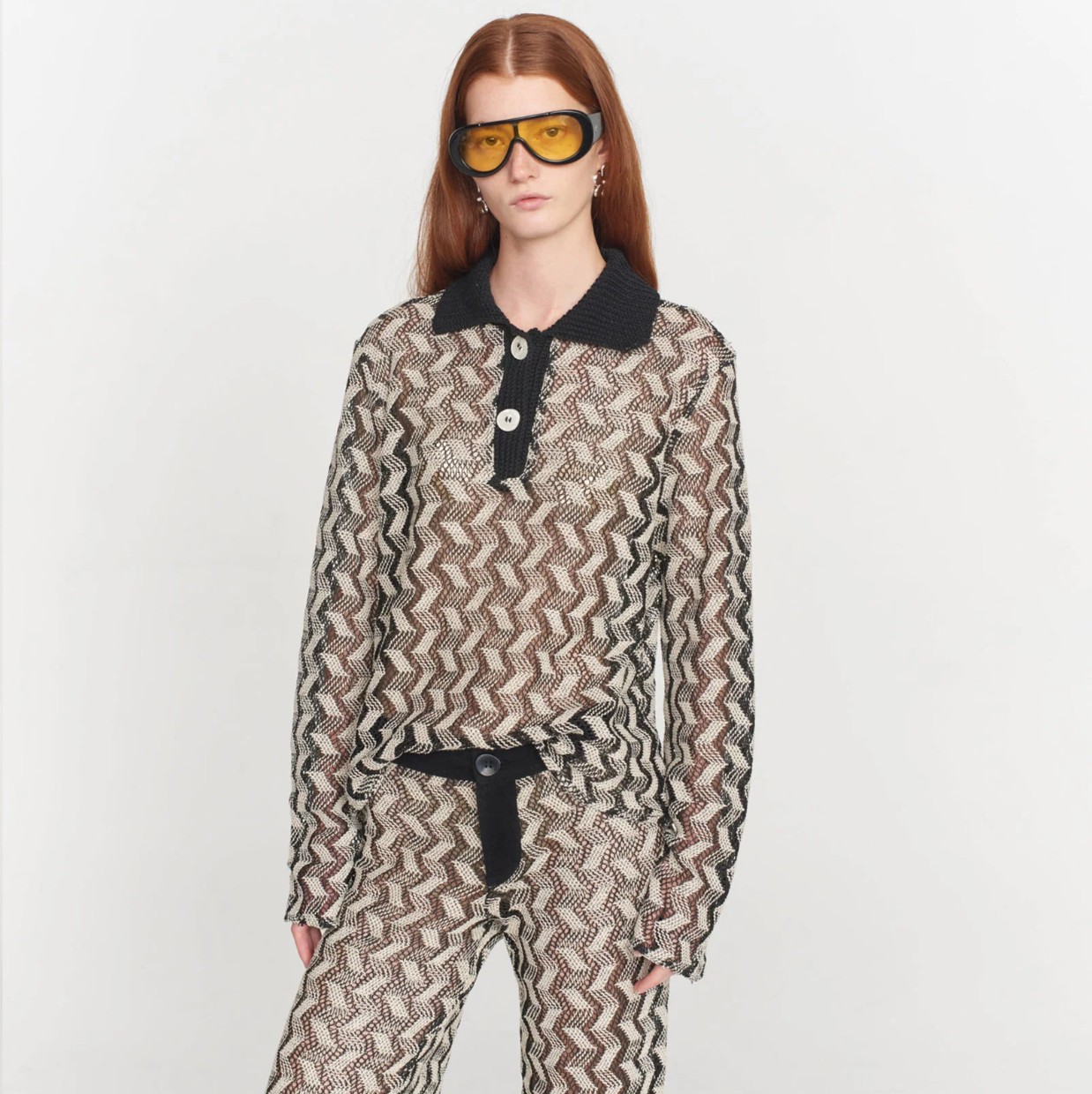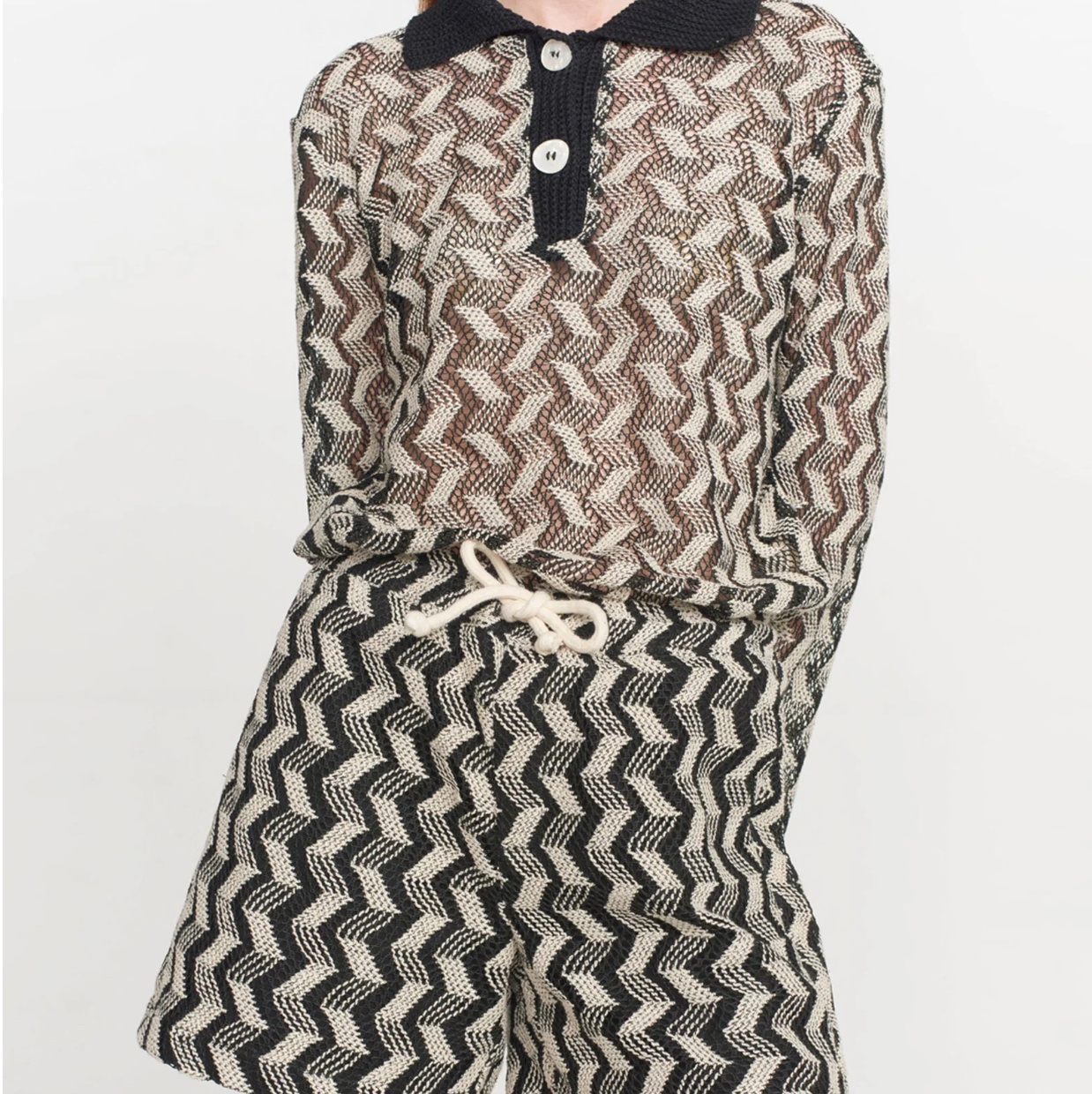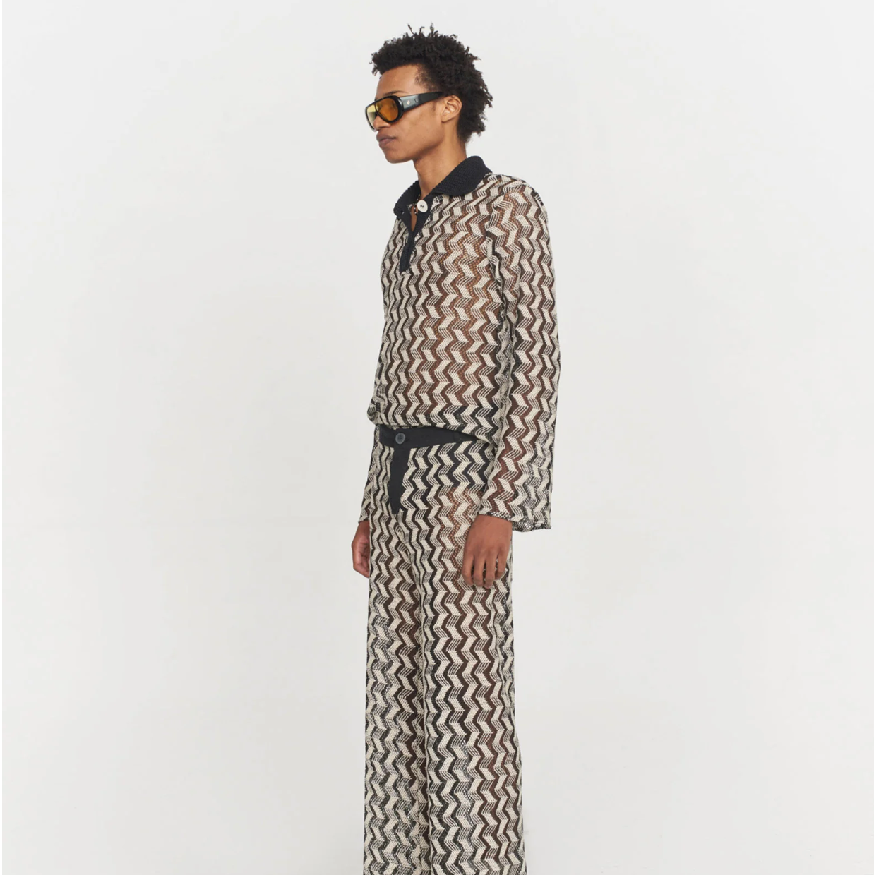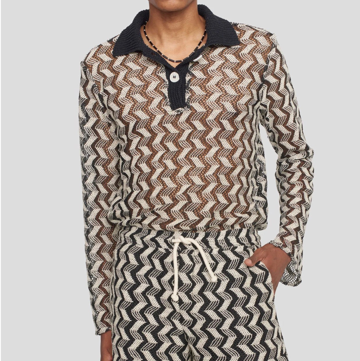 The Andre Top in Black Ziggy is an artisanally crafted unisex shirt, hand-cut in Brazil. This shirt is fashioned from a limited stock of deadstock fabric and a hand-crocheted collar. The subtle sheerness and nostalgic silhouette add interest to this classic shirt