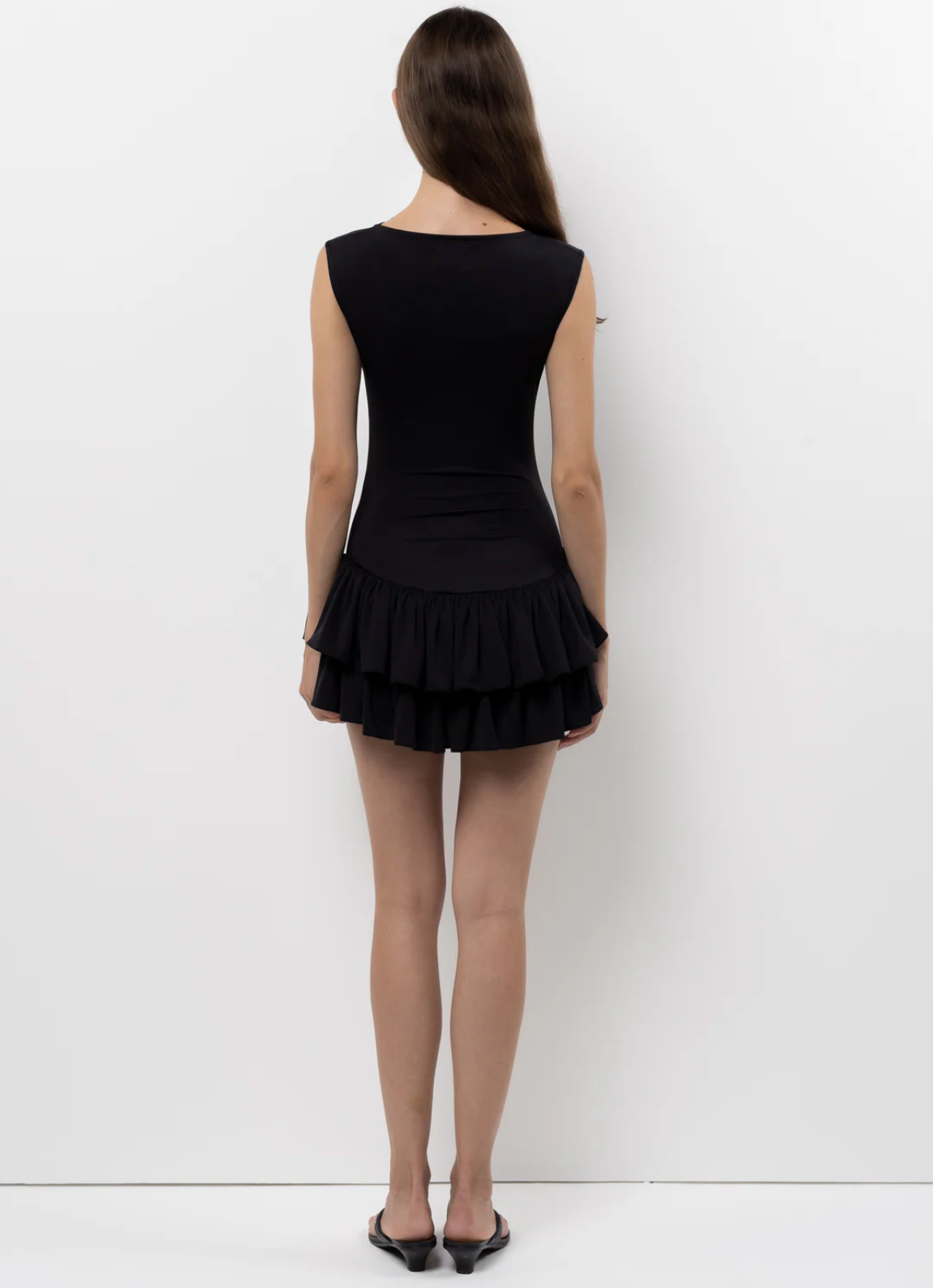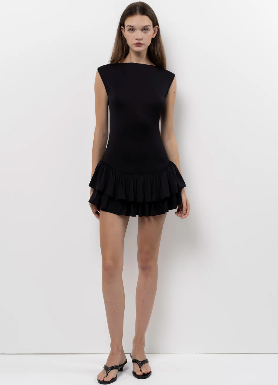 The Ballerina Dress features a double layered ruched skirt, boat neckline, and close-fitted bodice.