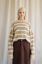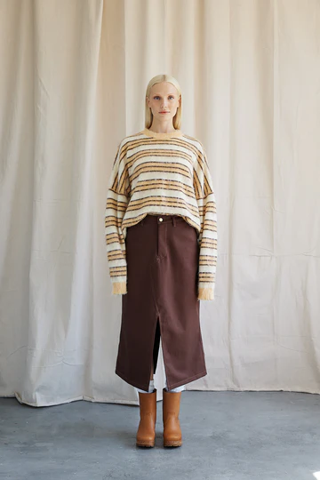 a vintage inspired skirt with brass detailing and contrast stitching.