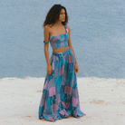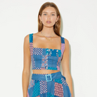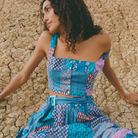 Cropped bodice top with shirred back panel for a fitted bust. Wide straps and button through centre front for entry. Designed to be a fitted style.