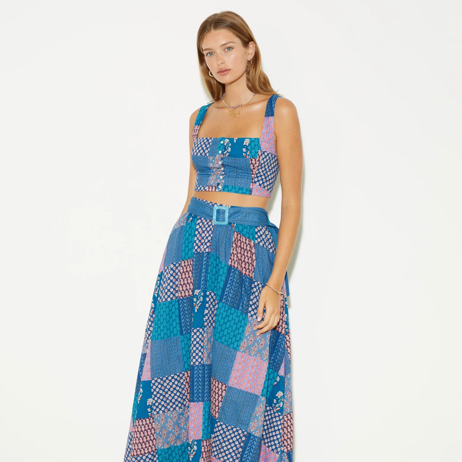 Lovers of flea markets and all things artisanal craft are sure to resonate with the Cedella story, a cotton patchwork of ditsy prints in an earthy swatch of seas greens, indigo and rosy madder highlights.