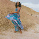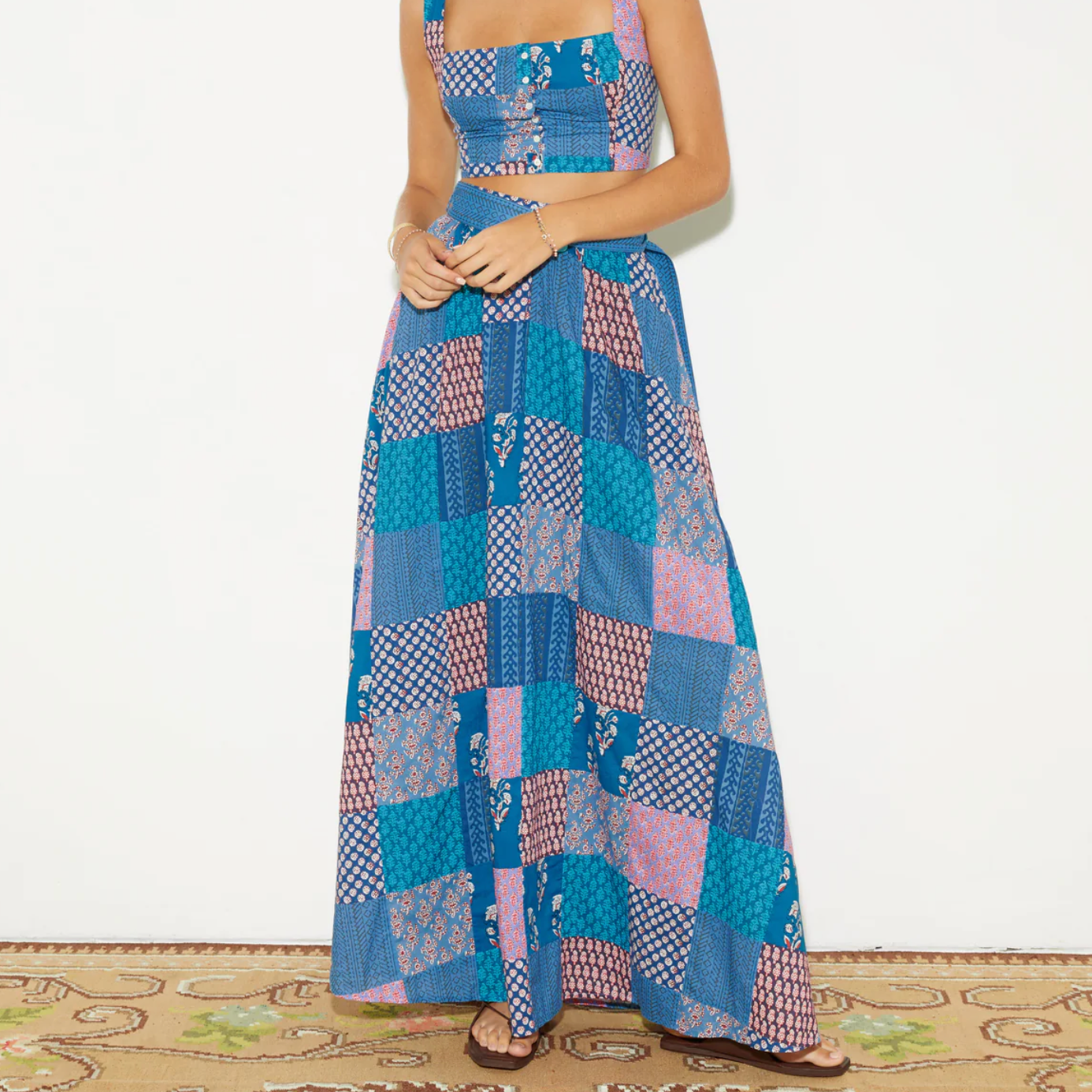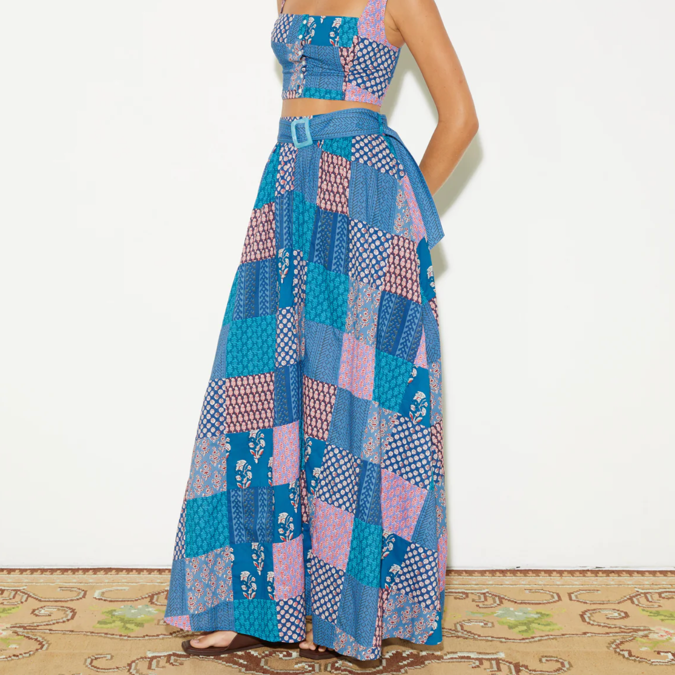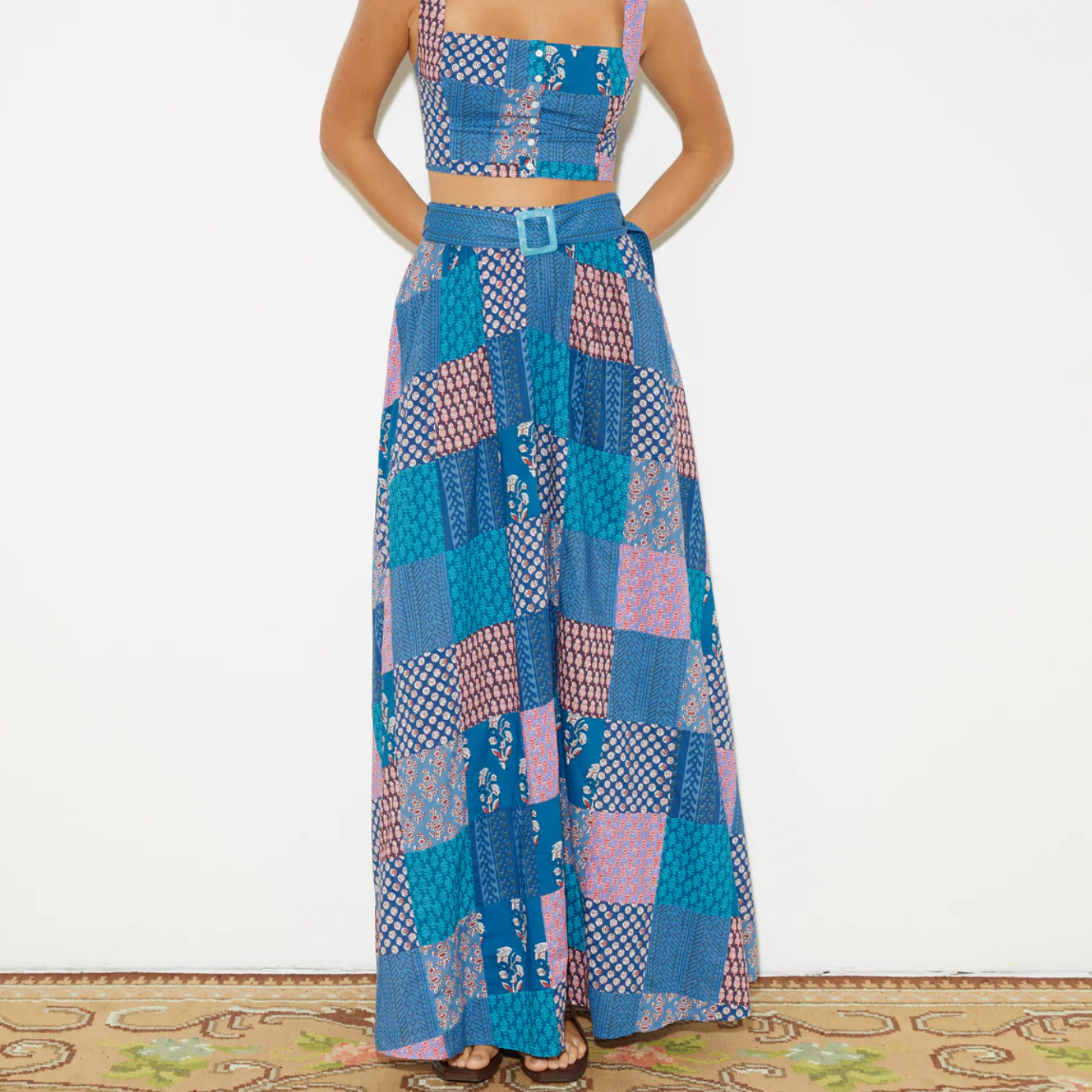 Newly created 4-panel full maxi skirt featuring contrasting belt, striking maxi length to floor. Features hidden pockets at side seams, centre back invisible zip and soft elastic at back waistband for ease of wearing.