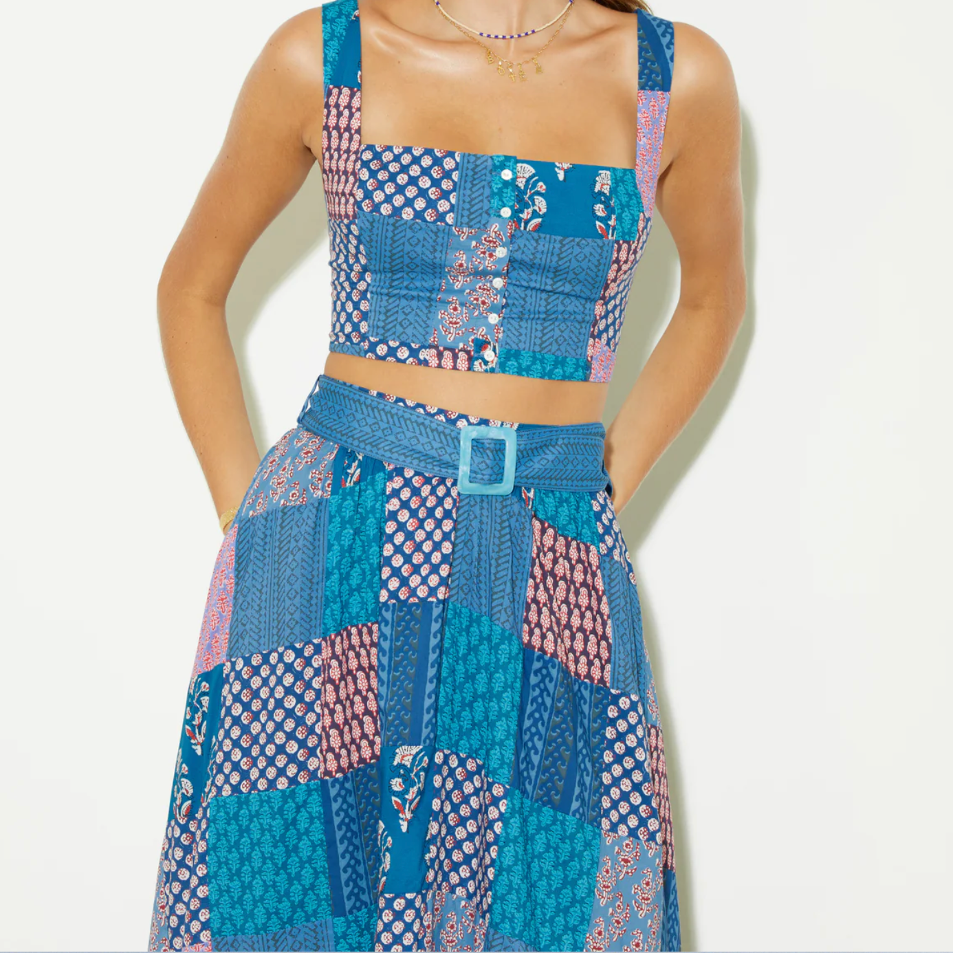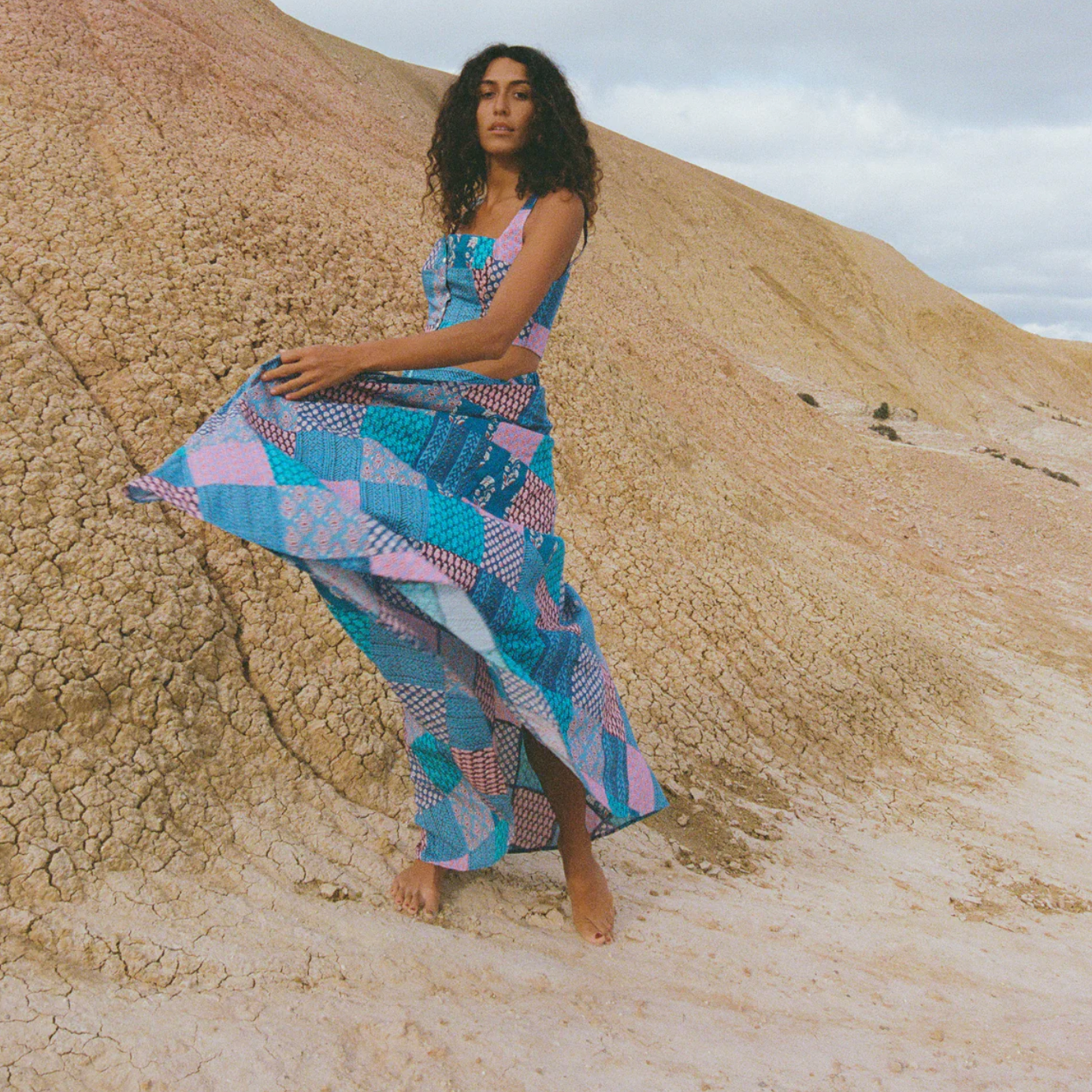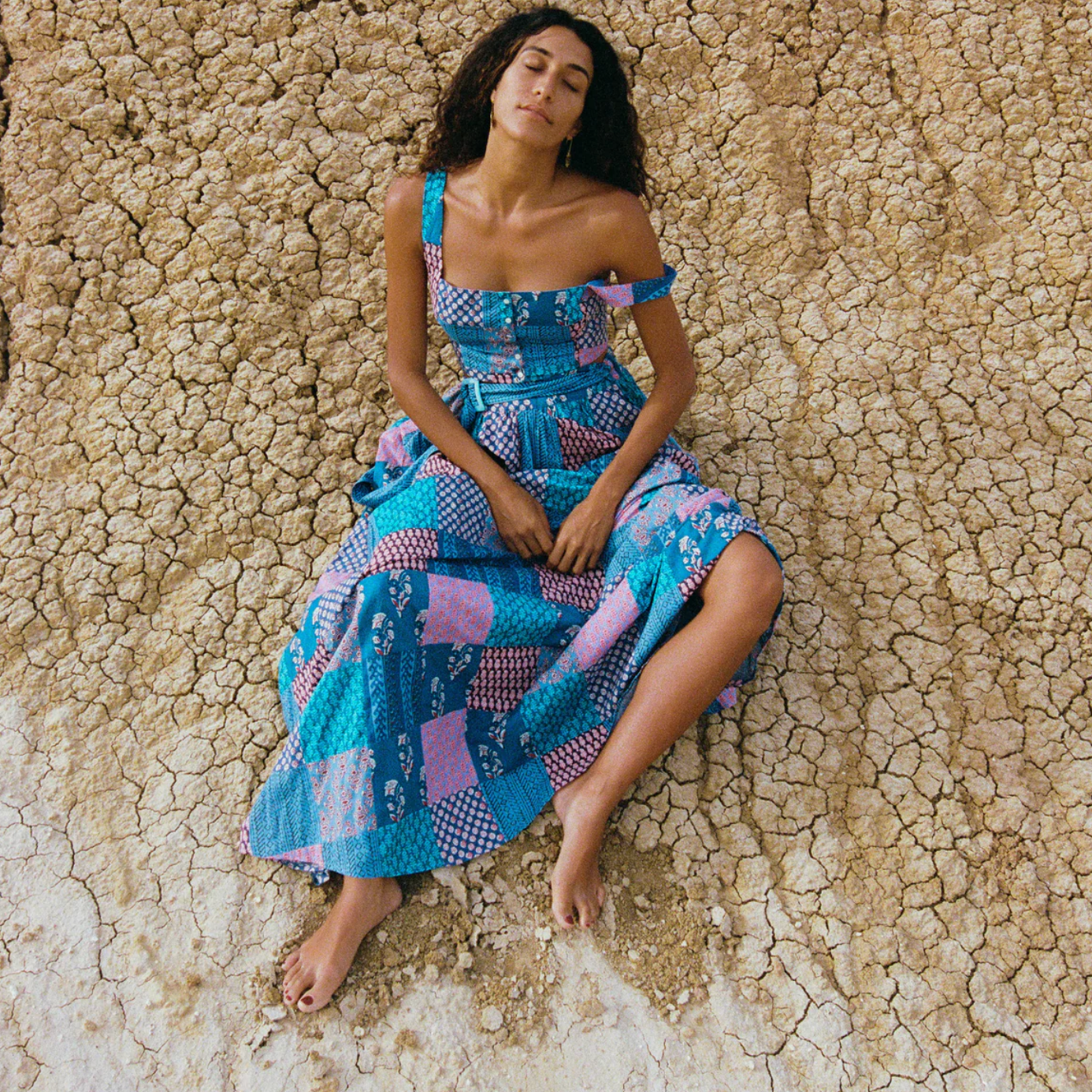 Lovers of flea markets and all things artisanal craft are sure to resonate with the Cedella story, a cotton patchwork of ditsy prints in an earthy swatch of seas greens, indigo and rosy madder highlights.
