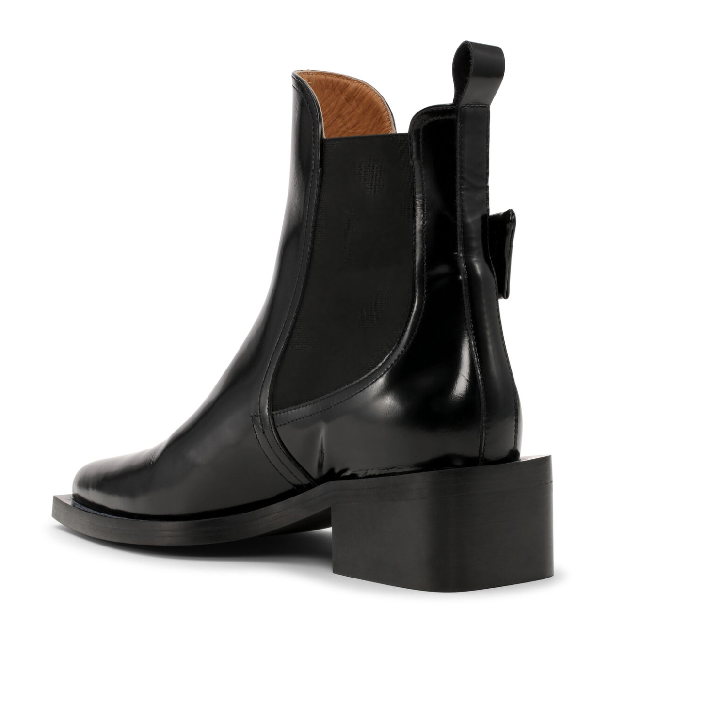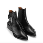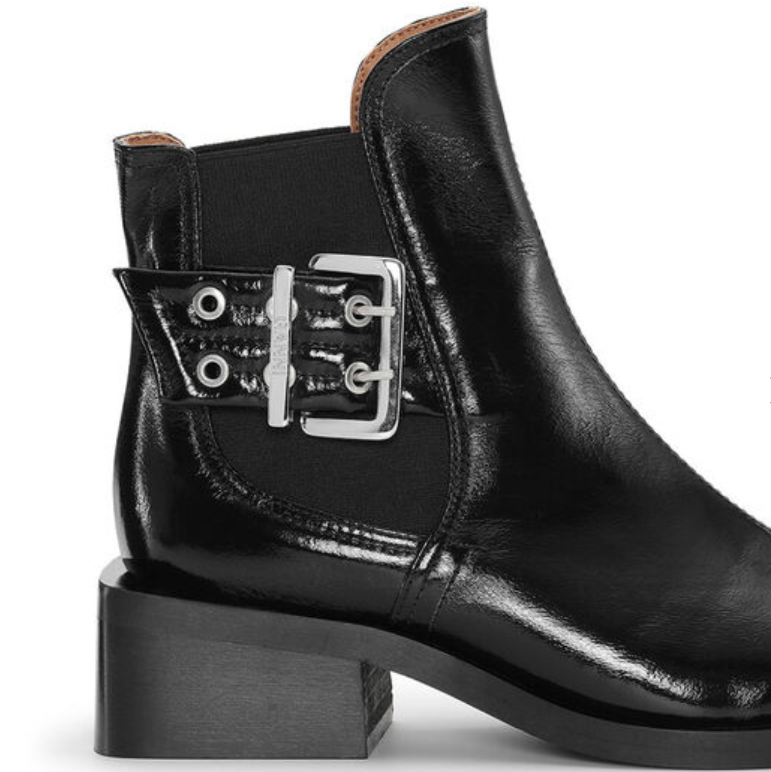 These Black Chunky Buckle Chelsea Boots are made from a blend of recycled polyester. The boots feature large metallic buckles with engraved GANNI logos, eyelet details, pull tab, block heels, pointed toes and elastic panels.