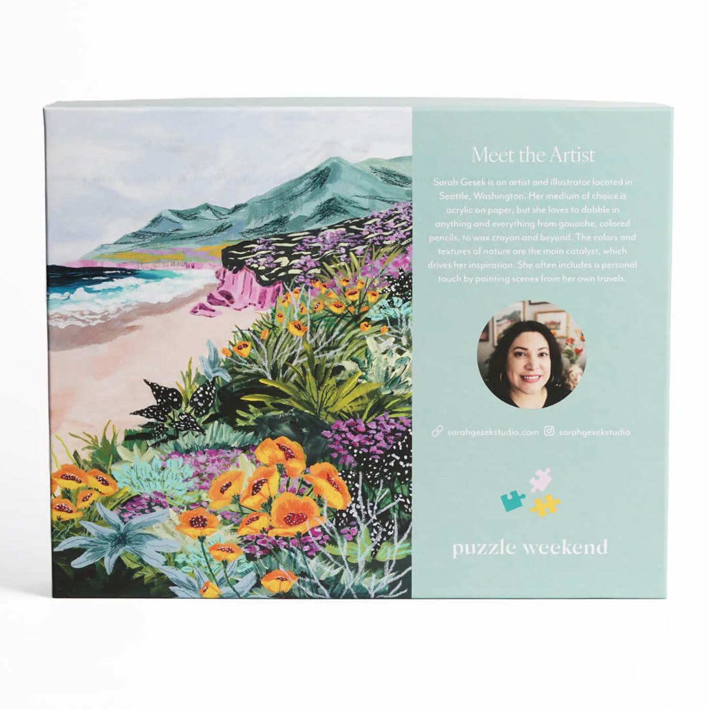 Take a spring retreat all year long with Coastal Bluffs. Enjoy the tranquil Big Sur coast, as depicted by the ever so talented Sarah Gesek. From the crashing waves and rolling hills, to the vibrantly colored wildflowers of the California coast, this 1000 piece Puzzle Weekend jigsaw puzzle reminds you that sunnier days are always close by.