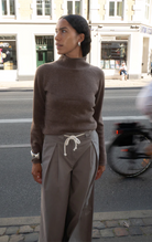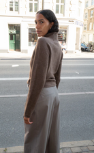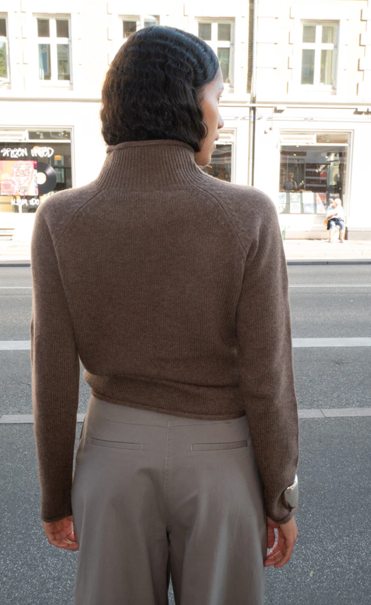 Long-sleeve high-neck knit in Espresso Brown. Both elegant and classic fit. Rib knitted neck. Slips over head to be worn.