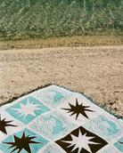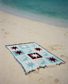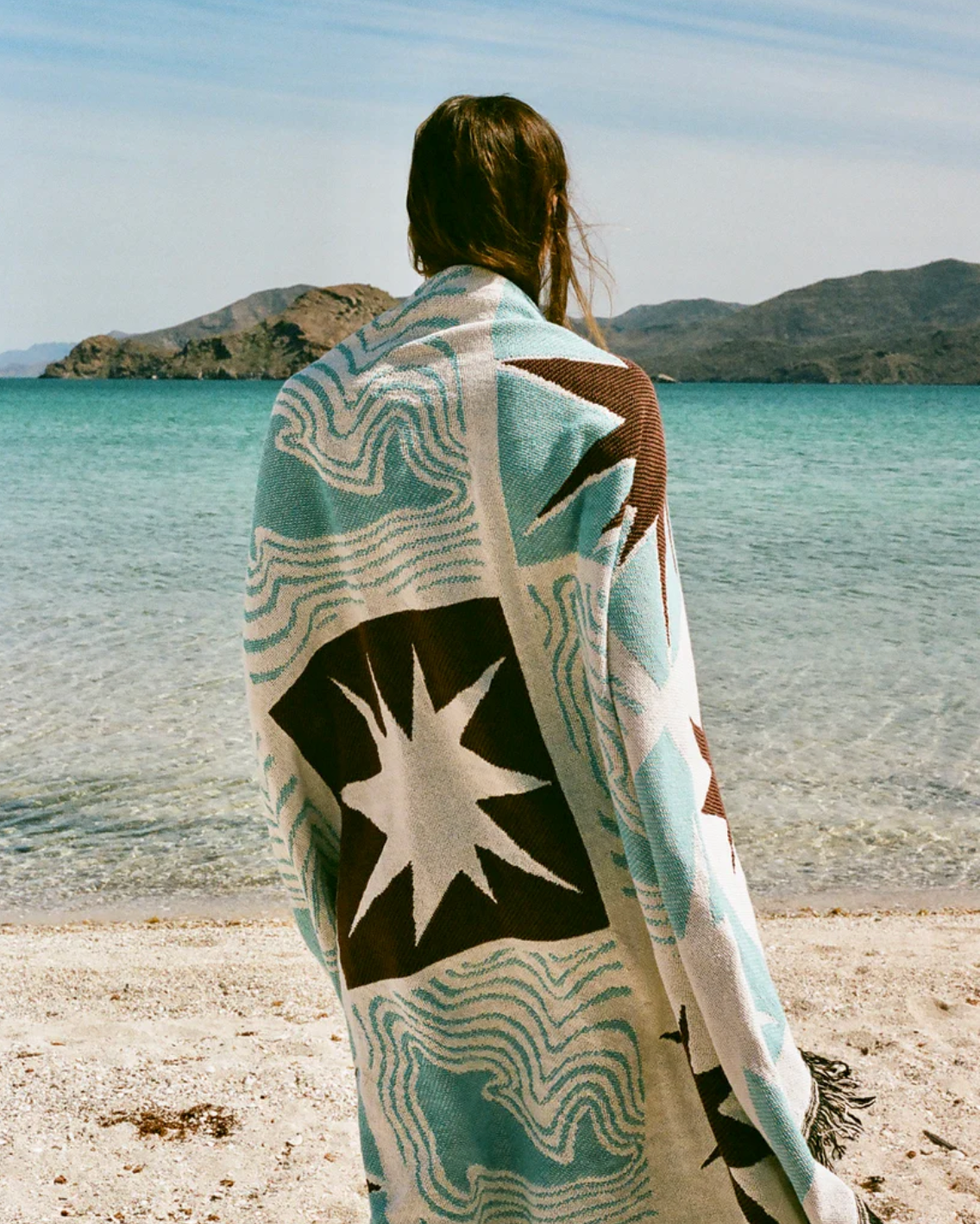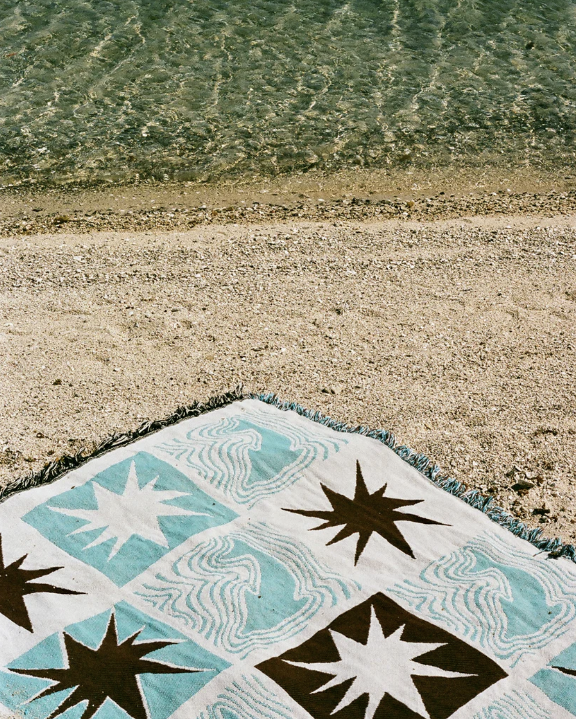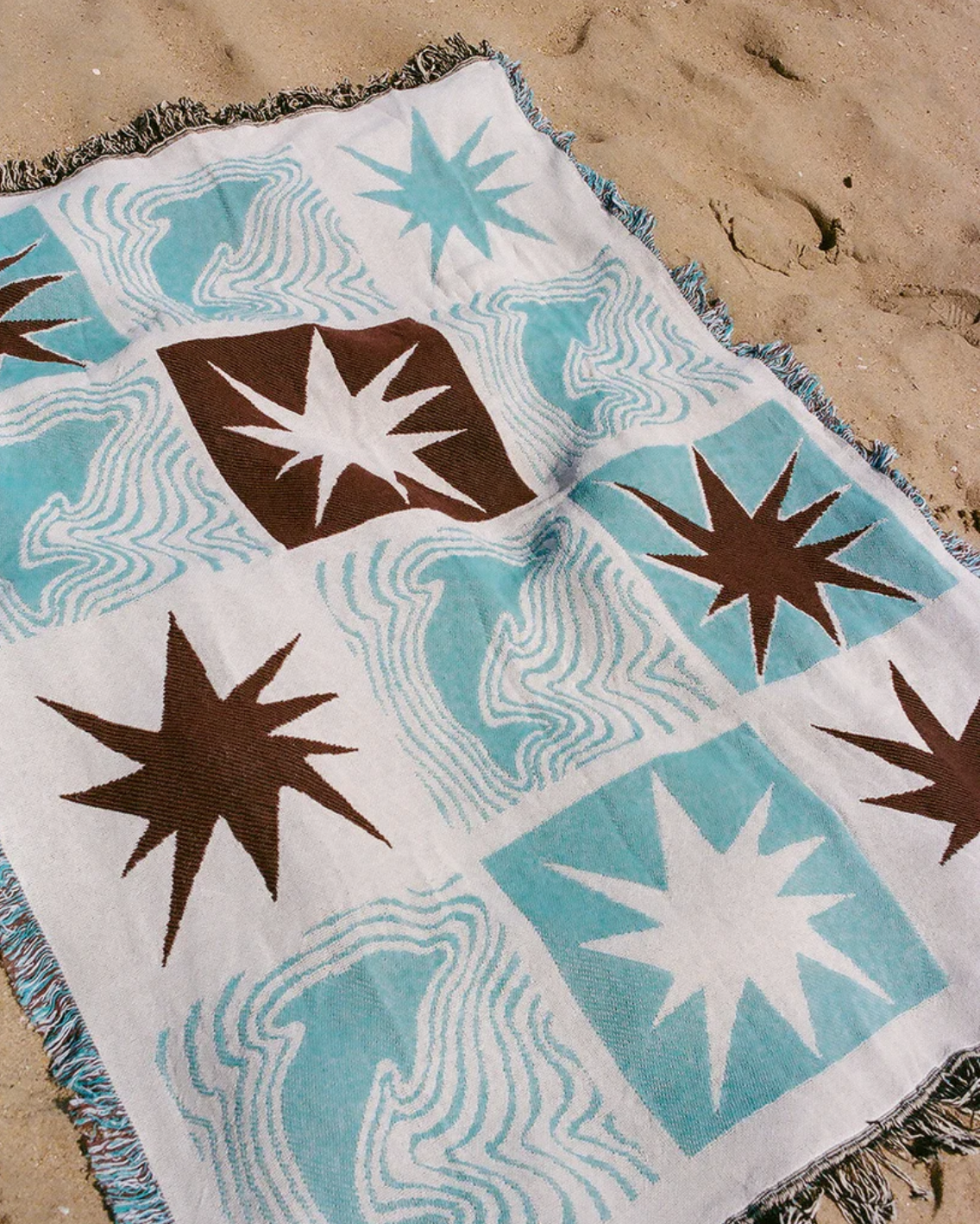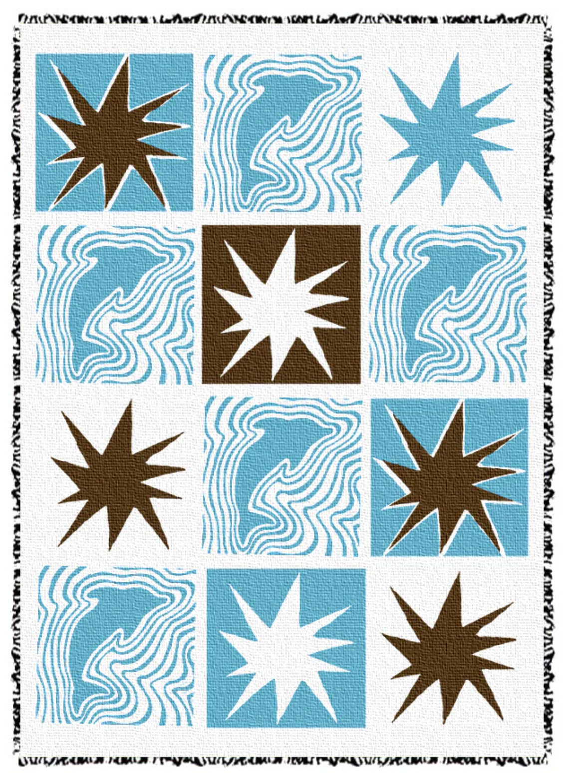 A playful design in natural white, chocolate brown and turquoise. Perfect for your couch, bedroom, outdoor trips or picnics! Spun and woven in the USA.