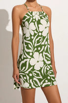 In soft and breezy crinkle rayon, the Diletta Mini Dress in Pavito Foral Olive featurs a relaxed silhouette, high gathered neckline and thin straps designed to cross over and tie at the back. The elasticated back waist offers easy wear and gives way to a relaxed, easy wearing mini skirt.