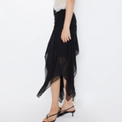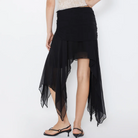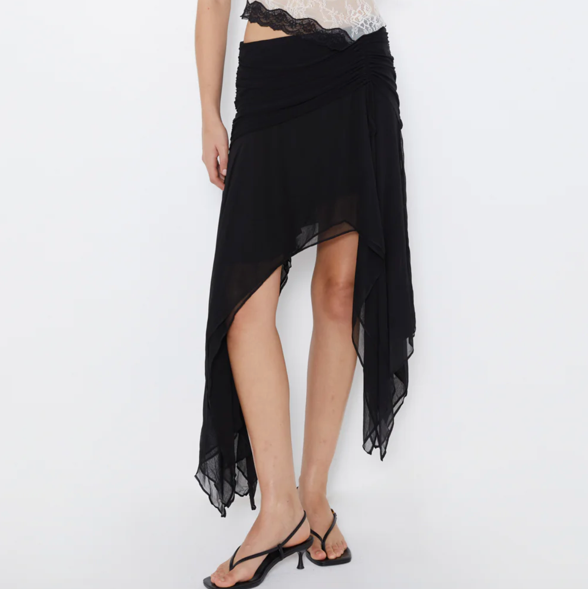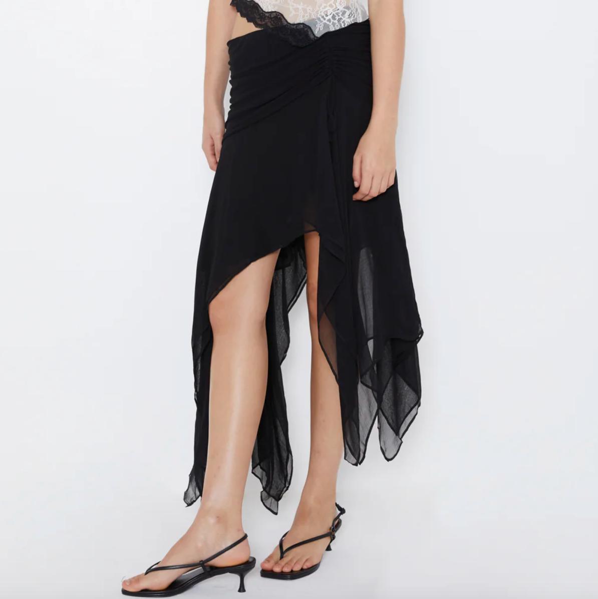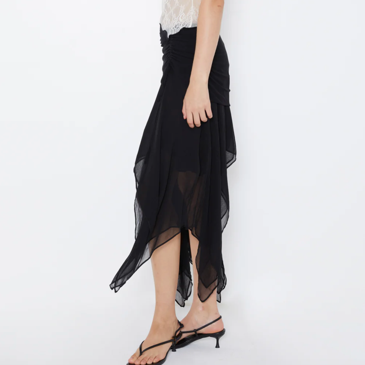 The BEC + BRIDGE Elzette Asym Midi Skirt is crafted from contrast fabrics in a flattering silhouette. Designed to sit on the low waist, the skirt is fitted at the hips before falling into a statement cascading, asymmetrical skirt finished with a rolled hem. The skirt features adjustable tie up detail at the side hip creating gathers. Styled with our Elzette Asym Tank.