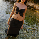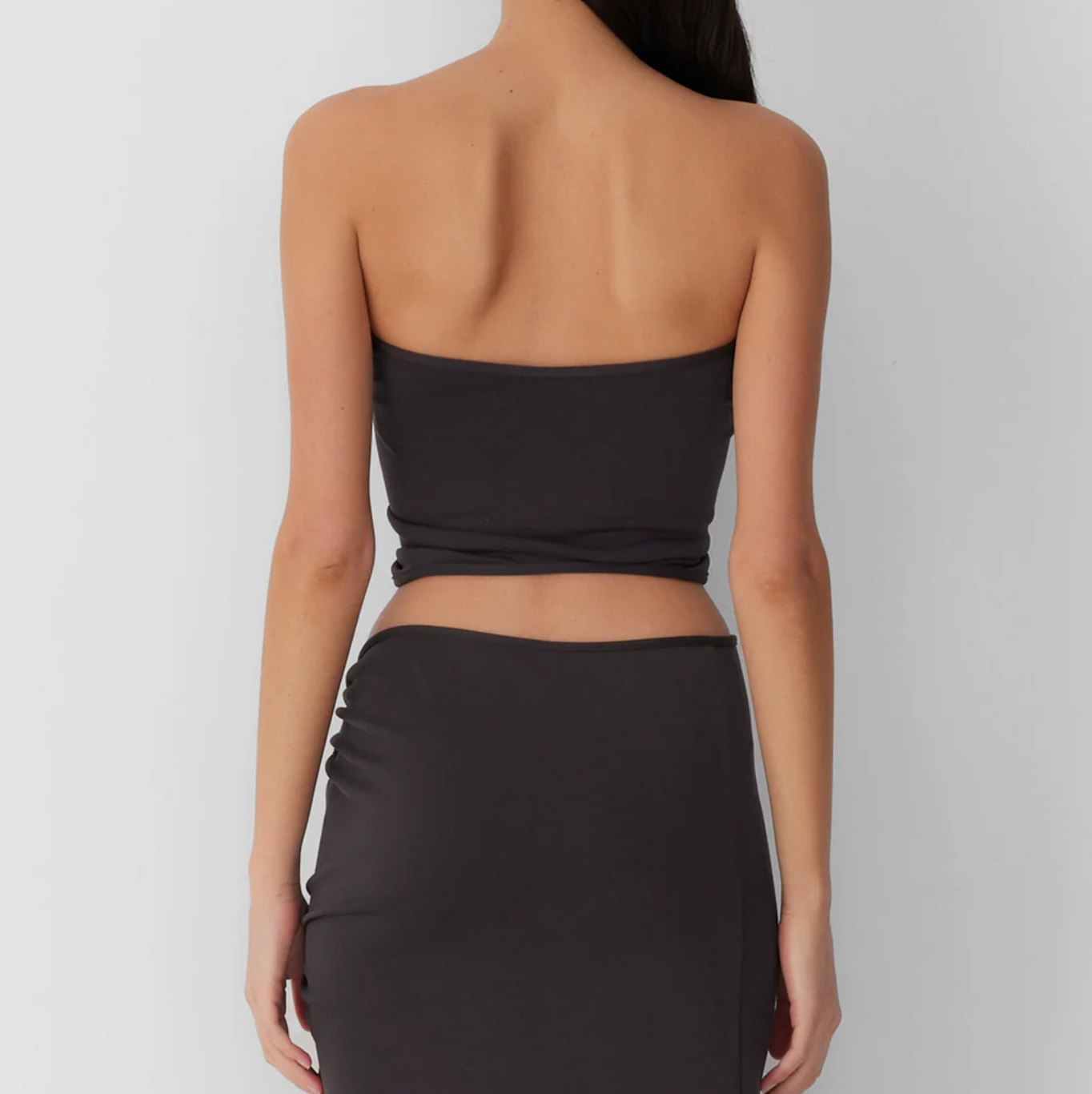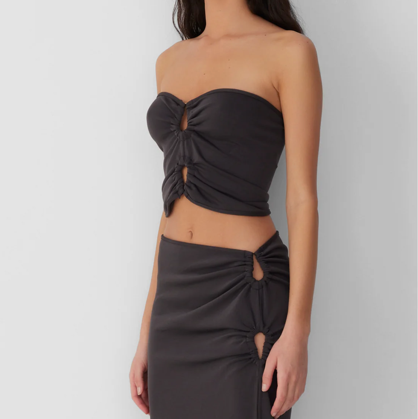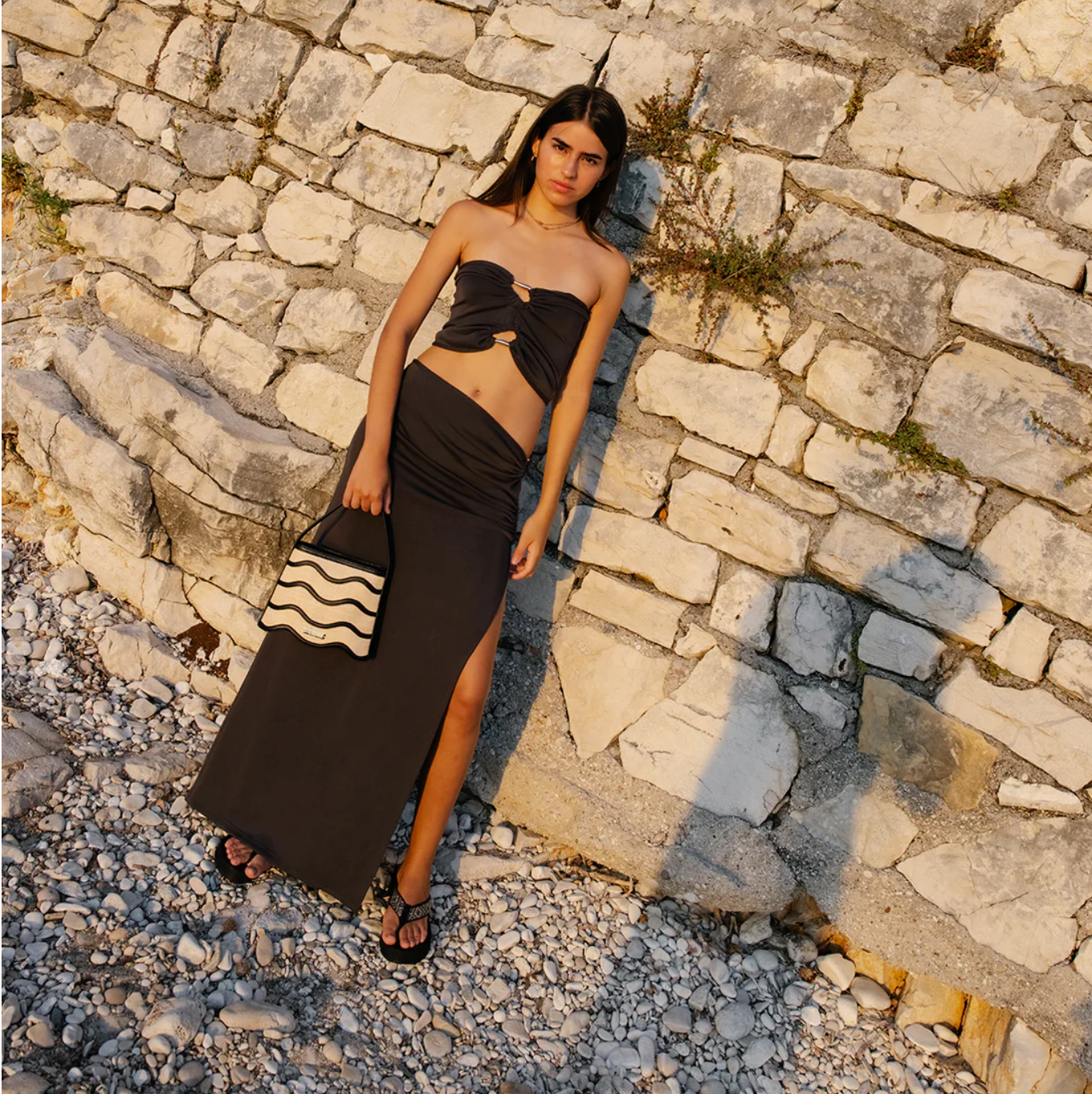 The Eos Bustier is a stretchy tube style top, in a slinky soft brushed jersey fabric. With feature keyhole detail, that can be worn to the front, back or side, your choice! Made for sun drenched days, pair with the matching Eos Maxi Skirt for a resort look.