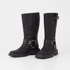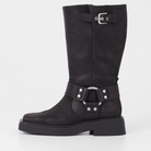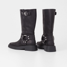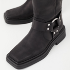 Eyra is the contemporary biker boots with harness details. The style is crafted in black oily nubuck, featuring boxy square toes, silver-toned harness details and a mid-rise shaft. The solid rubber outsoles measure 45mm.
