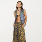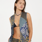 Vintage inspired quilted vest featuring patchwork panelling, front pockets and full button through front.
