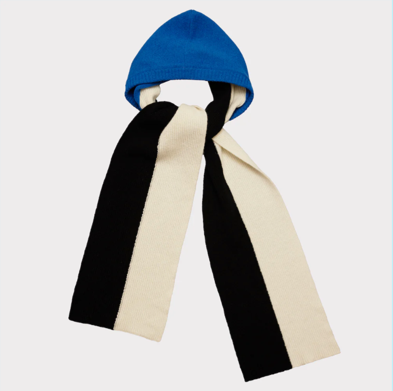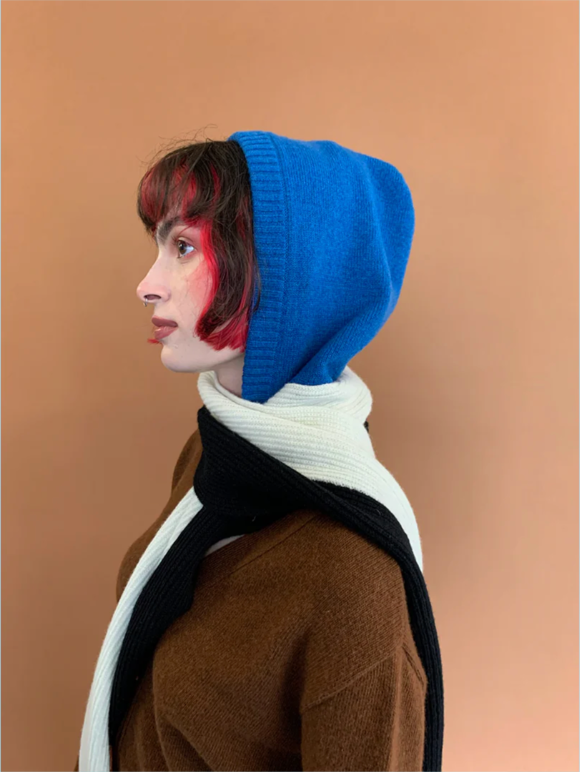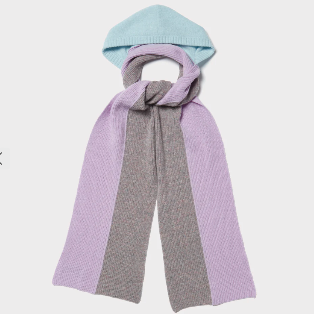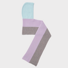 The arctic blue, lilac and light grey hooded scarf is made from pure lambswool and is handcrafted in Scotland by Shirley, Shelia, Finlay & Sharon.