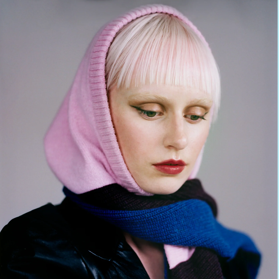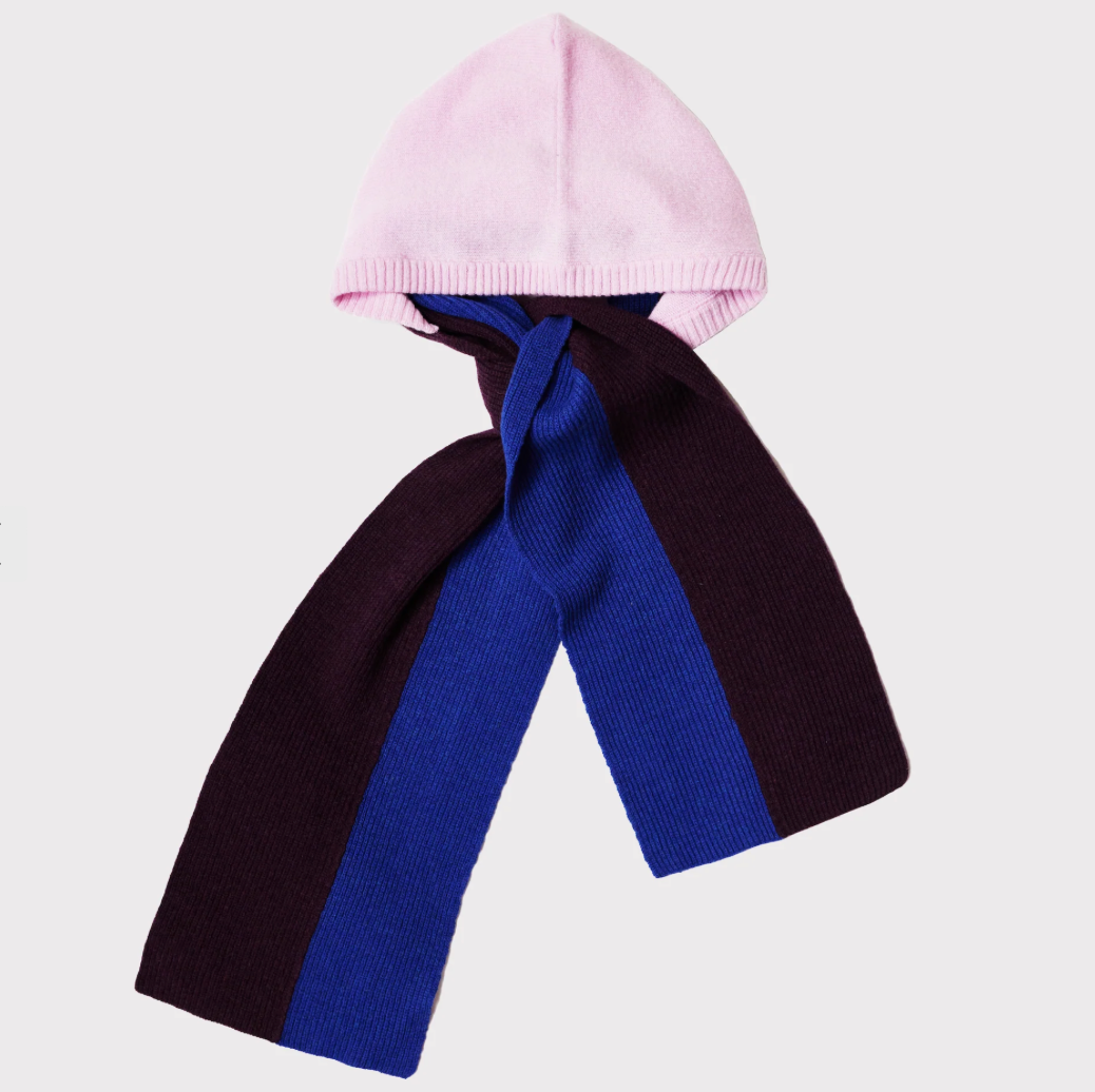 The pink hooded scarf is made from pure lambswool and is handcrafted in Scotland by Shirley, Shelia, Finlay & Sharon.