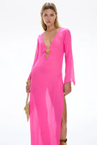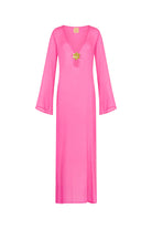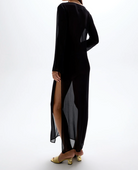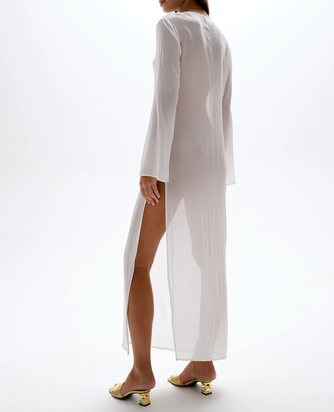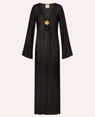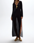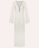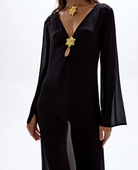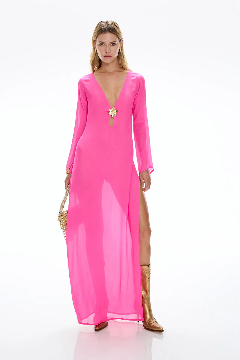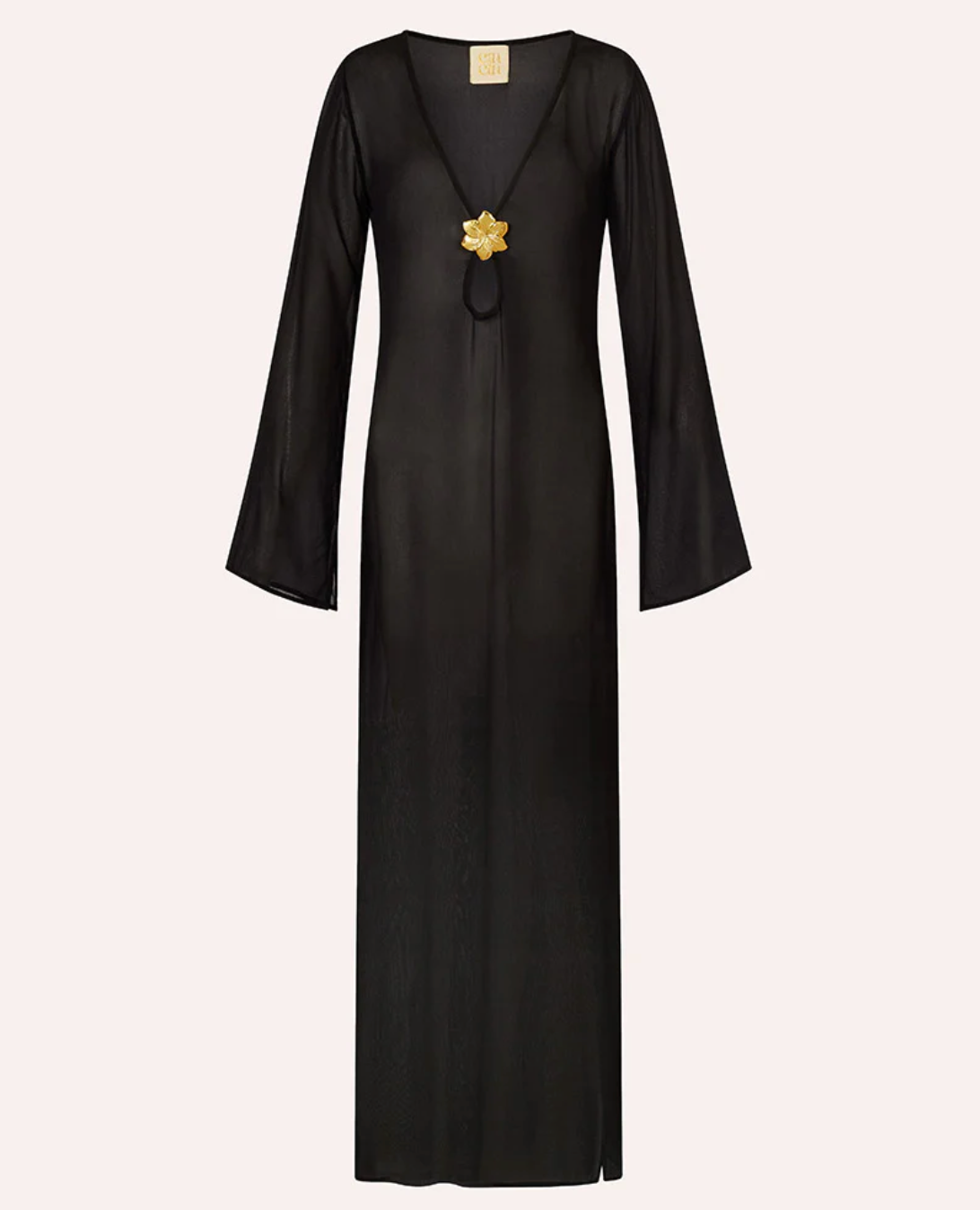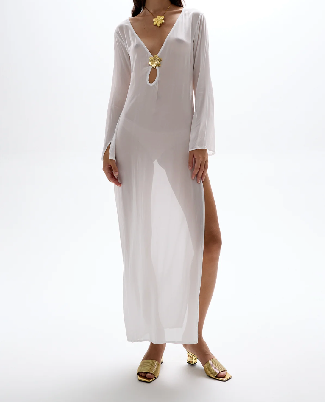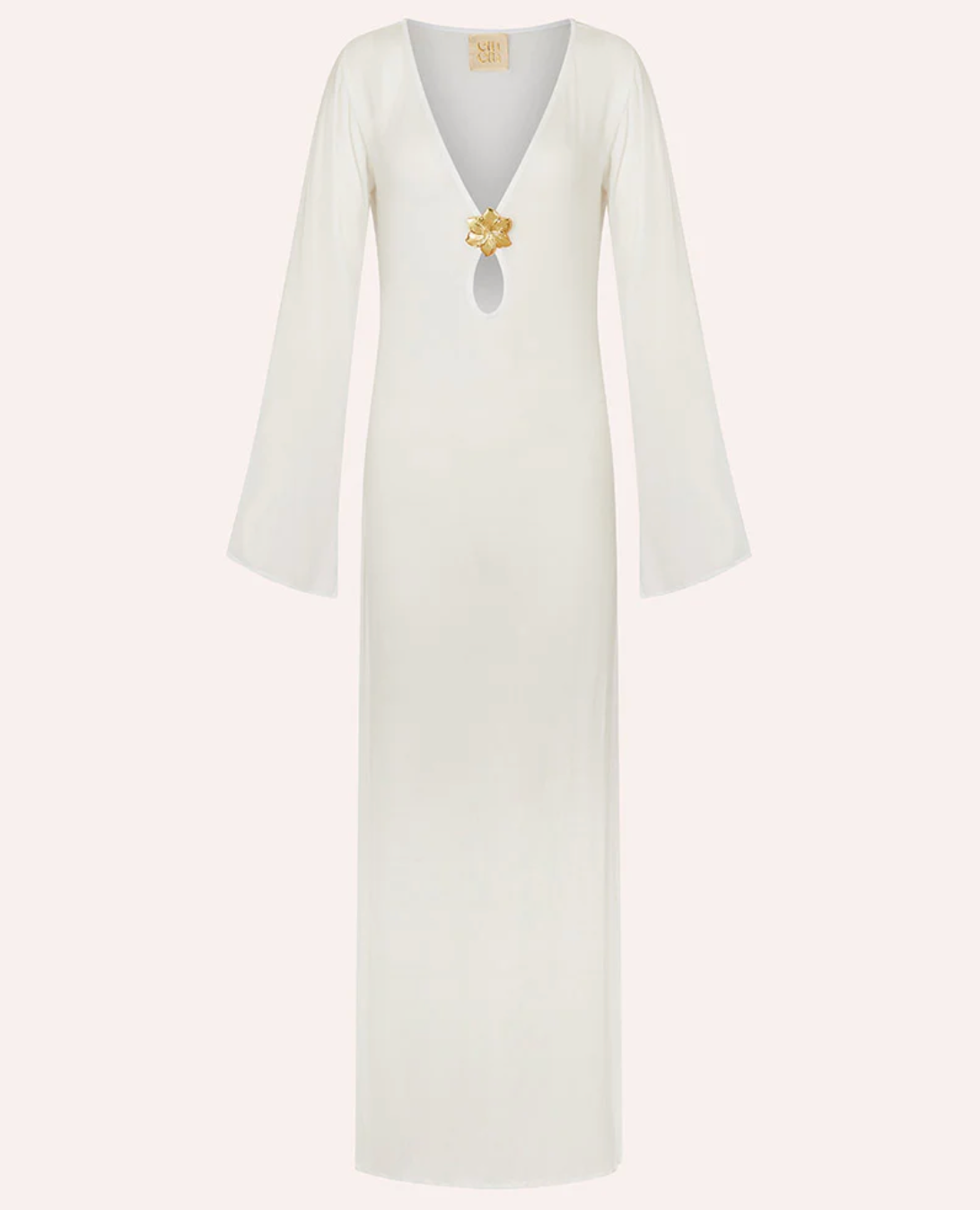 A column silhouette with keyhole detail and luxe hibiscus hardware.