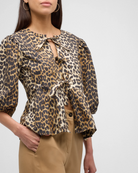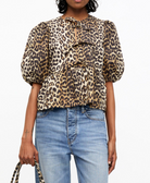 This Leopard Cotton Poplin Peplum Tie Blouse features an open round neckline with tie bands, puff sleeves with elastic edges and a peplum hem.